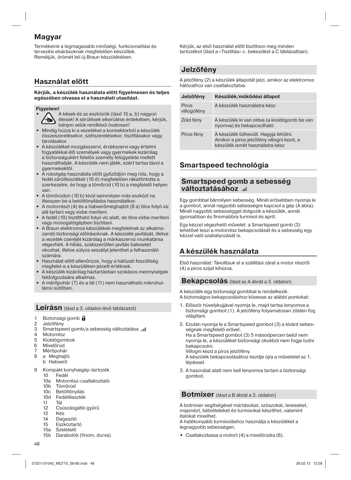 Magyar Termékeink a legmagasabb minőségi, funkcionalitási és tervezési elvárásoknak megfelelően készültek. Reméljük, örömét leli új Braun készülékében. Kérjük, az első használat előtt tisztítson meg minden tartozékot (lásd a «Tisztítás» c. bekezdést a C táblázatban). Jelzőfény Használat előtt Kérjük, a készülék használata előtt figyelmesen és teljes egészében olvassa el a használati utasítást. Figyelem! A kések és az eszközök (lásd 15 a, b) nagyon élesek! A sérülések elkerülése érdekében, kérjük, bánjon velük rendkívül óvatosan!