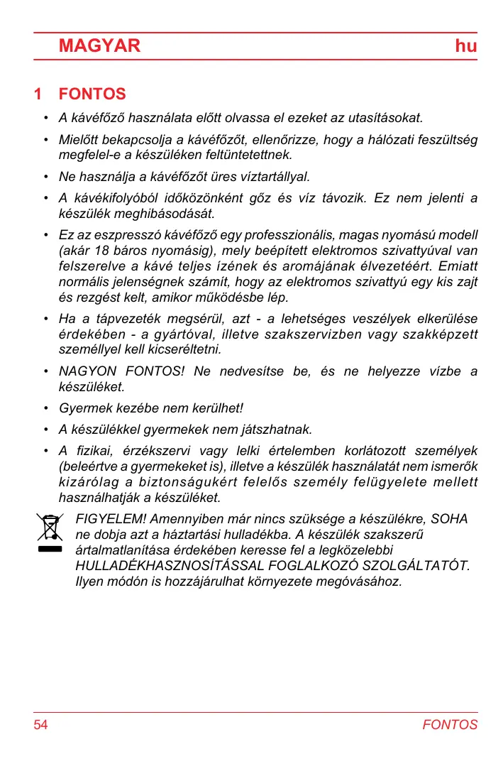 MAGYAR hu FONTOS A kävéf6z6 hasznélata elôtt olvassa el ezeket az utasitésokat. Mielôtt bekapcsolja a kävéfôzôt, ellen6rizze, hogy a hälézati feszültség megfelel-e a készüléken feltüntetettnek. Ne hasznälja a kävéfôzôt üres viztartällyal. A kävékifolyébl idéküzünként g6z és viz tâvozik. Ez nem jelenti a készülék meghibäsodäsät. EZz az eszpresszé kävéf6z6 egy professzionälis, magas nyomäsü modell (akär 18 béros nyomésig), mely beépitett elektromos szivattyüval van felszerelve a kävé teljes izének és aromäjänak élvezetéért. Emiatt normälis jelenségnek szämit, hogy az elektromos szivattyü egy kis zajt és rezgést kelt, amikor mükôdésbe lép. Ha a tâpvezeték megsérül, azt - a lehetséges veszélyek elkerülése érdekében - a gyärtéval, illetve szakszervizben vagy szakképzett személlyel kell kicseréltetni. NAGYON FONTOS! Ne nedvesitse be, és ne helyezze vizbe a készüléket. Gyermek kezébe nem kerülhet! A készülékkel gyermekek nem jâtszhatnak. A fizikai, érzékszervi vagy lelki értelemben korlâtozott személyek (beleértve a gyermekeket is), illetve a készülék hasznälatät nem ismerôk kizärélag a biztonsägukért felelés személy felügyelete mellett hasznälhatjäk a készüléket. x FIGYELEMI! Amennyiben mâr nincs szüksége a készülékre, SOHA ne dobja azt a häztartäsi hulladékba. À készülék szakszerü = értalmatlanitasa érdekében keresse fel a legkôzelebbi HULLADÉKHASZNOSITASSAL FOGLALKOZÔ SZOLGALTATÔT. llyen médôn is hozzäjärulhat kôrnyezete megôväséhoz.