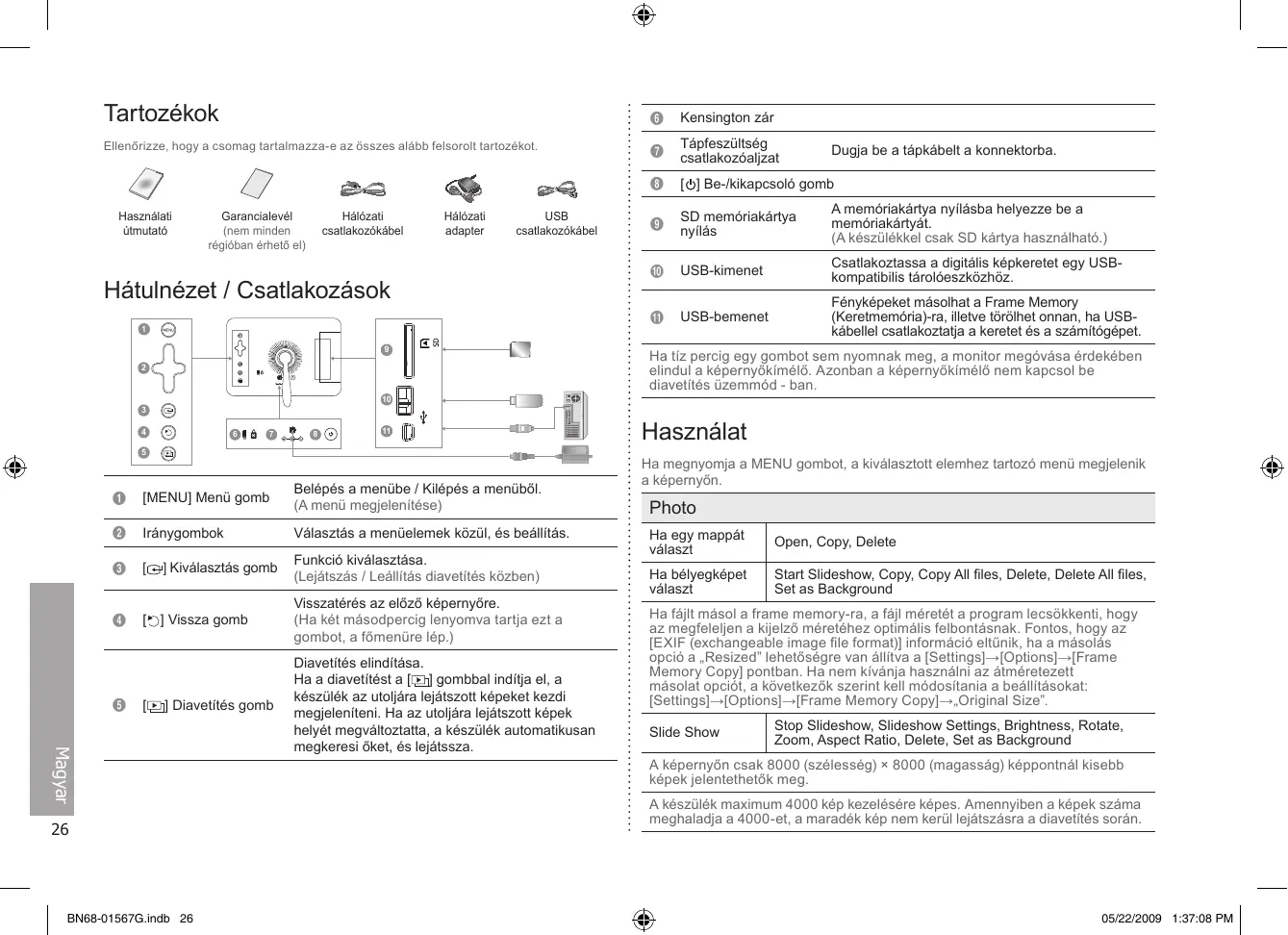 Settings ? A csatiakoztatott külsé 9 © téroléeszkôztnemismerifela | CR crotet szamitégéoh Language, Brightness, Auto Fit Portrait Photo, fotékeret. satiakoztassa à fotékeretet szämitégéphez, Options Frame Memory Copy és ellenérizze a mükädési llapotot. ; | Nagy felbontés vagy nagy féjméret esetén Preference na tone Sogeon Saver, Home Background, na 9EKEZ6 | etat eg ideig, mire a kép megjelenk a : képernyën Update/Reset | Firmware Update, Reset Settings, Product Information ue Müszaki leiras A firmware frissitése = Müszaki adatok Müszaki leiräs ERREURS Modelinév SPE-T1E SPE-7IES Digitälis fotékeret, Fi frissitéfäil, SD kärt hordozhaté USB Digi li 10 «eret, Firmware frissftéfäjl ya vagy hordozhat Ke Tipus 7 inch (17 cm) TFT (analôg) Frissités Felbontés | 480 x 234 Kérjük, lâtogasson el a http://www.samsung.com honlapra, és a letôltések Tämogatott formätumok ee es CMYK JPEG nem © hivatkozäsra kattintva tôlse le az USB-monitorhoz tartozé termékszoftvert s {firmware-t) a modell szämänak megadäsäval Beépitett memôria 120 MB 168 © Tältse le a megfelelé firmware (termékszoftver, és tômôritse ki. Use Gazdagép (USB 1.1) | Gazdagép (USB 2.0) l'Eszkëz (USB 2.0) | /Eszkôz (USB 2.0 © Mésoli ât a litémôrien fl (is) egy SD-kéryére, vagy egy USB- szk6z ( ) Szk6Z ( ) memériâra, és csatiakoztassa azt a Digital Photo Frame-hez. Névieges Vélassza ki a [Seti Update/Reset [Fi Update] lehetéséget teljesimény | Külsô egyenéramü adapter (12 V) © Välassza ki a [Setings]{Update/Reset] {Firmware Update] lehetôséget. Tapleszütség | Küsô © Afrissités végeztével kapcsolja ki, majd be a Digital Photo Frame-et Teljesitmény | Normäl üzemmédban : 4.8 W À termékszoftver verzidjät leellenérizheti a [Settings]—[Update/Reset}_> felvétel Kikapcsolt éllapotban : kevesebb mint 1 W Product infc ti tbe [Product information] pontban & x mé) 217.5 mm x 156.5 mm x 43 mm eneral