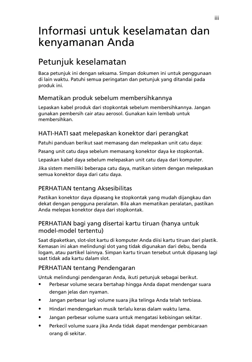 Seri Aspire Panduan Pengguna Generik © 2010 Hak Cipta Dilindungi Undang-Undang. Panduan Pengguna Generik Seri Aspire Edisi Pertama: 07/2010 PC Notebook Seri Aspire Nomor model: _____________________________________ Nomor seri: _______________________________________ Tanggal pembelian: ________________________________ Alamat pembelian: ________________________________ iii Informasi untuk keselamatan dan kenyamanan Anda Petunjuk keselamatan Baca petunjuk ini dengan seksama. Simpan dokumen ini untuk penggunaan di lain waktu. Patuhi semua peringatan dan petunjuk yang ditandai pada produk ini. Mematikan produk sebelum membersihkannya Lepaskan kabel produk dari stopkontak sebelum membersihkannya. Jangan gunakan pembersih cair atau aerosol. Gunakan kain lembab untuk membersihkan. HATI-HATI saat melepaskan konektor dari perangkat Patuhi panduan berikut saat memasang dan melepaskan unit catu daya: Pasang unit catu daya sebelum memasang konektor daya ke stopkontak. Lepaskan kabel daya sebelum melepaskan unit catu daya dari komputer. Jika sistem memiliki beberapa catu daya, matikan sistem dengan melepaskan semua konektor daya dari catu daya. PERHATIAN tentang Aksesibilitas Pastikan konektor daya dipasang ke stopkontak yang mudah dijangkau dan dekat dengan pengguna peralatan. Bila akan mematikan peralatan, pastikan Anda melepas konektor daya dari stopkontak. PERHATIAN bagi yang disertai kartu tiruan (hanya untuk model-model tertentu) Saat dipaketkan, slot-slot kartu di komputer Anda diisi kartu tiruan dari plastik. Kemasan ini akan melindungi slot yang tidak digunakan dari debu, benda logam, atau partikel lainnya. Simpan kartu tiruan tersebut untuk dipasang lagi saat tidak ada kartu dalam slot. PERHATIAN tentang Pendengaran Untuk melindungi pendengaran Anda, ikuti petunjuk sebagai berikut. Perbesar volume secara bertahap hingga Anda dapat mendengar suara dengan jelas dan nyaman.