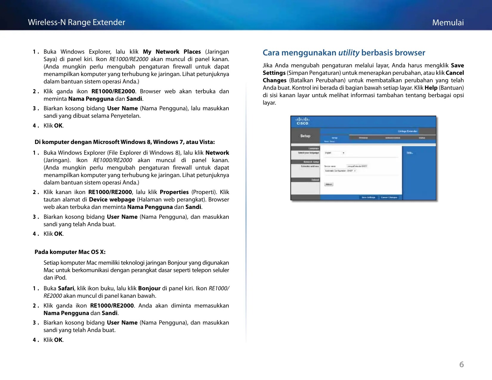 Wireless-N Range Extender 1 . Buka Windows Explorer, lalu klik My Network Places (Jaringan Saya) di panel kiri. Ikon RE1000/RE2000 akan muncul di panel kanan. (Anda mungkin perlu mengubah pengaturan firewall untuk dapat menampilkan komputer yang terhubung ke jaringan. Lihat petunjuknya dalam bantuan sistem operasi Anda.) 2 . Klik ganda ikon RE1000/RE2000. Browser web akan terbuka dan meminta Nama Pengguna dan Sandi. 3 . Biarkan kosong bidang User Name (Nama Pengguna), lalu masukkan sandi yang dibuat selama Penyetelan.