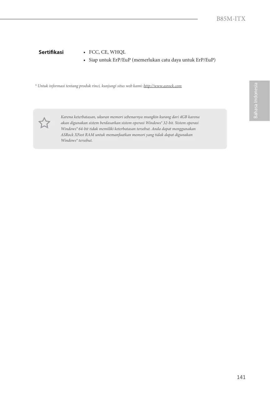 Karena keterbatasan, ukuran memori sebenarnya mungkin kurang dari 4GB karena akan digunakan sistem berdasarkan sistem operasi Windows® 32-bit. Sistem operasi Windows® 64-bit tidak memiliki keterbatasan tersebut. Anda dapat menggunakan ASRock XFast RAM untuk memanfaatkan memori yang tidak dapat digunakan Windows® tersebut.