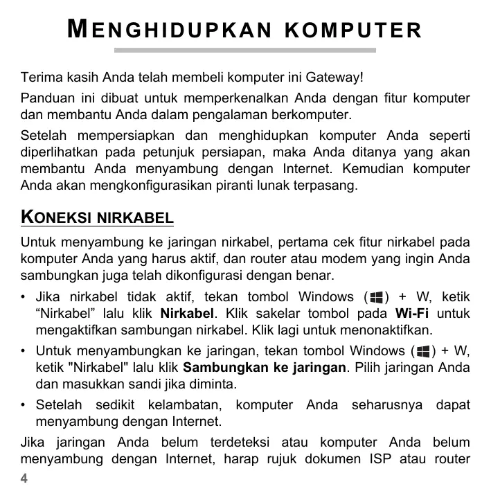 Hak cipta © 2012. Hak cipta dilindungi undang-undang. Gateway NE56R/NE51B Manual Pengguna Edisi Pertama: 20 Juli 2012 Kunjungi registration.gateway.com untuk mendapat manfaat sebagai seorang pelanggan Gateway. Pendapat: Semua diagram hanya digunakan sebagai referensi. Desain sesungguhnya mungkin berbeda. Daftar Isi - 3 MENGHIDUPKAN KOMPUTER Terima kasih Anda telah membeli komputer ini Gateway! Panduan ini dibuat untuk memperkenalkan Anda dengan fitur komputer dan membantu Anda dalam pengalaman berkomputer. Setelah mempersiapkan dan menghidupkan komputer Anda seperti diperlihatkan pada petunjuk persiapan, maka Anda ditanya yang akan membantu Anda menyambung dengan Internet. Kemudian komputer Anda akan mengkonfigurasikan piranti lunak terpasang. KONEKSI NIRKABEL Untuk menyambung ke jaringan nirkabel, pertama cek fitur nirkabel pada komputer Anda yang harus aktif, dan router atau modem yang ingin Anda sambungkan juga telah dikonfigurasi dengan benar.