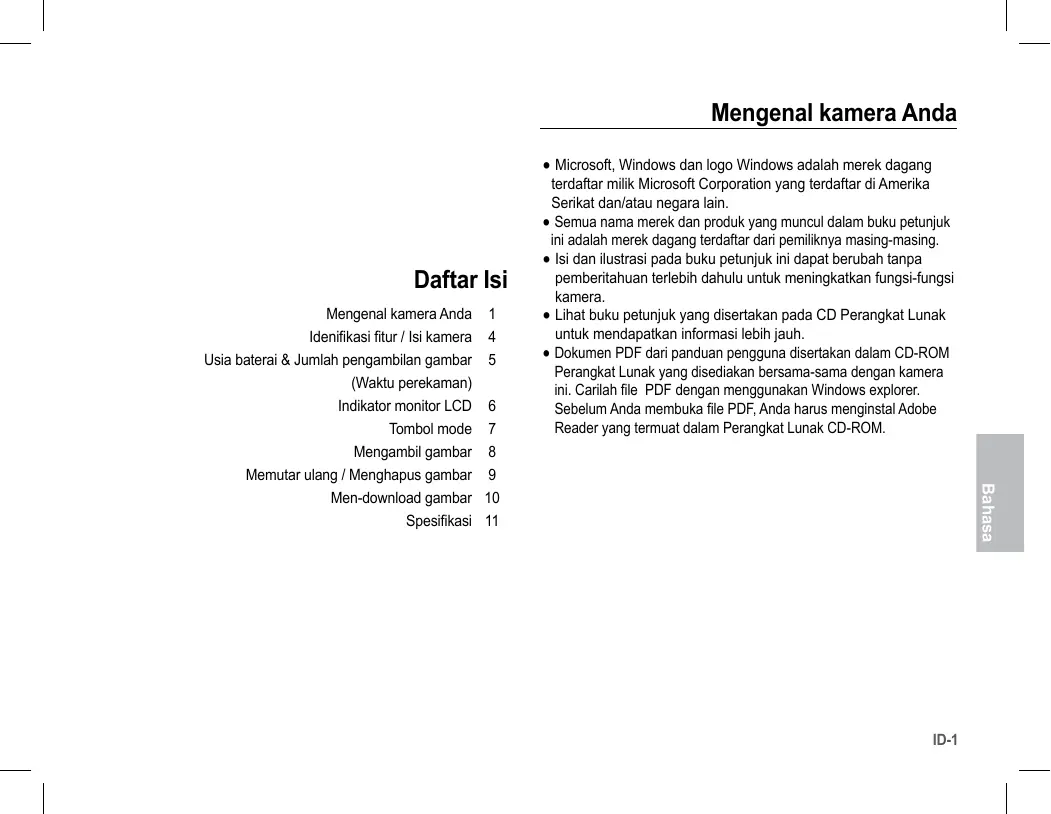 CH-16 Mengenal kamera Anda Daftar Isi Bahasa Mengenal kamera Anda 1 Idenifikasi fitur / Isi kamera 4 Usia baterai & Jumlah pengambilan gambar 5 (Waktu perekaman) Indikator monitor LCD 6 Tombol mode 7 Mengambil gambar 8 Memutar ulang / Menghapus gambar 9 Men-download gambar 10 Spesifikasi 11 åMicrosoft, Windows dan logo Windows adalah merek dagang terdaftar milik Microsoft Corporation yang terdaftar di Amerika Serikat dan/atau negara lain. åSemua nama merek dan produk yang muncul dalam buku petunjuk ini adalah merek dagang terdaftar dari pemiliknya masing-masing. å Isi dan ilustrasi pada buku petunjuk ini dapat berubah tanpa pemberitahuan terlebih dahulu untuk meningkatkan fungsi-fungsi kamera. å Lihat buku petunjuk yang disertakan pada CD Perangkat Lunak untuk mendapatkan informasi lebih jauh. å Dokumen PDF dari panduan pengguna disertakan dalam CD-ROM Perangkat Lunak yang disediakan bersama-sama dengan kamera ini. Carilah file PDF dengan menggunakan Windows explorer. Sebelum Anda membuka file PDF, Anda harus menginstal Adobe Reader yang termuat dalam Perangkat Lunak CD-ROM. ID- Mengenal kamera Anda BAHAYA PERINGATAN BAHAYA menunjukkan situasi yang dapat memberikan risiko bahaya, yang jika tidak dihindari, dapat berakibat kepada kematian atau luka yang serius. PERINGATAN menunjukkan adanya situasi yang dapat menjadi berbahaya yang, jika tidak dihindari, akan mengakibatkan kematian atau cedera serius. Jangan mencoba mengubah kamera ini dengan cara apa pun. Hal tersebut dapat mengakibatkan kebakaran, cedera, sengatan listrik atau kerusakan parah pada Anda atau kamera Anda. Pemeriksaan internal, perawatan dan perbaikan hanya boleh dilakukan oleh penyalur atau pusat Servis Kamera Samsung. Jika ada cairan atau benda asing memasuki kamera, jangan gunakan kamera. Matikan kamera, dan lepaskan sumber daya listrik. Anda harus menghubungi penyalur Anda atau Pusat Layanan Kamera Samsung. Hentikan penggunaan kamera karena hal tersebut dapat menyebabkan kebakaran atau sengatan listrik. Demi keselamatan, simpanlah produk dan aksesorinya jauh dari jangkauan anak-anak atau hewan untuk mencegah kecelakaan, misalnya: - Tertelannya baterai atau aksesori kamera yang berukuran kecil. Jika kecelakaan seperti ini terjadi, segeralah dapatkan bantuan dari dokter. - Ada kemungkinan cedera akibat bagian kamera yang dapat bergerak. Jangan gunakan produk ini di dekat gas yang mudah terbakar atau mudah meledak, karena hal ini dapat meningkatkan risiko ledakan. Baterai dan kamera dapat menjadi panas jika digunakan dalam waktu lama dan dapat menyebabkan kamera tidak berfungsi dengan baik. Jika hal ini terjadi, biarkan kamera selama beberapa menit untuk mendinginkannya. Jangan memasukkan atau menjatuhkan benda asing yang terbuat dari logam atau yang mudah meledak ke dalam kamera melalui titik aksesnya, misalnya lubang kartu memori dan ruang baterai. Hal ini dapat menyebabkan kebakaran atau sengatan listrik. Jangan meninggalkan kamera ini di tempat yang dapat terkena suhu tinggi, seperti kendaraan yang tertutup rapat, sinar matahari langsung, atau tempat lain yang suhunya dapat berubah secara ekstrem. Suhu yang tinggi dapat mempengaruhi komponen bagian dalam dari kamera dan dapat mengakibatkan kebakaran. Jangan mengoperasikan kamera ini dengan tangan yang basah. Hal ini dapat menimbulkan risiko sengatan listrik. ID- Jangan menggunakan lampu kilat di dekat orang atau binatang. Memposisikan lampu kilat terlalu dekat kepada mata dari obyek foto Anda dapat menyebabkan kerusakan pada pengelihatan. Jika sedang digunakan, jangan tutupi kamera atau pengisi daya. Hal ini dapat menimbulkan panas dan merusak bentuk badan kamera atau menyebabkan kebakaran. Gunakanlah selalu kamera dan aksesorinya di tempat yang memiliki ventilasi udara yang memadai. Mengenal kamera Anda Awas AWAS menunjukkan adanya situasi yang dapat menjadi berbahaya yang, jika tidak dihindari, dapat mengakibatkan cedera kecil atau sedang. Keluarkan baterai jika kamera tidak akan digunakan dalam jangka waktu panjang. Jika tidak dilepaskan maka baterai dapat membocorkan cairan elektrolit yang bersifat korosif dan membuat kerusakan permanen pada kamera. Baterai yang bocor, terlalu panas, atau rusak dapat menyebabkan kebakaran atau cedera. - Gunakan baterai yang memiliki spesifikasi yang sesuai untuk kamera tersebut. - Jangan memicu hubungan pendek, memanaskan, atau membuang baterai ke api. - Jangan memasukkan baterai dengan polaritas terbalik. Berhati-hatilah untuk tidak menyentuh lensa atau penutup lensa agar terhindar dari kemungkinan pengambilan gambar yang buram dan kerusakan kamera. Jangan memasukkan kartu memori dalam arah yang salah. Besar kemungkinan komputer tidak dapat befungsi dengan baik jika sebuah konektor pin 20 tersambung ke dalam port USDB atau sebuah PC. Jangan sekali-kali menghubungkan konektor 20 pin ke pada port USB dari sebuah PC. Pastikan untuk memformat kartu memori jika kartu tersebut baru dibeli dan akan digunakan untuk pertama kalinya, jika kartu mengandung data yang tidak dikenal oleh kamera, atau jika kartu berisi gambar yang diambil dengan kamera lain. Sebelum menghadiri acara penting atau melakukan perjalanan, Anda harus memeriksa kondisi kamera. Samsung tidak bertanggung jawab atas malfungsi kamera. ID- Bahasa Jangan menyalakan lampu kilat ketika lampu sedang bersentuhan dengan tangan atau benda. Jangan menyentuh lampu kilat setelah menggunakannya secara terus menerus. Hal tersebut dapat menyebabkan luka bakar. Kartu kredit dapat mengalami kerusakan magnetik jika diletakkan di dekat kantung kamera. Hindari meletakkan kartu yang memiliki lapisan magnet di dekat penutup kamera. Idenifikasi fitur / Isi kamera Lampu status kamera Tombol Zoom T (Zoom digital) Tombol Zoom W (Thumbnail) Tombol E (Efek) Lubang tali kamera Tombol daya Tombol mode Lampu kilat Lampu pengatur waktu / sensor AF Tombol rana Terminal sambungan USB/AV Monitor LCD Lensa / Penutup lensa Mikrofon Pengeras suara Tombol Fn/Hapus Tombol Deteksi Wajah (FD) Tombol 5-fungs
