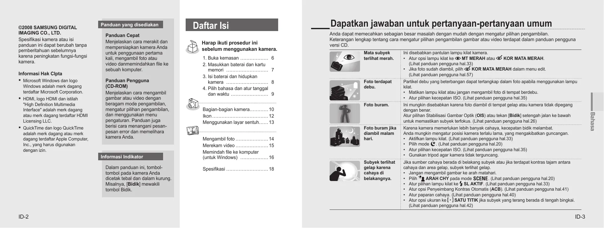 6!.!96& T.ZH-19 ©2008 SAMSUNG DIGITAL IMAGING CO., LTD. Spesifikasi kamera atau isi panduan ini dapat berubah tanpa pemberitahuan sebelumnya karena peningkatan fungsi-fungsi kamera. Informasi Hak CIpta Microsoft Windows dan logo Windows adalah merk dagang terdaftar Microsoft Corporation.