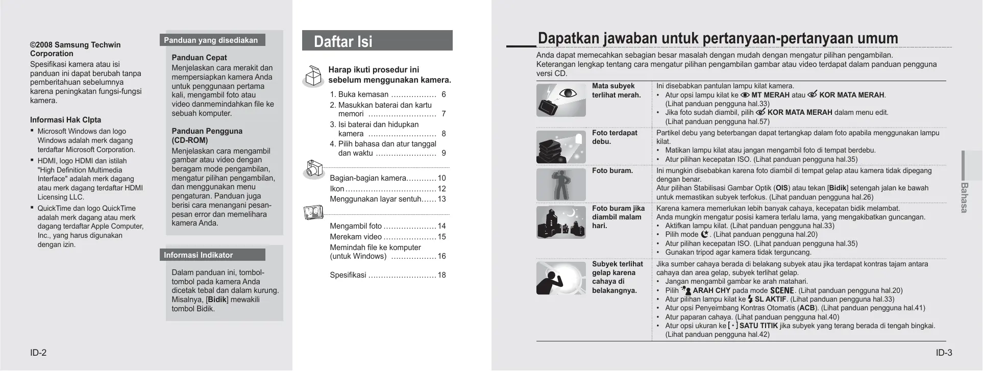 6!.!96& T.ZH-19 ©2008 Samsung Techwin Corporation Spesifikasi kamera atau isi panduan ini dapat berubah tanpa pemberitahuan sebelumnya karena peningkatan fungsi-fungsi kamera. Informasi Hak CIpta Microsoft Windows dan logo Windows adalah merk dagang terdaftar Microsoft Corporation.