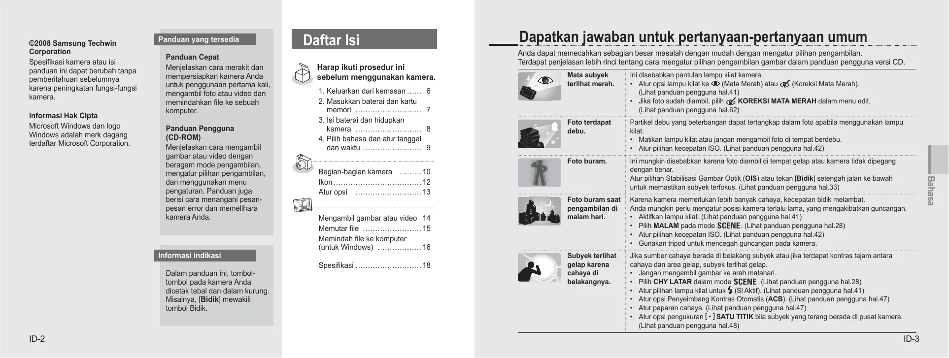 Bagian-bagian kamera ……… 10 Ikon ……………………………… 12 Atur opsi ……………………… 13 Mengambil gambar atau video 14 Memutar file …………………… 15 Memindah file ke komputer (untuk Windows) ……………… 16 Spesifikasi ……………………… 18 ID-3 Bahasa Panduan Pengguna (CD-ROM) Menjelaskan cara mengambil gambar atau video dengan beragam mode pengambilan, mengatur pilihan pengambilan, dan menggunakan menu pengaturan. Panduan juga berisi cara menangani pesanpesan error dan memelihara kamera Anda. Dapatkan jawaban untuk pertanyaan-pertanyaan umum Daftar Isi Informasi Kesehatan dan Keselamatan Patuhi peringatan agar terhindar dari situasi berbahaya pada saat mengoperasikan kamera dan simpan panduan ini sebagai referensi. hal.1 ‘Informasi Kesehatan dan Keselamatan’ Perhatian Situasi yang dapat menyebabkan kerusakan pada kamera atau perlengkapan lain Peringatan Situasi yang dapat menyebabkan cedera pada diri Anda dan orang lain Jangan menggunakan kamera di dekat gas atau cairan yang mudah terbakar atau meledak Jauhkan kamera dari anak-anak dan binatang piaraan Simpan kamera dan semua perlengkapannya jauh dari jangkauan anak-anak dan binatang. Komponen-komponen kecil dapat membuat tersedak atau mengakibatkan cedera serius jika tertelan. Memindahkan komponen dan perlengkapan dapat menimbulkan bahaya fisik juga. Jangan menggunakan lampu kilat pada jarak dekat (kurang dari 1m/3 kaki) pada orang atau binatang. Menggunakan lampu kilat terlalu dekat dengan mata subyek dapat mengakibatkan gangguan penglihatan sementara atau permanen. Tangani dan buang baterai dan charger dengan benar