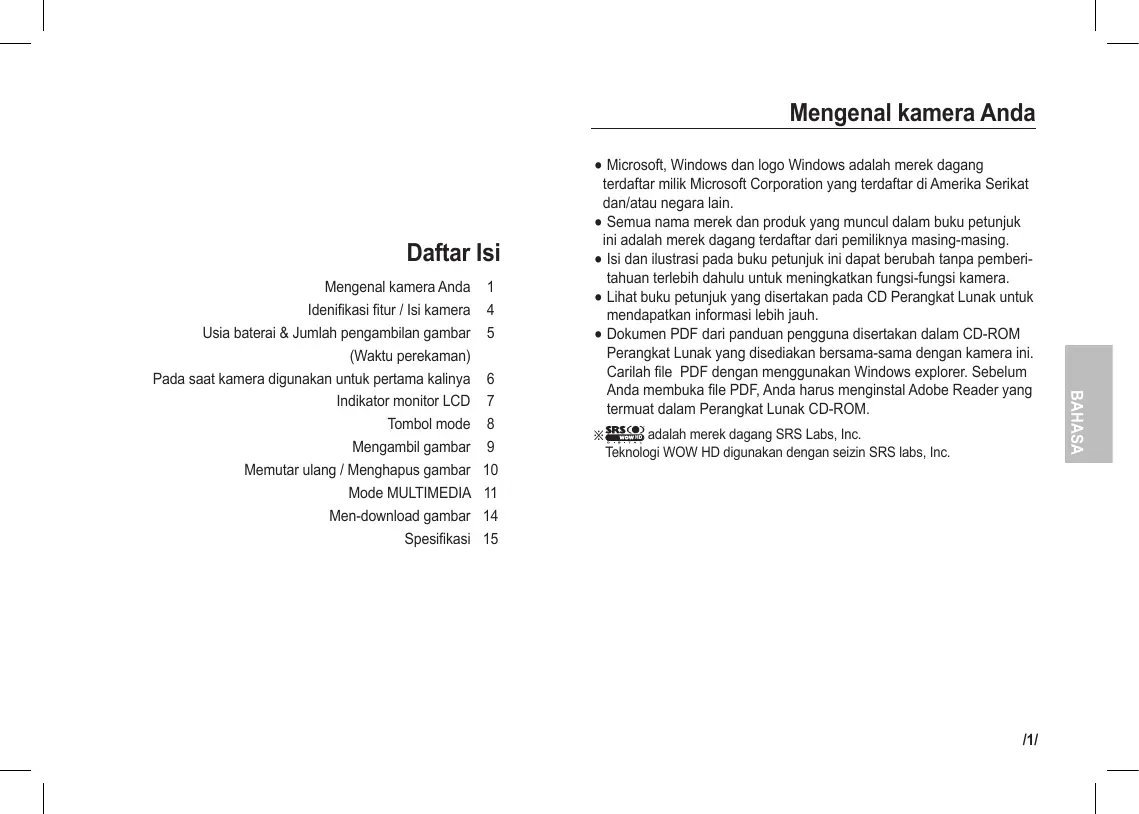 BAHASA Mengenal kamera Anda Idenifikasi fitur / Isi kamera Usia baterai & Jumlah pengambilan gambar (Waktu perekaman) Pada saat kamera digunakan untuk pertama kalinya Indikator monitor LCD Tombol mode Mengambil gambar Memutar ulang / Menghapus gambar Mode MULTIMEDIA Men-download gambar Spesifikasi