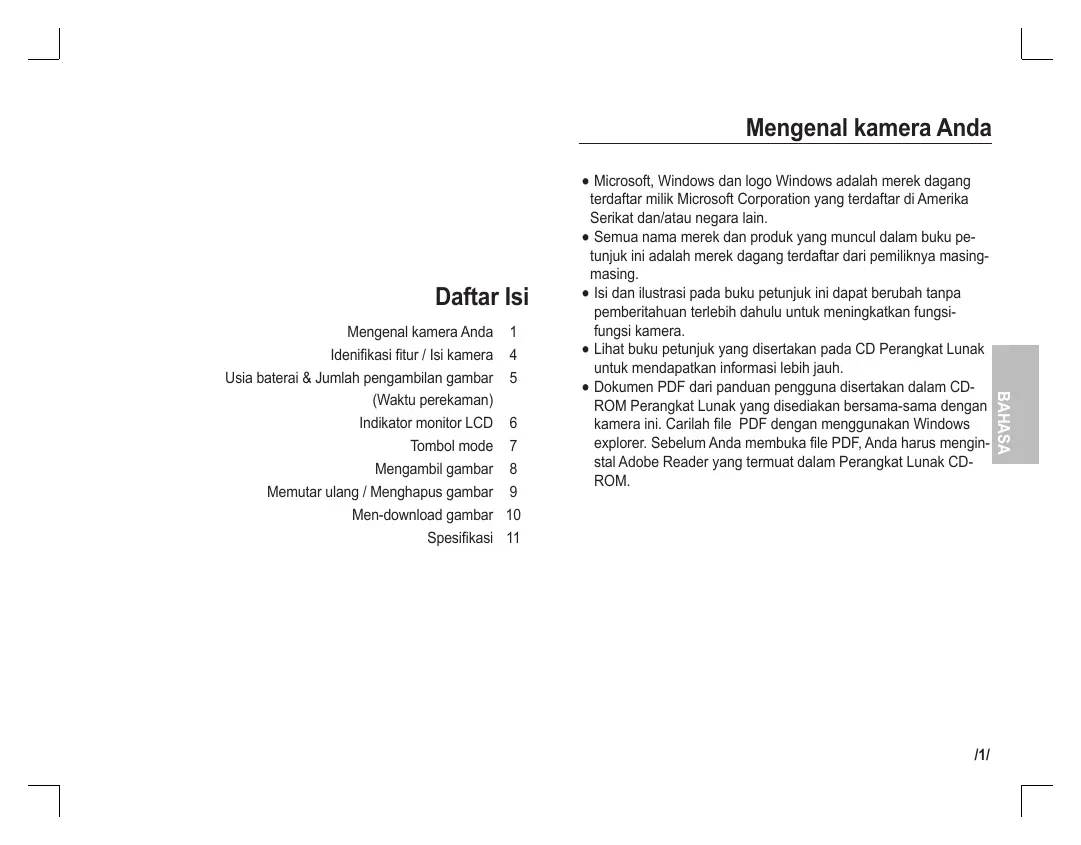 Mengenal kamera Anda Daftar Isi /1/ BAHASA Mengenal kamera Anda 1 Idenifikasi fitur / Isi kamera 4 Usia baterai & Jumlah pengambilan gambar 5 (Waktu perekaman) Indikator monitor LCD 6 Tombol mode 7 Mengambil gambar 8 Memutar ulang / Menghapus gambar 9 Men-download gambar 10 Spesifikasi 11 Microsoft, Windows dan logo Windows adalah merek dagang terdaftar milik Microsoft Corporation yang terdaftar di Amerika Serikat dan/atau negara lain. Semua nama merek dan produk yang muncul dalam buku petunjuk ini adalah merek dagang terdaftar dari pemiliknya masingmasing. Isi dan ilustrasi pada buku petunjuk ini dapat berubah tanpa pemberitahuan terlebih dahulu untuk meningkatkan fungsifungsi kamera. Lihat buku petunjuk yang disertakan pada CD Perangkat Lunak untuk mendapatkan informasi lebih jauh. Dokumen PDF dari panduan pengguna disertakan dalam CDROM Perangkat Lunak yang disediakan bersama-sama dengan kamera ini. Carilah file PDF dengan menggunakan Windows explorer. Sebelum Anda membuka file PDF, Anda harus menginstal Adobe Reader yang termuat dalam Perangkat Lunak CDROM. Mengenal kamera Anda BAHAYA PERINGATAN BAHAYA menunjukkan situasi yang dapat memberikan risiko bahaya, yang jika tidak dihindari, dapat berakibat kepada kematian atau luka yang serius. PERINGATAN menunjukkan adanya situasi yang dapat menjadi berbahaya yang, jika tidak dihindari, akan mengakibatkan kematian atau cedera serius. Jangan mencoba mengubah kamera ini dengan cara apa pun. Hal tersebut dapat mengakibatkan kebakaran, cedera, sengatan listrik atau kerusakan parah pada Anda atau kamera Anda. Pemeriksaan internal, perawatan dan perbaikan hanya boleh dilakukan oleh penyalur atau pusat Servis Kamera Samsung. Jika ada cairan atau benda asing memasuki kamera, jangan gunakan kamera. Matikan kamera, dan lepaskan sumber daya listrik. Anda harus menghubungi penyalur Anda atau Pusat Layanan Kamera Samsung. Hentikan penggunaan kamera karena hal tersebut dapat menyebabkan kebakaran atau sengatan listrik. Demi keselamatan, simpanlah produk dan aksesorinya jauh dari jangkauan anak-anak atau hewan untuk mencegah kecelakaan, misalnya: - Tertelannya baterai atau aksesori kamera yang berukuran kecil. Jika kecelakaan seperti ini terjadi, segeralah dapatkan bantuan dari dokter. - Ada kemungkinan cedera akibat bagian kamera yang dapat bergerak. Jangan gunakan produk ini di dekat gas yang mudah terbakar atau mudah meledak, karena hal ini dapat meningkatkan risiko ledakan. Baterai dan kamera dapat menjadi panas jika digunakan dalam waktu lama dan dapat menyebabkan kamera tidak berfungsi dengan baik. Jika hal ini terjadi, biarkan kamera selama beberapa menit untuk mendinginkannya. Jangan memasukkan atau menjatuhkan benda asing yang terbuat dari logam atau yang mudah meledak ke dalam kamera melalui titik aksesnya, misalnya lubang kartu memori dan ruang baterai. Hal ini dapat menyebabkan kebakaran atau sengatan listrik. Jangan meninggalkan kamera ini di tempat yang dapat terkena suhu tinggi, seperti kendaraan yang tertutup rapat, sinar matahari langsung, atau tempat lain yang suhunya dapat berubah secara ekstrem. Suhu yang tinggi dapat mempengaruhi komponen bagian dalam dari kamera dan dapat mengakibatkan kebakaran. Jangan mengoperasikan kamera ini dengan tangan yang basah. Hal ini dapat menimbulkan risiko sengatan listrik. /2/ Jangan menggunakan lampu kilat di dekat orang atau binatang. Memposisikan lampu kilat terlalu dekat kepada mata dari obyek foto Anda dapat menyebabkan kerusakan pada pengelihatan. Jika sedang digunakan, jangan tutupi kamera atau pengisi daya. Hal ini dapat menimbulkan panas dan merusak bentuk badan kamera atau menyebabkan kebakaran. Gunakanlah selalu kamera dan aksesorinya di tempat yang memiliki ventilasi udara yang memadai. Mengenal kamera Anda AWAS AWAS menunjukkan adanya situasi yang dapat menjadi berbahaya yang, jika tidak dihindari, dapat mengakibatkan cedera kecil atau sedang. Keluarkan baterai jika kamera tidak akan digunakan dalam jangka waktu panjang. Jika tidak dilepaskan maka baterai dapat membocorkan cairan elektrolit yang bersifat korosif dan membuat kerusakan permanen pada kamera. Jangan menyalakan lampu kilat ketika lampu sedang bersentuhan dengan tangan atau benda. Jangan menyentuh lampu kilat setelah menggunakannya secara terus menerus. Hal tersebut dapat menyebabkan luka bakar. Berhati-hatilah untuk tidak menyentuh lensa atau penutup lensa agar terhindar dari kemungkinan pengambilan gambar yang buram dan kerusakan kamera. Kartu kredit dapat mengalami kerusakan magnetik jika diletakkan di dekat kantung kamera. Hindari meletakkan kartu yang memiliki lapisan magnet di dekat penutup kamera. Jangan memasukkan kartu memori dalam arah yang salah. Pastikan untuk memformat kartu memori jika kartu tersebut baru dibeli dan akan digunakan untuk pertama kalinya, jika kartu mengandung data yang tidak dikenal oleh kamera, atau jika kartu berisi gambar yang diambil dengan kamera lain. Sebelum menghadiri acara penting atau melakukan perjalanan, Anda harus memeriksa kondisi kamera. Samsung tidak bertanggung jawab atas malfungsi kamera. /3/ BAHASA Baterai yang bocor, terlalu panas, atau rusak dapat menyebabkan kebakaran atau cedera. - Gunakan baterai yang memiliki spesifikasi yang sesuai untuk kamera tersebut. - Jangan memicu hubungan pendek, memanaskan, atau membuang baterai ke api. - Jangan memasukkan baterai dengan polaritas terbalik. Penggunaan adaptor AC yang tidak sesuai dengan spesifikasi kamera dapat menyebabkan kerusakan kamera. Kami menyarankan baterai yang disertakan atau baterai isi ulang eksklusif. Ä Adaptor AC yang tersedia : Voltase: 3.3V, Amper: 2.0A, Diameter: - Setelah menyalakan kamera, periksa apakah jenis baterai dan setelan kamera yang diset pada menu [SETELAN] > [JNS BTR] sama atau tidak. Idenifikasi fitur / Isi kamera Lampu status kamera Tombol daya Mikrofon Speaker Lampu sensor AF/ Pengatur waktu Tombol mode Tombol rana Lampu kilat Port koneksi input DC Terminal sambungan USB/AV Tombol Zoom W (Thumbnai
