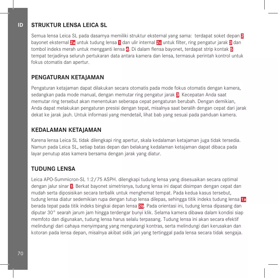 0,5 m - ∞ Pour système Leica SL : env. 120 x 180 mm / 1:5, pour systèmes Leica TL : env. 79 x 118 mm / 1:5 Diaphragme à commande électronique, réglage sur l'appareil, par incrément de 1/2 ou 1/3 22 MISE AU POINT Le réglage de la netteté est effectué automatiquement par l'appareil en mode autofocus ou, en mode manuel, en tournant la bague de réglage 3. La vitesse avec laquelle vous tournez la bague détermine la rapidité de la modification du réglage. Vous pouvez ainsi procéder de manière ciblée à des réglages fins ou encore passer d'un gros plan à un plan large. Pour plus de détails, veuillez vous reporter aux chapitres correspondants du mode d'emploi de l'appareil.