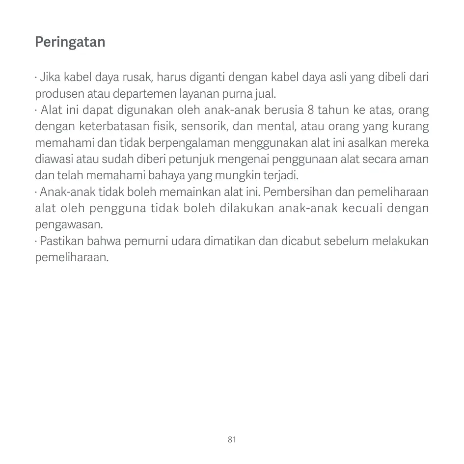 électriques selon les instructions ci-dessous : Ne tirez, tordez ou recourbez pas à l'excès le cordon d'alimentation, car cela peut exposer ou casser le noyau du cordon. Le cordon d'alimentation doit être branché à une source électrique appropriée. Utilisez le cordon d'alimentation qui a été livré avec le purificateur. N'utilisez pas des cordons d'alimentation tiers. Débranchez toujours le puriicateur avant dy entreprendre toute activité de maintenance ou de le déplacer.
