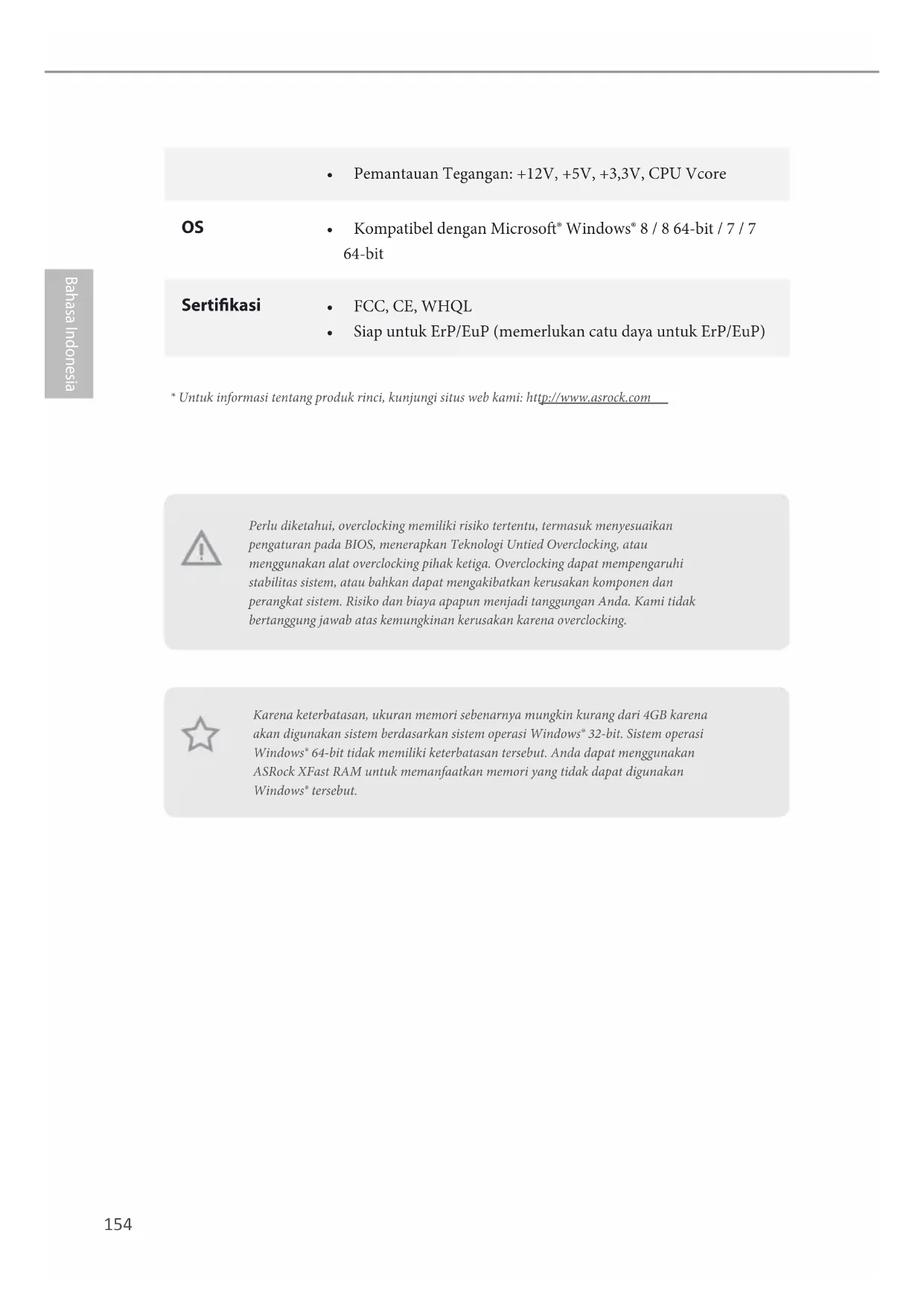 - Siap untuk ErP/EuP (memerlukan catu daya untuk ErP/EuP) Perlu diketahui, overclocking memiliki risiko tertentu, termasuk menyesuaikan pengaturan pada BIOS, menerapkan Teknologi Untied Overclocking, atau menggunakan alat overclocking pihak ketiga. Overclocking dapat mempengaruhi stabilitas sistem, atau bahkan dapat mengakibatkan kerusakan komponen dan perangkat sistem. Risiko dan biaya apapun menjadi tanggungan Anda. Kami tidak bertanggung jawab atas kemungkinan kerusakan karena overclocking.