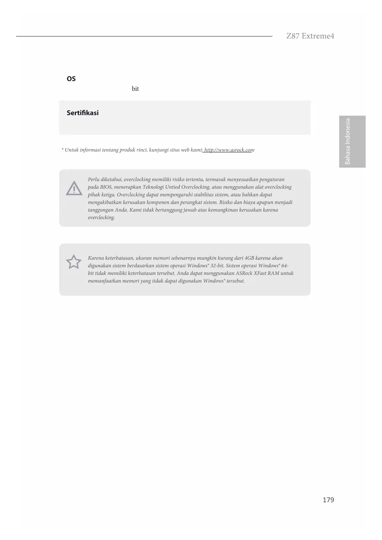 - Untuk informasi tentang produk rinci, kunjungi situs web kami: http://www.asrock.com Karena keterbatasan, ukuran memori sebenarnya mungkin kurang dari 4GB karena akan digunakan sistem berdasarkan sistem operasi Windows® 32-bit. Sistem operasi Windows® 64- bit tidak memiliki keterbatasan tersebut. Anda dapat menggunakan ASRock XFast RAM untuk memanfaatkan memori yang tidak dapat digunakan Windows® tersebut.180 Bahasa Indonesia