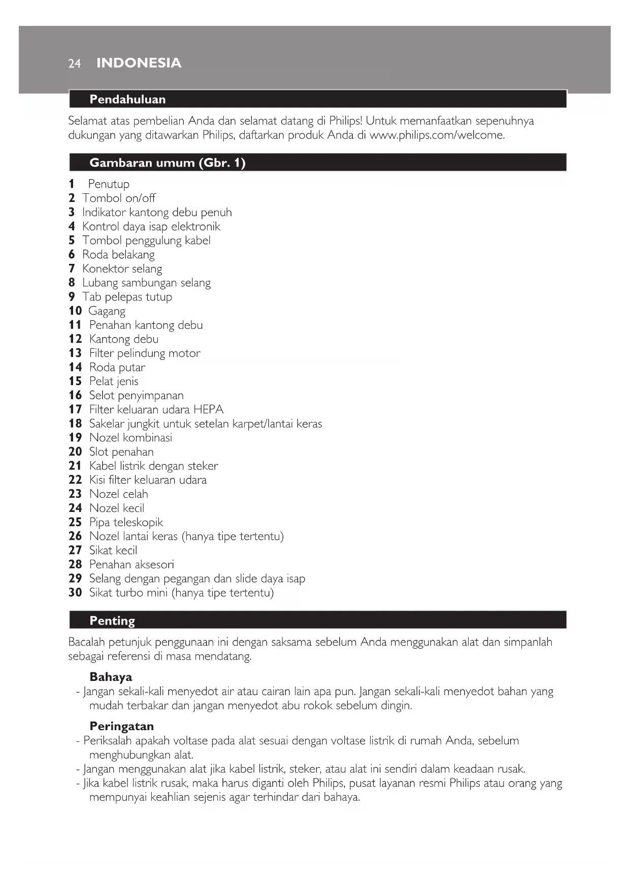 - Jika kabel listrik rusak, maka harus diganti oleh Philips, pusat layanan resmi Philips atau orang yang