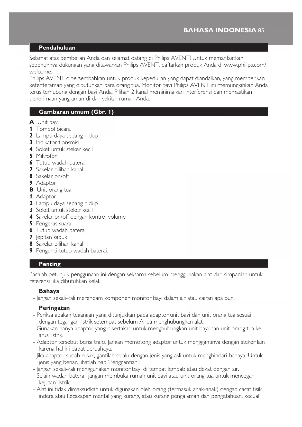 - Gunakan hanya adaptor yang disertakan untuk menghubungkan unit bayi dan unit orang tua ke