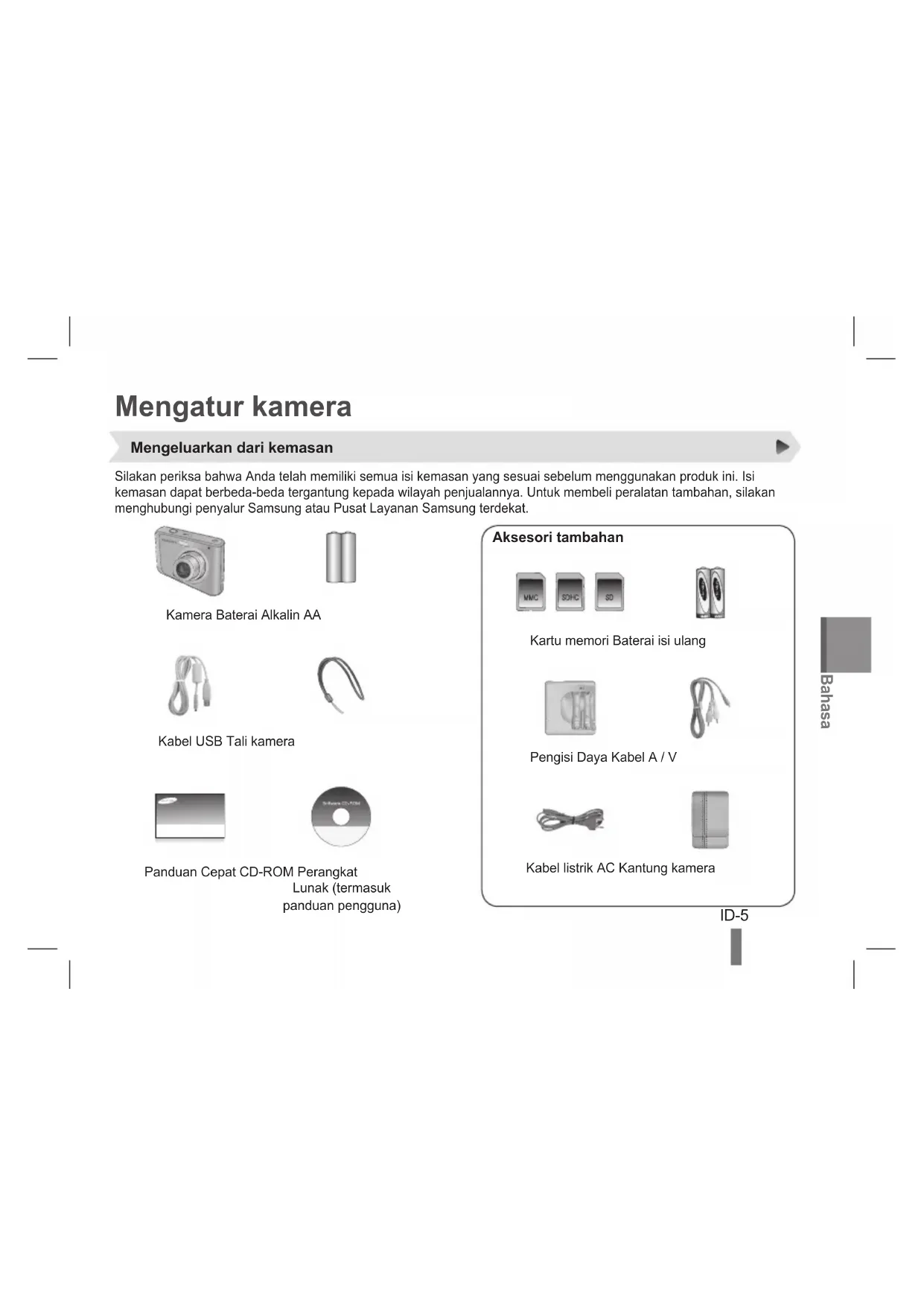 Kamera Baterai Alkalin AAKabel USB Tali kameraPanduan Cepat CD-ROM Perangkat Lunak (termasuk panduan pengguna) Mengatur kamera Kartu memori Baterai isi ulangPengisi Daya Kabel A / VKabel listrik AC Kantung kamera Aksesori tambahan Silakan periksa bahwa Anda telah memiliki semua isi kemasan yang sesuai sebelum menggunakan produk ini. Isi kemasan dapat berbeda-beda tergantung kepada wilayah penjualannya. Untuk membeli peralatan tambahan, silakan menghubungi penyalur Samsung atau Pusat Layanan Samsung terdekat. Mengeluarkan dari kemasanID-7ID-6