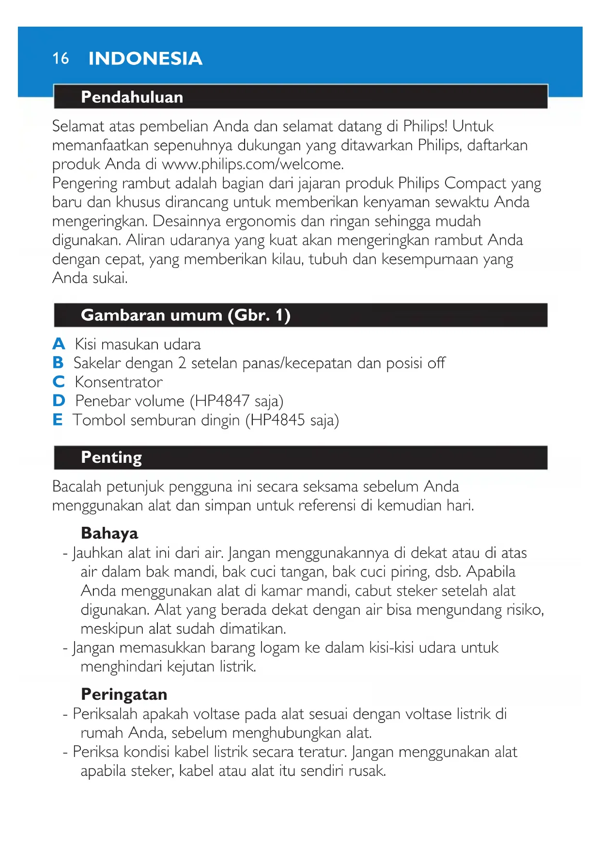 INDONESIA- Jika kabel listrik rusak, maka harus diganti oleh Philips, pusat servis