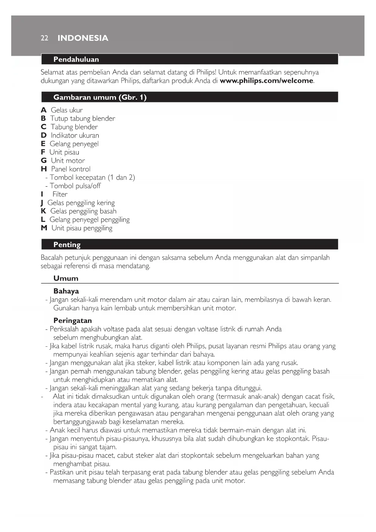 Bahaya - Jangan sekali-kali tenggelamkan unit motor ke dalam air atau apa-apa cecair lain, mahupun membilasnya di bawah air paip. Hanya gunakan kain lembap untuk membersihkan unit motor. Amaran - Periksa sama ada voltan yang ditunjukkan pada perkakas sepadan dengan voltan sesalur kuasa setempat sebelum anda menyambungkan perkakas. - Jika kord sesalur kuasa rosak, ia mesti diganti oleh Philips, pusat servis yang dibenarkan oleh Philips ataupun pihak lain seumpamanya yang layak bagi mengelakkan bahaya. - Jangan gunakan perkakas jika plag, kord sesalur kuasa atau bahagian lain telah rosak. - Jangan sekali-kali gunakan balang pengisar, bikar pengisar kering atau bikar pengisar basah untuk menghidup atau mematikan perkakas. - Jangan biarkan perkakas digunakan tanpa pengawasan. - Perkakas ini bukan dimaksudkan untuk kegunaan orang (termasuk kanak-kanak) yang kurang upaya dari segi zikal, deria atau mental, atau kurang berpengalaman dan pengetahuan, kecuali mereka diawasi atau diberi arahan berkenaan penggunaan perkakas ini oleh orang yang bertanggungjawab atas keselamatan mereka. - Kanak-kanak hendaklah diawasi untuk memastikan bahawa mereka tidak bermain dengan perkakas ini. - Elakkan daripada menyentuh mata pisau, terutamanya apabila peralatan diplag masuk. Mata pisaunya amat tajam. - Jika pisau tersekat, cabut plag perkakas sebelum mengeluarkan bahan-bahan yang menyekat pisau. - Pastikan unit mata pisau dipasang dengan kukuh pada balang pengisar atau bikar pengisar sebelum anda memasang balang pengisar atau bikar pengisar pada unit motor. BAHASA MELAYUAwas - Tanggalkan plag pengisar setiap kali sebelum anda memasang, menanggalkan pemasangan atau melaraskan balang pengisar, pengisar kering atau pengisar basah, dan sebelum anda mula membersihkan pengisar. - Jangan sekali-kali menggunakan sebarang aksesori atau bahagian daripada pengilang lain atau yang tidak disyorkan secara khusus oleh Philips. Jika anda menggunakan aksesori atau bahagian sedemikian, jaminan anda menjadi tidak sah. - Jangan melebihi paras maksimum yang ditandakan pada balang pengisar dan bikar pengisar. - Tahap hingar: Lc= 86 dB(A). Pengisar Amaran - Jangan sekali-kali masukkan jari anda atau objek lain ke dalam balang semasa perkakas sedang berjalan. - Pastikan mata pisau dipasang dengan kejap pada balang pengisar sebelum anda memasang balang pengisar pada unit motor. Awas - Jangan sekali-kali mengisi balang pengisar dengan bahan yang lebih panas dari 80ºC. - Untuk mencegah tumpahan, jangan masukkan lebih daripada 1.5 liter cecair ke dalam balang pengisar, lebih-lebih lagi apabila anda mengisar pada kelajuan tinggi. Jangan masukkan lebih daripada 1liter ke dalam balang pengisar apabila anda memproses cecair panas atau bahan yang mudah berbuih. - Jika makanan melekat pada dinding balang pengisar, matikan perkakas dan cabut plagnya. Kemudian gunakan spatula untuk mengeluarkan makanan tersebut dari dinding. - Sentiasa pastikan tudung dipasang dengan betul pada balang dan cawan penyukat dimasukkan dengan betul ke dalam tudung sebelum anda menghidupkan perkakas ini. - Jangan sekali-kali terlupa untuk memasukkan gelang kedap ke dalam unit mata pisau sebelum anda memasang unit mata pisau pada balang pengisar, kerana jika tidak bocor akan berlaku. - Jangan biarkan perkakas berjalan selama lebih daripada 3 minit setiap kali. - Sentiasa biarkan perkakas menyejuk ke suhu bilik antara kitaran pemprosesan. Pengisar kering dan pengisar basah Amaran - Jangan sekali-kali menggunakan pengisar kering mengisar bahan-bahan yang sangat keras seperti buah pala, gula batu dan ketulan ais. - Jangan gunakan pengisar basah untuk mencampurkan cecair atau untuk menghancurkan ketulan ais. Gunakan balang pengisar untuk memproses bahan-bahan ini. - Jangan sentuh mata pisau pemotongan pada unit pisau pengisar apabila anda membersihkannya. Ia sangat tajam dan jari anda boleh terpotong dengan mudah. Awas - Jangan sekali-kali menggunakan pengisar kering atau pengisar basah melebihi 30 saat tanpa berhenti seketika. Biarkan pengisar kering atau pengisar basah menyejuk sehingga suhu bilik sebelum memulakan kitaran pemprosesan yang seterusnya. - Biarkan bahan-bahan panas menyejuk dahulu sebelum anda memprosesnya di dalam pengisar kering atau basah (suhu maksimum 80°C). - Jangan sekali-kali lupa menempatkan gelang pengedap di dalam unit mata pisau sebelum memasang balang pengisar. Jika tidak, bocor akan berlaku. - Sentiasa proseskan bunga cengkih, bunga lawang dan jintan manis bersama-sama dengan bahan- bahan lain. Jika diproses berasingan, bahan-bahan ini mungkin meninggalkan kesan ke atas bahan- bahan plastik perkakas ini. - Bikar pengisar mungkin akan berubah warna apabila anda menggunakannya untuk memproses bahan-bahan seperti bunga cengkih, jintan manis dan kayu manis. BAHASA MELAYU 39- Pengisar kering dan pengisar basah tidak sesuai untuk mencincang daging mentah. Sebaliknya, gunakan pengisar. - Jangan gunakan pengisar kering dan pengisar basah untuk memproses cecair seperti jus buah. - Jangan proses bahan-bahan kering seperti biji kopi dan kekacang kering di dalam pengisar basah. Penuras Awas - Jangan sekali-kali menggunakan penapis untuk memproses bahan-bahan yang lebih panas daripada 80 C. - Jangan sekali-kali terlalu membebankan penuras. Jangan masukkan lebih daripada 75g kacang soya kering atau 160g buah-buahan ke dalam penuras sekali gus. - Sentiasa pastikan tudung dipasang dengan betul dan cawan penyukat dimasukkan dengan betul ke dalam tudung sebelum anda menghidupkan perkakas ini. - Potong buah menjadi kepingan lebih kecil sebelum memasukkannya ke dalam penapis. - Rendam bahan kering, seperti kacang soya, sebelum memasukkannya ke dalam penapis. Kunci keselamatan binaan dalam Ciri ini memastikan bahawa anda hanya boleh menghidupkan perkakas jika anda telah memasang balang pengisar, bikar pengisar kering atau bikar pengisar basah pada unit motor. Jika balang pengisar atau bikar pengisar dipasang dengan betul, kunci keselamatan terbina dalam akan di