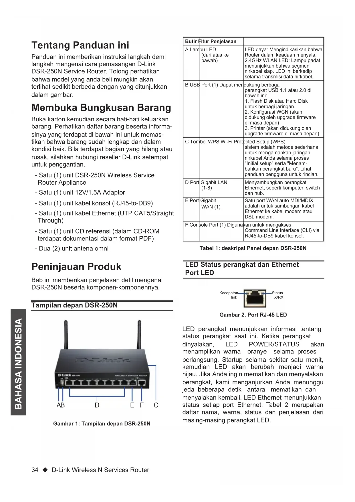 使用者可直接送至全省聯強直營維修站或請洽您的 原購買經銷商。Dokumen ini akan menuntun anda melakukan proses dasar instalasi D-Link Wireless N Service Router baru anda. Building Networks for People DSR-250N Dokumentasi juga bisa didapat dalam CD dan juga di website D-Link Panduan Instalasi Singkat Wireless Services Router Appliance34 D-Link Wireless N Services Router BAHASA INDONESIA Tentang Panduan ini Panduan ini memberikan instruksi langkah demi langkah mengenai cara pemasangan D-Link DSR-250N Service Router. Tolong perhatikan bahwa model yang anda beli mungkin akan terlihat sedikit berbeda dengan yang ditunjukkan dalam gambar. Membuka Bungkusan Barang Buka karton kemudian secara hati-hati keluarkan barang. Perhatikan daftar barang beserta informa- sinya yang terdapat di bawah ini untuk memas- tikan bahwa barang sudah lengkap dan dalam kondisi baik. Bila terdapat bagian yang hilang atau rusak, silahkan hubungi reseller D-Link setempat untuk penggantian. - Satu (1) unit DSR-250N Wireless Service Router Appliance - Satu (1) unit 12V/1.5A Adaptor - Satu (1) unit kabel konsol (RJ45-to-DB9) - Satu (1) unit kabel Ethernet (UTP CAT5/Straight Through) - Satu (1) unit CD referensi (dalam CD-ROM terdapat dokumentasi dalam format PDF) - Dua (2) unit antena omni Butir Fitur PenjelasanA Lampu LED (dari atas ke bawah)LED daya: Mengindikasikan bahwa Router dalam keadaan menyala.2.4GHz WLAN LED: Lampu padat menunjukkan bahwa segmen nirkabel siap. LED ini berkedip selama transmisi data nirkabel.B USB Port (1) Dapat mendukung berbagai perangkat USB 1.1 atau 2.0 di bawah ini:1. Flash Disk atau Hard Disk untuk berbagi jaringan.2. Kongurasi WCN (akan didukung oleh upgrade rmware di masa depan)3. Printer (akan didukung oleh upgrade rmware di masa depan)C Tombol WPS Wi-Fi Protected Setup (WPS) sistem adalah metode sederhana untuk mengamankan jaringan nirkabel Anda selama proses "Initial setup" serta "Menam-bahkan perangkat baru". Lihat panduan pengguna untuk rincian.D Port Gigabit LAN (1-8)Menyambungkan perangkat Ethernet, seperti komputer, switch dan hub.E Port Gigabit WAN (1)Satu port WAN auto MDI/MDIX adalah untuk sambungan kabel Ethernet ke kabel modem atau DSL modem.F Console Port (1) Digunakan untuk mengakses Command Line Interface (CLI) via RJ45-to-DB9 kabel konsol.Tabel 1: deskripsi Panel depan DSR-250N LED Status perangkat dan Ethernet Port LED LED perangkat menunjukkan informasi tentang status perangkat saat ini. Ketika perangkat dinyalakan, LED POWER/STATUS akan menampilkan warna oranye selama proses berlangsung. Startup selama sekitar satu menit, kemudian LED akan berubah menjadi warna hijau. Jika Anda ingin mematikan dan menyalakan perangkat, kami menganjurkan Anda menunggu jeda beberapa detik antara mematikan dan menyalakan kembali. LED Ethernet menunjukkan status setiap port Ethernet. Tabel 2 merupakan daftar nama, warna, status dan penjelasan dari masing-masing perangkat LED. Gambar 2. Port RJ-45 LED Status TX/RXKecepatan link Tampilan depan DSR-250N Peninjauan Produk Gambar 1: Tampilan depan DSR-250N Bab ini memberikan penjelasan detil mengenai DSR-250N beserta komponen-komponennya. FDA CEBD-Link Wireless N Services Router 35 BAHASA INDONESIA Indikator LED Warna Status PenjelasanPower / StatusOranye/HijauOranye padatPerangkat dalam proses power-onHijau padat Proses power-on selesaiOranye berkedipPerangkat rusak dan sedang dalam tahap recoveryHijau berkedipSistem rusak, upgrade rmware gagal.Lampu mati Perangkat mati2.4GHz WLAN Hijau Hijau Link bagusHijau berkedipTerjadi aktivitas pada port tersebutLampu mati Tidak ada linkWPS Biru Biru berkedipMulai memprosesBiru Koneksi sudah berhasil dibentukLampu mati Tidak ada linkStatus TX/RXHijau Lampu mati Tidak ada linkHijau Link terbentukHijau berkedipPort sedang mengiri atau menerima dataKecepatan LINK Hijau/OranyeLampu mati Port beroperasi di kecepatan 10MbpsHijau Port beroperasi di kecepatan 100MbpsOranye Port beroperasi di kecepatan 1000Mbps Menyambungkan listrik dan menyalakan atau mematikan perangkat Pengaturan standar antarmuka DSR-250N Tabel 2: Penjelasan Status LED pada perangkat Menginstal dan menghubungkan perangkat Bab ini menjelaskan cara menyambungkan kabel dan daya ke perangkat. Sebelum anda mulai Perhatikan tindakan pencegahan berikut ini untuk membantu mencegah kerusakan, kegagalan peralatan dan luka-luka lainnya: - Sebelum instalasi, selalu pastikan bahwa sumber daya listrik terputus - Memastikan bahwa ruang di mana Anda mengoperasikan perangkat memiliki sirkulasi udara yang memadai dan suhu kamar tidak melebihi 40˚C (104˚F) - Berikan jarak 1 meter (3 kaki) ruang kosong ke depan dan belakang perangkat. - Jangan letakkan alat di rak peralatan yang menghalangi ventilasi udara di sisi sasis. Pastikan bahwa rak tertutup memiliki kipas dan bukaan ventilasi pada sisinya. - Perhatikan kondisi berbahaya ini sebelum instalasi: lantai basah, kebocoran, kabel listrik yang rusak atau tanpa grounding, serta alas keselamatan yang hilang. Untuk menghubungkan aliran listrik ke perangkat, pasang adaptor daya AC/DC ke “DC power phone jet” pada panel belakang perangkat. Catatan: Kami sarankan menggunakan pelindung untuk koneksi listriknya. Untuk menyalakan perangkat DSR-250N, tekan tombol power DC pada panel belakang ke posisi ON. Untuk mematikan perangkat daya, tekan tombol power ke posisi OFF. Antarmuka EthernetTipe Antarmuka IP AddressWeb-Based ManagementDHCP ClientLAN(1-8) / WLAN Static IP 192.168.10.1 Enabled EnabledWAN DHCP Client0.0.0.0 Disabled Disabled Tabel 3: Pengaturan Default Antarmuka Catatan: Untuk alasan keamanan, D-Link Service Router secara default hanya mengijinkan akses Web GUI dari antarmuka LAN dan WLAN.36 D-Link Wireless N Services Router BAHASA INDONESIA Untuk mengakses perangkat dengan WebUI1. Hubungkan komputer dengan port yang berla-belkan LAN (1-8) yang sudah dialokasikan untuk jaringan LAN. 2. Pastikan bahwa DHCP client pada komputer anda sudah aktif, atau atur dengan IP statis pada subnet