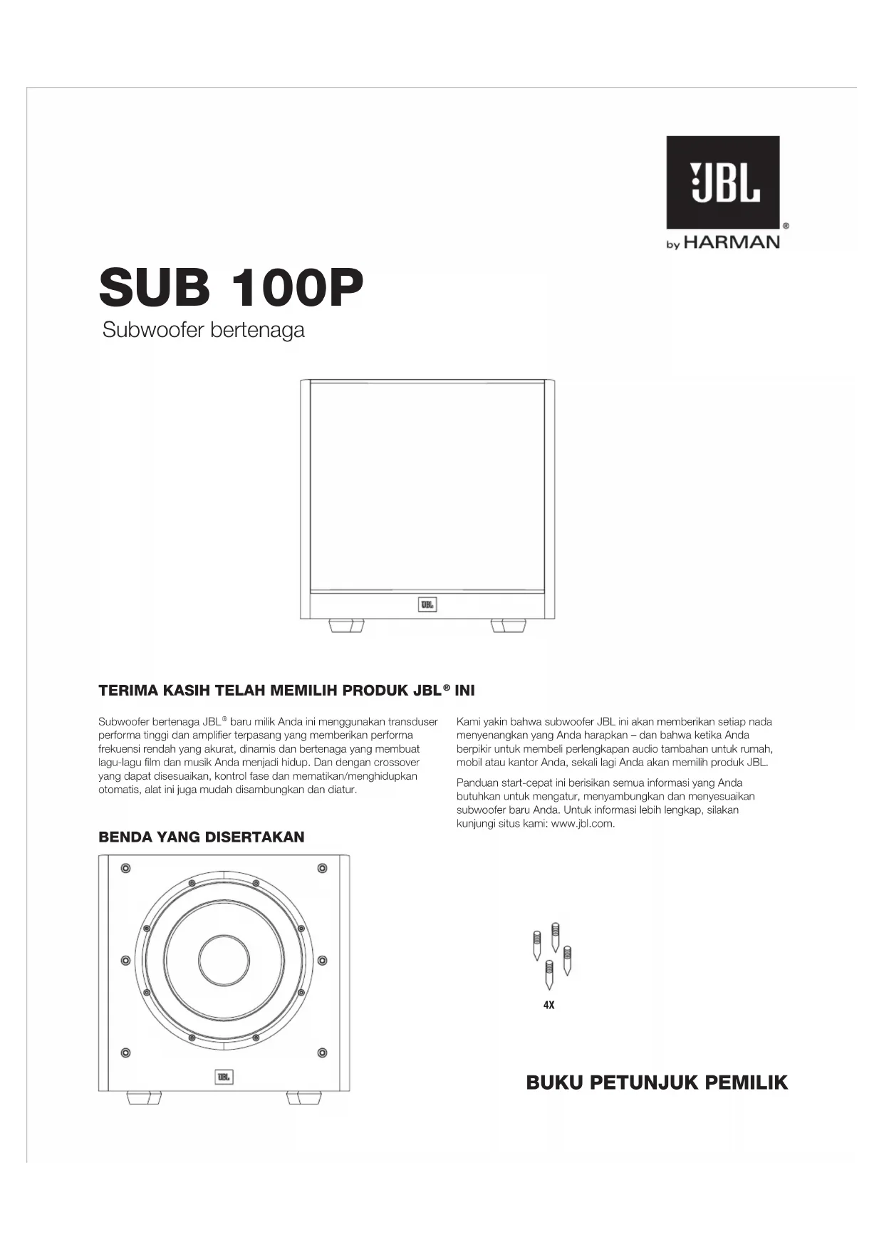 baru milik Anda ini menggunakan transduser performa tinggi dan amplifier terpasang yang memberikan performa frekuensi rendah yang akurat, dinamis dan bertenaga yang membuat lagu-lagu film dan musik Anda menjadi hidup. Dan dengan crossover yang dapat disesuaikan, kontrol fase dan mematikan/menghidupkan otomatis, alat ini juga mudah disambungkan dan diatur. Kami yakin bahwa subwoofer JBL ini akan memberikan setiap nada menyenangkan yang Anda harapkan – dan bahwa ketika Anda berpikir untuk membeli perlengkapan audio tambahan untuk rumah, mobil atau kantor Anda, sekali lagi Anda akan memilih produk JBL. Panduan start-cepat ini berisikan semua informasi yang Anda butuhkan untuk mengatur, menyambungkan dan menyesuaikan subwoofer baru Anda. Untuk informasi lebih lengkap, silakan kunjungi situs kami: www.jbl.com. Subwoofer bertenaga