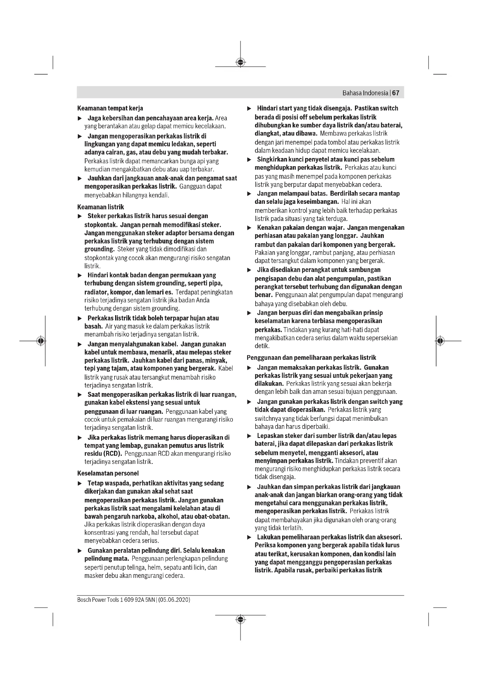 แบตเตอรี่แพ็ค/แบตเตอรี่: ลิเธียม ไอออน: กรุณาปฏิบัติตามคำแนะนำในบทการขนส่ง (ดู "การขนส่ง", หน้า66) Bahasa Indonesia Petunjuk Keselamatan Petunjuk keselamatan umum untuk perkakas listrik PERINGATAN Baca semua peringatan, petunjuk, ilustrasi, dan spesifikasi keselamatan yang diberikan bersama perkakas listrik ini. Kesalahan dalam menjalankan petunjuk di bawah ini dapat mengakibatkan sengatan listrik, kebakaran, dan/atau cedera serius. Simpanlah semua peringatan dan petunjuk untuk penggunaan di masa mendatang. Istilah "perkakas listrik" dalam peringatan mengacu pada perkakas listrik yang dioperasikan dengan listrik (menggunakan kabel) atau perkakas listrik yang dioperasikan dengan baterai (tanpa kabel). 1 609 92A 5NN | (05.06.2020) Bosch Power ToolsBahasa Indonesia | 67 Keamanan tempat kerja u Jaga kebersihan dan pencahayaan area kerja. Area yang berantakan atau gelap dapat memicu kecelakaan. u Jangan mengoperasikan perkakas listrik di lingkungan yang dapat memicu ledakan, seperti adanya cairan, gas, atau debu yang mudah terbakar. Perkakas listrik dapat memancarkan bunga api yang kemudian mengakibatkan debu atau uap terbakar. u Jauhkan dari jangkauan anak-anak dan pengamat saat mengoperasikan perkakas listrik. Gangguan dapat menyebabkan hilangnya kendali. Keamanan listrik u Steker perkakas listrik harus sesuai dengan stopkontak. Jangan pernah memodifikasi steker. Jangan menggunakan steker adaptor bersama dengan perkakas listrik yang terhubung dengan sistem grounding. Steker yang tidak dimodifikasi dan stopkontak yang cocok akan mengurangi risiko sengatan listrik. u Hindari kontak badan dengan permukaan yang terhubung dengan sistem grounding, seperti pipa, radiator, kompor, dan lemari es. Terdapat peningkatan risiko terjadinya sengatan listrik jika badan Anda terhubung dengan sistem grounding. u Perkakas listrik tidak boleh terpapar hujan atau basah. Air yang masuk ke dalam perkakas listrik menambah risiko terjadinya sengatan listrik. u Jangan menyalahgunakan kabel. Jangan gunakan kabel untuk membawa, menarik, atau melepas steker perkakas listrik. Jauhkan kabel dari panas, minyak, tepi yang tajam, atau komponen yang bergerak. Kabel listrik yang rusak atau tersangkut menambah risiko terjadinya sengatan listrik. u Saat mengoperasikan perkakas listrik di luar ruangan, gunakan kabel ekstensi yang sesuai untuk penggunaan di luar ruangan. Penggunaan kabel yang cocok untuk pemakaian di luar ruangan mengurangi risiko terjadinya sengatan listrik. u Jika perkakas listrik memang harus dioperasikan di tempat yang lembap, gunakan pemutus arus listrik residu (RCD). Penggunaan RCD akan mengurangi risiko terjadinya sengatan listrik. Keselamatan personel u Tetap waspada, perhatikan aktivitas yang sedang dikerjakan dan gunakan akal sehat saat mengoperasikan perkakas listrik. Jangan gunakan perkakas listrik saat mengalami kelelahan atau di bawah pengaruh narkoba, alkohol, atau obat-obatan. Jika perkakas listrik dioperasikan dengan daya konsentrasi yang rendah, hal tersebut dapat menyebabkan cedera serius. u Gunakan peralatan pelindung diri. Selalu kenakan pelindung mata. Penggunaan perlengkapan pelindung seperti penutup telinga, helm, sepatu anti licin, dan masker debu akan mengurangi cedera. u Hindari start yang tidak disengaja. Pastikan switch berada di posisi off sebelum perkakas listrik dihubungkan ke sumber daya listrik dan/atau baterai, diangkat, atau dibawa. Membawa perkakas listrik dengan jari menempel pada tombol atau perkakas listrik dalam keadaan hidup dapat memicu kecelakaan. u Singkirkan kunci penyetel atau kunci pas sebelum menghidupkan perkakas listrik. Perkakas atau kunci pas yang masih menempel pada komponen perkakas listrik yang berputar dapat menyebabkan cedera. u Jangan melampaui batas. Berdirilah secara mantap dan selalu jaga keseimbangan. Hal ini akan memberikan kontrol yang lebih baik terhadap perkakas listrik pada situasi yang tak terduga. u Kenakan pakaian dengan wajar. Jangan mengenakan perhiasan atau pakaian yang longgar. Jauhkan rambut dan pakaian dari komponen yang bergerak. Pakaian yang longgar, rambut panjang, atau perhiasan dapat tersangkut dalam komponen yang bergerak. u Jika disediakan perangkat untuk sambungan pengisapan debu dan alat pengumpulan, pastikan perangkat tersebut terhubung dan digunakan dengan benar. Penggunaan alat pengumpulan dapat mengurangi bahaya yang disebabkan oleh debu. u Jangan berpuas diri dan mengabaikan prinsip keselamatan karena terbiasa mengoperasikan perkakas. Tindakan yang kurang hati-hati dapat mengakibatkan cedera serius dalam waktu sepersekian detik. Penggunaan dan pemeliharaan perkakas listrik u Jangan memaksakan perkakas listrik. Gunakan perkakas listrik yang sesuai untuk pekerjaan yang dilakukan. Perkakas listrik yang sesuai akan bekerja dengan lebih baik dan aman sesuai tujuan penggunaan. u Jangan gunakan perkakas listrik dengan switch yang tidak dapat dioperasikan. Perkakas listrik yang switchnya yang tidak berfungsi dapat menimbulkan bahaya dan harus diperbaiki. u Lepaskan steker dari sumber listrik dan/atau lepas baterai, jika dapat dilepaskan dari perkakas listrik sebelum menyetel, mengganti aksesori, atau menyimpan perkakas listrik. Tindakan preventif akan mengurangi risiko menghidupkan perkakas listrik secara tidak disengaja. u Jauhkan dan simpan perkakas listrik dari jangkauan anak-anak dan jangan biarkan orang-orang yang tidak mengetahui cara menggunakan perkakas listrik, mengoperasikan perkakas listrik. Perkakas listrik dapat membahayakan jika digunakan oleh orang-orang yang tidak terlatih. u Lakukan pemeliharaan perkakas listrik dan aksesori. Periksa komponen yang bergerak apabila tidak lurus atau terikat, kerusakan komponen, dan kondisi lain yang dapat mengganggu pengoperasian perkakas listrik. Apabila rusak, perbaiki perkakas listrik Bosch Power Tools 1 609 92A 5NN | (