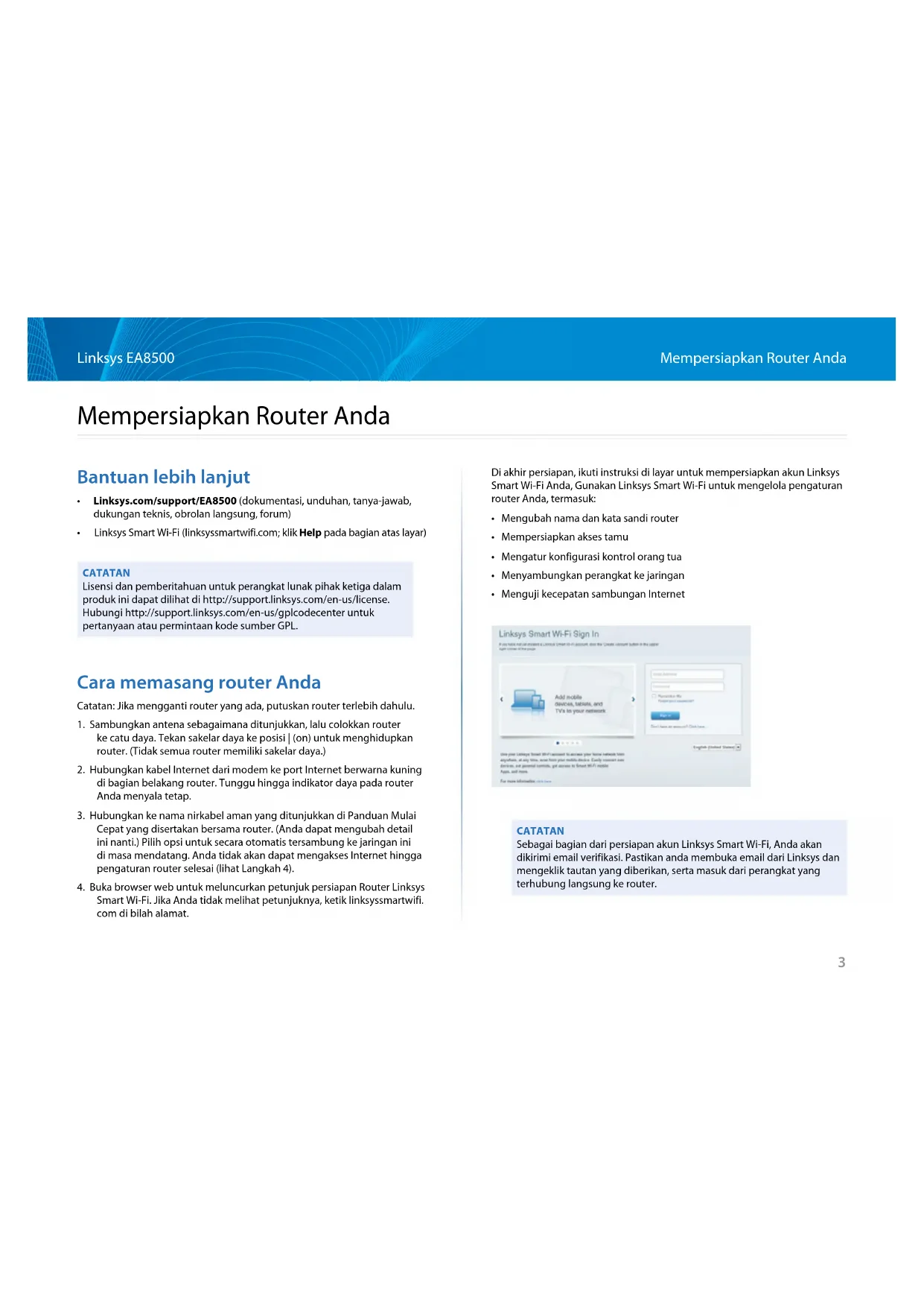 - Menguji kecepatan sambungan Internet CATATAN Sebagai bagian dari persiapan akun Linksys Smart Wi-Fi, Anda akan dikirimi email verifikasi. Pastikan anda membuka email dari Linksys dan mengeklik tautan yang diberikan, serta masuk dari perangkat yang terhubung langsung ke router. Mempersiapkan Router Anda4 Linksys EA8500 Mempersiapkan Router Anda Cara menyambungkan ke WiFi Pintar Linksys 1 Buka peramban web dan kunjungi www.linksyssmartwifi.com. 2 Masukkan alamat email dan kata sandi yang Anda siapkan sebelumnya, lalu klik Sign in. Cara mengubah pengaturan router CATATAN Untuk bantuan tambahan tentang menu apa pun, klik Bantuan di bagian atas layar.