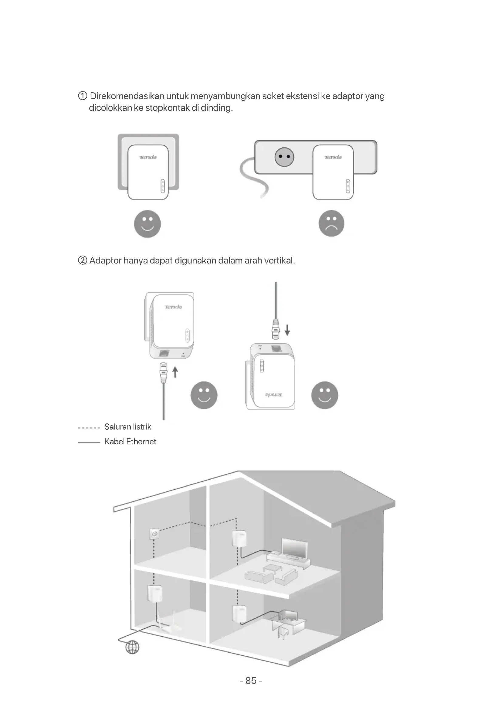 - Naudokite mygtuką Pair, kad vėl suporuotumėte jį su kitu adapteriu elektros tinklo tinkle. A3: Išbandykite šiuos metodus:- 85 - Bahasa Indonesia Perhatian ② Adaptor hanya dapat digunakan dalam arah vertikal. ① Direkomendasikan untuk menyambungkan soket ekstensi ke adaptor yang dicolokkan ke stopkontak di dinding. Saluran listrik Kabel Ethernet- 86 - Hubungkan adaptor ke port LAN pada router untuk akses internet, dan colokkan ke stopkontak di dinding terdekat. Hubungkan adaptor lainnya ke perangkat berkabel seperti dekoder, dan colokkan ke stopkontak di dinding. Tunggu hingga indikator LED PLC dari kedua adaptor menyala.- 87 - (Opsional) Amankan Jaringan Powerline Anda
