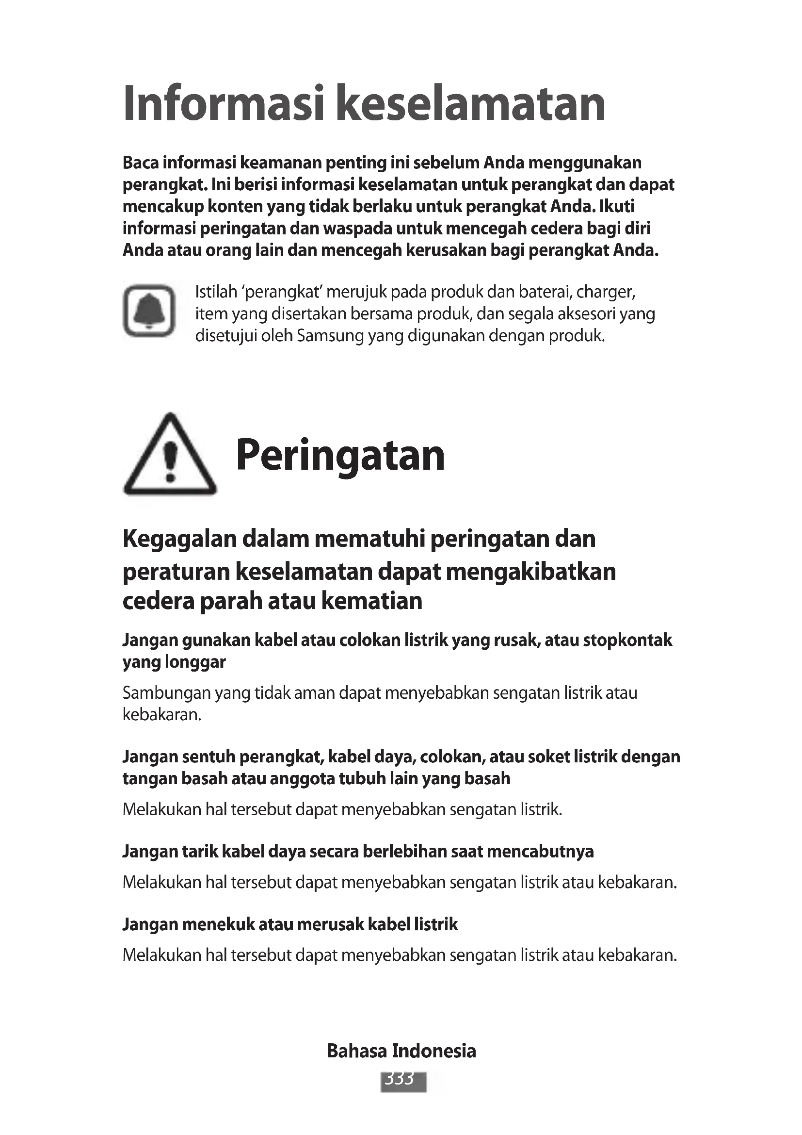Informasi keselamatan Baca informasi keamanan penting ini sebelum Anda menggunakan perangkat. Ini berisi informasi keselamatan untuk perangkat dan dapat mencakup konten yang tidak berlaku untuk perangkat Anda. Ikuti informasi peringatan dan waspada untuk mencegah cedera bagi diri Anda atau orang lain dan mencegah kerusakan bagi perangkat Anda.Istilah ‘perangkat’ merujuk pada produk dan baterai, charger, item yang disertakan bersama produk, dan segala aksesori yang disetujui oleh Samsung yang digunakan dengan produk. Peringatan Kegagalan dalam mematuhi peringatan dan peraturan keselamatan dapat mengakibatkan cedera parah atau kematian Jangan gunakan kabel atau colokan listrik yang rusak, atau stopkontak yang longgarSambungan yang tidak aman dapat menyebabkan sengatan listrik atau kebakaran.Jangan sentuh perangkat, kabel daya, colokan, atau soket listrik dengan tangan basah atau anggota tubuh lain yang basahMelakukan hal tersebut dapat menyebabkan sengatan listrik.Jangan tarik kabel daya secara berlebihan saat mencabutnyaMelakukan hal tersebut dapat menyebabkan sengatan listrik atau kebakaran.Jangan menekuk atau merusak kabel listrikMelakukan hal tersebut dapat menyebabkan sengatan listrik atau kebakaran.Bahasa Indonesia