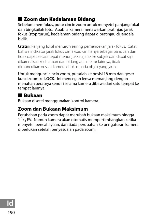 En De Fr Es Sv Ru De Fr Es Sv Ru Remarque : la focale diminue au fur et à mesure que la distance de mise au point se raccourcit. Notez que l’indicateur de la distance de mise au point doit seulement être considéré comme un guide. En effet, il peut ne pas afficher avec précision la distance au sujet. En outre, en raison de la profondeur de champ ou d’autres facteurs, il peut ne pas indiquer ∞ lorsque l’appareil photo fait le point sur un objet éloigné.