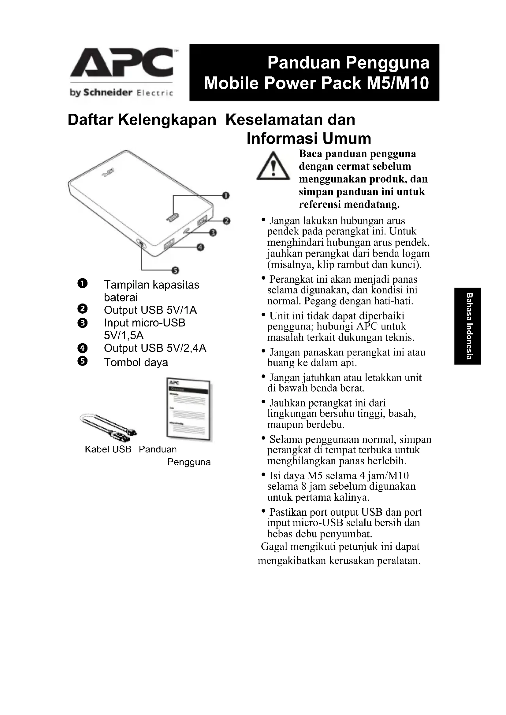 Jumlah output gabungan 2 (dua) port USB maksimum 2,4A. Jika jumlah output gabungan 2 (dua) perangkat lebih dari 2,4A, maka kelebihan muatan pada sirkuit proteksi akan terpicu dan output akan dinonaktifkan. Informasi Daur Ulang Baterai Selalu buang baterai bekas dengan benar. Buang baterai bekas ke fasilitas pembuangan dan daur ulang yang sesuai. Bahasa Indonesia© 2015 APC by Schneider Electric. APC dan logo APC dimiliki oleh Schneider Electric Industries S.A.S. atau perusahaan afiliasinya. Semua merek dagang lainnya merupakan kepunyaan pemiliknya. IN 990-9780 04/2015