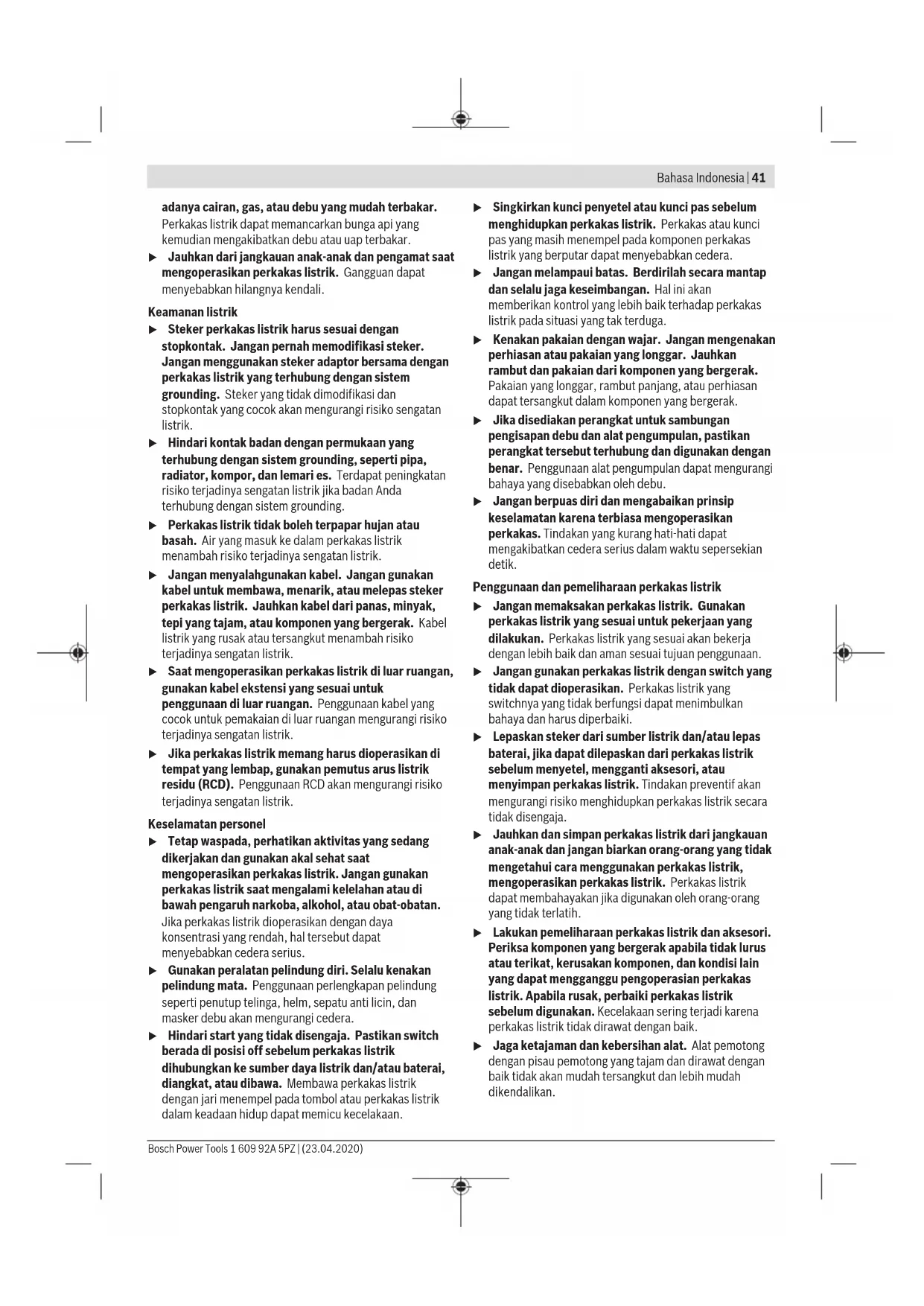 โทรศัพท์ 02 7587555 โทรสาร 02 7587525 การกำจัดขยะ เครื่องมือไฟฟ้า อุปกรณ์ประกอบ และหีบห่อ ต้องนำ ไปแยกประเภทวัสดุเพื่อการรีไซเคิลที่เป็นมิตรต่อสิ่งแวดล้อม อย่าทิ้งเครื่องมือไฟฟ้าลงในขยะครัวเรือน! Bahasa Indonesia Petunjuk Keselamatan Petunjuk keselamatan umum untuk perkakas listrik PERINGATAN Baca semua peringatan, petunjuk, ilustrasi, dan spesifikasi keselamatan yang diberikan bersama perkakas listrik ini. Kesalahan dalam menjalankan petunjuk di bawah ini dapat mengakibatkan sengatan listrik, kebakaran, dan/atau cedera serius. Simpanlah semua peringatan dan petunjuk untuk penggunaan di masa mendatang. Istilah "perkakas listrik" dalam peringatan mengacu pada perkakas listrik yang dioperasikan dengan listrik (menggunakan kabel) atau perkakas listrik yang dioperasikan dengan baterai (tanpa kabel). Keamanan tempat kerja u Jaga kebersihan dan pencahayaan area kerja. Area yang berantakan atau gelap dapat memicu kecelakaan. u Jangan mengoperasikan perkakas listrik di lingkungan yang dapat memicu ledakan, seperti 1 609 92A 5PZ | (23.04.2020) Bosch Power ToolsBahasa Indonesia | 41 adanya cairan, gas, atau debu yang mudah terbakar. Perkakas listrik dapat memancarkan bunga api yang kemudian mengakibatkan debu atau uap terbakar. u Jauhkan dari jangkauan anak-anak dan pengamat saat mengoperasikan perkakas listrik. Gangguan dapat menyebabkan hilangnya kendali. Keamanan listrik u Steker perkakas listrik harus sesuai dengan stopkontak. Jangan pernah memodifikasi steker. Jangan menggunakan steker adaptor bersama dengan perkakas listrik yang terhubung dengan sistem grounding. Steker yang tidak dimodifikasi dan stopkontak yang cocok akan mengurangi risiko sengatan listrik. u Hindari kontak badan dengan permukaan yang terhubung dengan sistem grounding, seperti pipa, radiator, kompor, dan lemari es. Terdapat peningkatan risiko terjadinya sengatan listrik jika badan Anda terhubung dengan sistem grounding. u Perkakas listrik tidak boleh terpapar hujan atau basah. Air yang masuk ke dalam perkakas listrik menambah risiko terjadinya sengatan listrik. u Jangan menyalahgunakan kabel. Jangan gunakan kabel untuk membawa, menarik, atau melepas steker perkakas listrik. Jauhkan kabel dari panas, minyak, tepi yang tajam, atau komponen yang bergerak. Kabel listrik yang rusak atau tersangkut menambah risiko terjadinya sengatan listrik. u Saat mengoperasikan perkakas listrik di luar ruangan, gunakan kabel ekstensi yang sesuai untuk penggunaan di luar ruangan. Penggunaan kabel yang cocok untuk pemakaian di luar ruangan mengurangi risiko terjadinya sengatan listrik. u Jika perkakas listrik memang harus dioperasikan di tempat yang lembap, gunakan pemutus arus listrik residu (RCD). Penggunaan RCD akan mengurangi risiko terjadinya sengatan listrik. Keselamatan personel u Tetap waspada, perhatikan aktivitas yang sedang dikerjakan dan gunakan akal sehat saat mengoperasikan perkakas listrik. Jangan gunakan perkakas listrik saat mengalami kelelahan atau di bawah pengaruh narkoba, alkohol, atau obat-obatan. Jika perkakas listrik dioperasikan dengan daya konsentrasi yang rendah, hal tersebut dapat menyebabkan cedera serius. u Gunakan peralatan pelindung diri. Selalu kenakan pelindung mata. Penggunaan perlengkapan pelindung seperti penutup telinga, helm, sepatu anti licin, dan masker debu akan mengurangi cedera. u Hindari start yang tidak disengaja. Pastikan switch berada di posisi off sebelum perkakas listrik dihubungkan ke sumber daya listrik dan/atau baterai, diangkat, atau dibawa. Membawa perkakas listrik dengan jari menempel pada tombol atau perkakas listrik dalam keadaan hidup dapat memicu kecelakaan. u Singkirkan kunci penyetel atau kunci pas sebelum menghidupkan perkakas listrik. Perkakas atau kunci pas yang masih menempel pada komponen perkakas listrik yang berputar dapat menyebabkan cedera. u Jangan melampaui batas. Berdirilah secara mantap dan selalu jaga keseimbangan. Hal ini akan memberikan kontrol yang lebih baik terhadap perkakas listrik pada situasi yang tak terduga. u Kenakan pakaian dengan wajar. Jangan mengenakan perhiasan atau pakaian yang longgar. Jauhkan rambut dan pakaian dari komponen yang bergerak. Pakaian yang longgar, rambut panjang, atau perhiasan dapat tersangkut dalam komponen yang bergerak. u Jika disediakan perangkat untuk sambungan pengisapan debu dan alat pengumpulan, pastikan perangkat tersebut terhubung dan digunakan dengan benar. Penggunaan alat pengumpulan dapat mengurangi bahaya yang disebabkan oleh debu. u Jangan berpuas diri dan mengabaikan prinsip keselamatan karena terbiasa mengoperasikan perkakas. Tindakan yang kurang hati-hati dapat mengakibatkan cedera serius dalam waktu sepersekian detik. Penggunaan dan pemeliharaan perkakas listrik u Jangan memaksakan perkakas listrik. Gunakan perkakas listrik yang sesuai untuk pekerjaan yang dilakukan. Perkakas listrik yang sesuai akan bekerja dengan lebih baik dan aman sesuai tujuan penggunaan. u Jangan gunakan perkakas listrik dengan switch yang tidak dapat dioperasikan. Perkakas listrik yang switchnya yang tidak berfungsi dapat menimbulkan bahaya dan harus diperbaiki. u Lepaskan steker dari sumber listrik dan/atau lepas baterai, jika dapat dilepaskan dari perkakas listrik sebelum menyetel, mengganti aksesori, atau menyimpan perkakas listrik. Tindakan preventif akan mengurangi risiko menghidupkan perkakas listrik secara tidak disengaja. u Jauhkan dan simpan perkakas listrik dari jangkauan anak-anak dan jangan biarkan orang-orang yang tidak mengetahui cara menggunakan perkakas listrik, mengoperasikan perkakas listrik. Perkakas listrik dapat membahayakan jika digunakan oleh orang-orang yang tidak terlatih. u Lakukan pemeliharaan pe