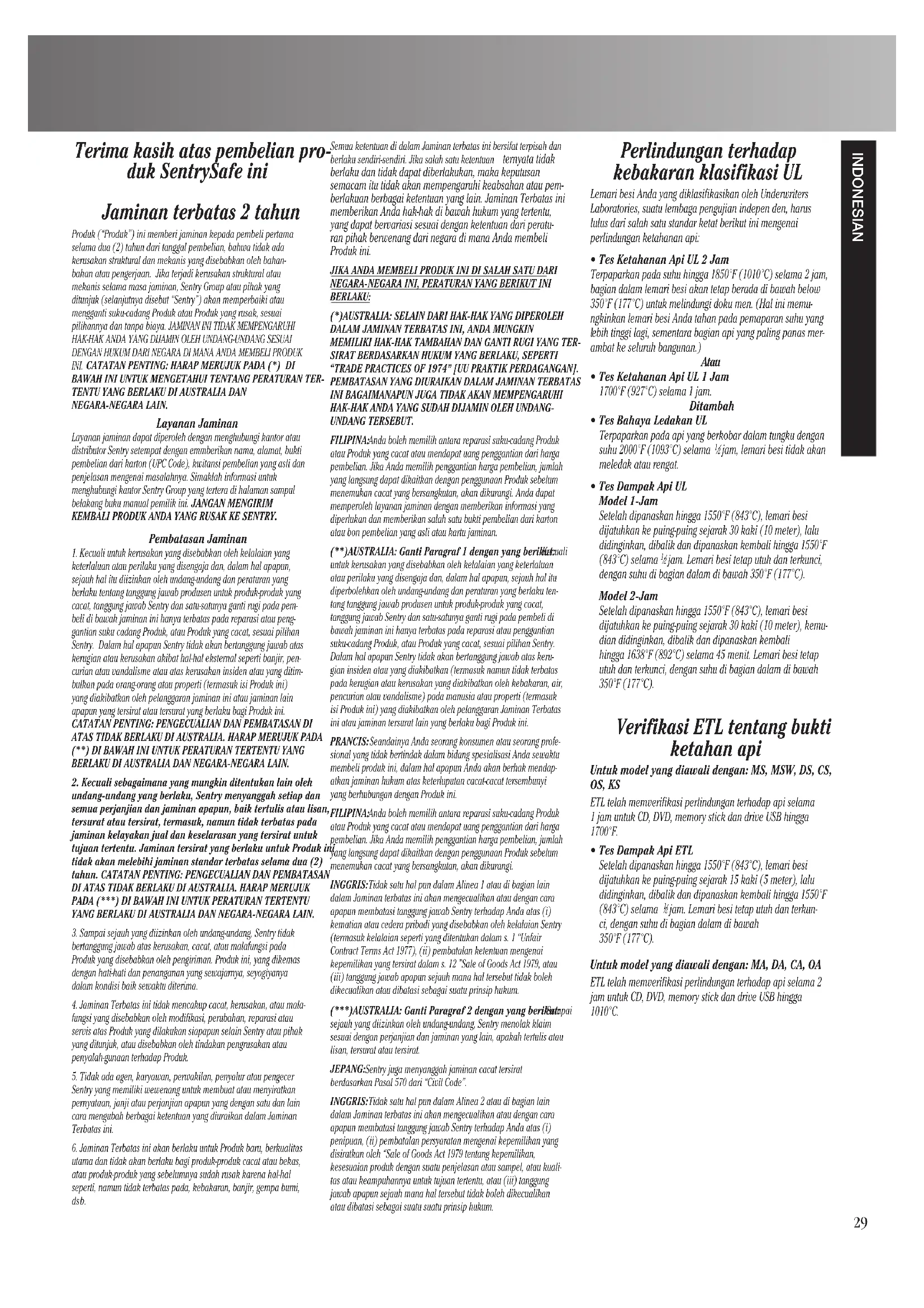 HAK-HAK ANDA YANG SUDAH DIJAMIN OLEH UNDANG- UNDANG TERSEBUT. FILIPINA: Anda boleh memilih antara reparasi suku-cadang Produk atau Produk yang cacat atau mendapat uang penggantian dari harga pembelian. Jika Anda memilih penggantian harga pembelian, jumlah yang langsung dapat dikaitkan dengan penggunaan Produk sebelum menemukan cacat yang bersangkutan, akan dikurangi. Anda dapat memperoleh layanan jaminan dengan memberikan informasi yang diperlukan dan memberikan salah satu bukti pembelian dari karton atau bon pembelian yang asli atau kartu jaminan. (**)AUSTRALIA: Ganti Paragraf 1 dengan yang berikut: Kecuali untuk kerusakan yang disebabkan oleh kelalaian yang keterlaluan atau perilaku yang disengaja dan, dalam hal apapun, sejauh hal itu diperbolehkan oleh undang-undang dan peraturan yang berlaku ten- tang tanggung jawab produsen untuk produk-produk yang cacat, tanggung jawab Sentry dan satu-satunya ganti rugi pada pembeli di bawah jaminan ini hanya terbatas pada reparasi atau penggantian suku-cadang Produk, atau Produk yang cacat, sesuai pilihan Sentry. Dalam hal apapun Sentry tidak akan bertanggung jawab atas keru- gian insiden atau yang diakibatkan (termasuk namun tidak terbatas pada kerugian atau kerusakan yang diakibatkan oleh kebakaran, air, pencurian atau vandalisme) pada manusia atau properti (termasuk isi Produk ini) yang diakibatkan oleh pelanggaran Jaminan Terbatas ini atau jaminan tersurat lain yang berlaku bagi Produk ini. PRANCIS: Seandainya Anda seorang konsumen atau seorang profe- sional yang tidak bertindak dalam bidang spesialisasi Anda sewaktu membeli produk ini, dalam hal apapun Anda akan berhak mendap- atkan jaminan hukum atas keterluputan cacat-cacat tersembunyi yang berhubungan dengan Produk ini. FILIPINA: Anda boleh memilih antara reparasi suku-cadang Produk atau Produk yang cacat atau mendapat uang penggantian dari harga pembelian. Jika Anda memilih penggantian harga pembelian, jumlah yang langsung dapat dikaitkan dengan penggunaan Produk sebelum menemukan cacat yang bersangkutan, akan dikurangi. INGGRIS: Tidak satu hal pun dalam Alinea 1 atau di bagian lain dalam Jaminan terbatas ini akan mengecualikan atau dengan cara apapun membatasi tanggung jawab Sentry terhadap Anda atas (i) kematian atau cedera pribadi yang disebabkan oleh kelalaian Sentry (termasuk kelalaian seperti yang ditentukan dalam s. 1 “Unfair Contract Terms Act 1977), (ii) pembatalan ketentuan mengenai kepemilikan yang tersirat dalam s. 12 ”Sale of Goods Act 1979, atau (iii) tanggung jawab apapun sejauh mana hal tersebut tidak boleh dikecualikan atau dibatasi sebagai suatu prinsip hukum. (***)AUSTRALIA: Ganti Paragraf 2 dengan yang berikut: Sampai sejauh yang diizinkan oleh undang-undang, Sentry menolak klaim sesuai dengan perjanjian dan jaminan yang lain, apakah tertulis atau lisan, tersurat atau tersirat. JEPANG: Sentry juga menyanggah jaminan cacat tersirat berdasarkan Pasal 570 dari “Civil Code”. INGGRIS: Tidak satu hal pun dalam Alinea 2 atau di bagian lain dalam Jaminan terbatas ini akan mengecualikan atau dengan cara apapun membatasi tanggung jawab Sentry terhadap Anda atas (i) penipuan, (ii) pembatalan persyaratan mengenai kepemilikan yang disiratkan oleh “Sale of Goods Act 1979 tentang kepemilikan, kesesuaian produk dengan suatu penjelasan atau sampel, atau kuali- tas atau keampuhannya untuk tujuan tertentu, atau (iii) tanggung jawab apapun sejauh mana hal tersebut tidak boleh dikecualikan atau dibatasi sebagai suatu suatu prinsip hukum. Perlindungan terhadap kebakaran klasifikasi UL Lemari besi Anda yang diklasifikasikan oleh Underwriters Laboratories, suatu lembaga pengujian indepen den, harus lulus dari salah satu standar ketat berikut ini mengenai perlindungan ketahanan api: