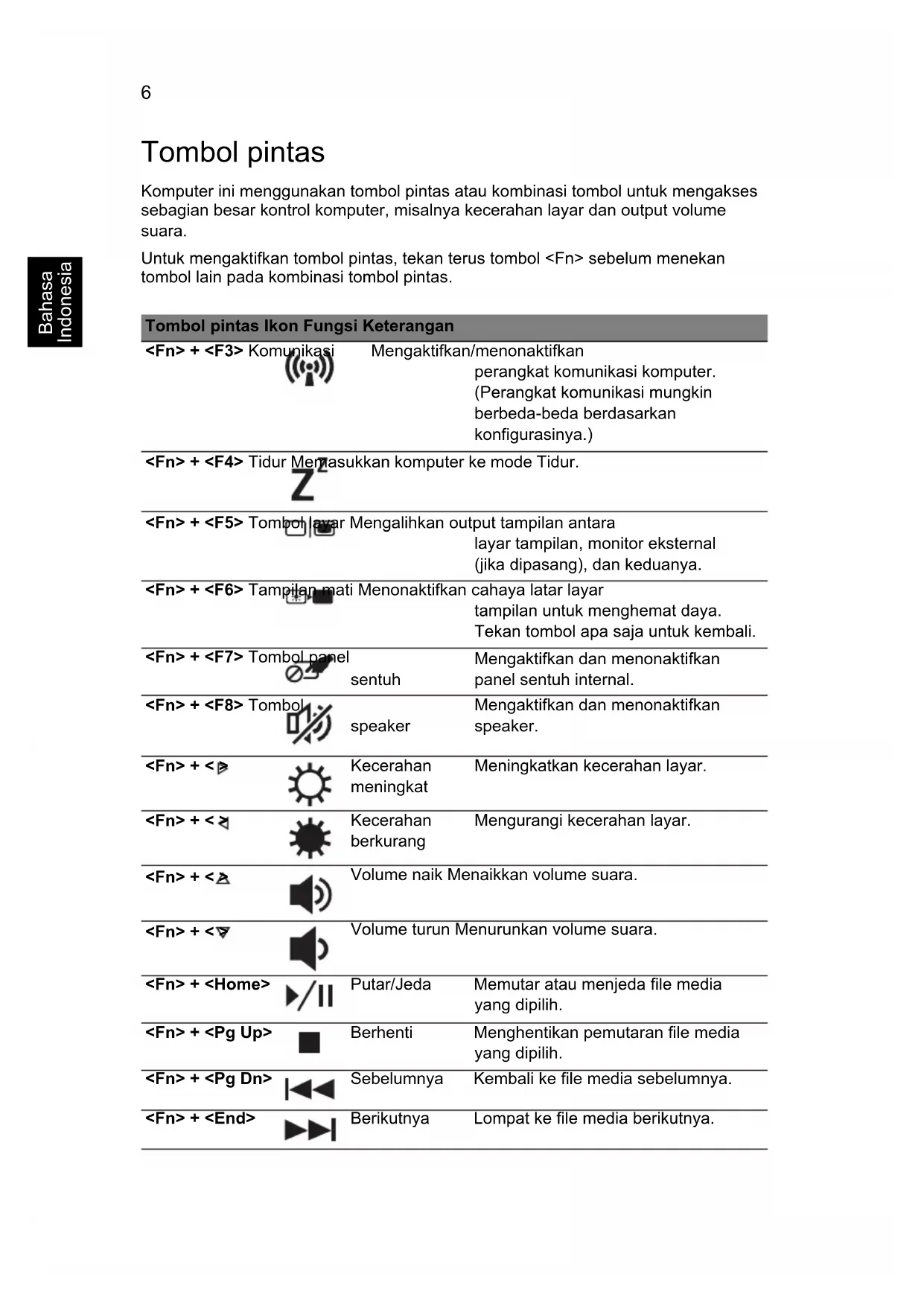 bila dalam mode AC. Indikator HDD Menunjukkan bila hard disk drive aktif. Indikator komunikasi Menunjukkan status perangkat konektivitas nirkabel komputer. 9 Tempat tangan Tempat nyaman untuk meletakkan tangan Anda sewaktu menggunakan komputer. 10 Pengeras suara Menghasilkan keluaran audio.6 Bahasa Indonesia Tombol pintas Komputer ini menggunakan tombol pintas atau kombinasi tombol untuk mengakses sebagian besar kontrol komputer, misalnya kecerahan layar dan output volume suara. Untuk mengaktifkan tombol pintas, tekan terus tombol <Fn> sebelum menekan tombol lain pada kombinasi tombol pintas. Tombol pintas Ikon Fungsi Keterangan <Fn> + <F3> Komunikasi Mengaktifkan/menonaktifkan perangkat komunikasi komputer. (Perangkat komunikasi mungkin berbeda-beda berdasarkan konfigurasinya.) <Fn> + <F4> Tidur Memasukkan komputer ke mode Tidur. <Fn> + <F5> Tombol layar Mengalihkan output tampilan antara layar tampilan, monitor eksternal (jika dipasang), dan keduanya. <Fn> + <F6> Tampilan mati Menonaktifkan cahaya latar layar tampilan untuk menghemat daya. Tekan tombol apa saja untuk kembali. <Fn> + <F7> Tombol panel sentuh Mengaktifkan dan menonaktifkan panel sentuh internal. <Fn> + <F8> Tombol speaker Mengaktifkan dan menonaktifkan speaker. <Fn> + < > Kecerahan meningkat Meningkatkan kecerahan layar. <Fn> + < > Kecerahan berkurang Mengurangi kecerahan layar. <Fn> + < > Volume naik Menaikkan volume suara. <Fn> + < > Volume turun Menurunkan volume suara. <Fn> + <Home> Putar/Jeda Memutar atau menjeda file media yang dipilih. <Fn> + <Pg Up> Berhenti Menghentikan pemutaran file media yang dipilih. <Fn> + <Pg Dn> Sebelumnya Kembali ke file media sebelumnya. <Fn> + <End> Berikutnya Lompat ke file media berikutnya.7 Bahasa Indonesia Pandangan depan tertutup Tampilan belakang # Ikon Item Keterangan 1 Jack mikrofon Menerima input dari mikrofon eksternal. Jack headphone/ speaker/line-out Menghubungkan ke perangkat line-out audio (mis. pengeras suara, headphone). 2 Pembaca kartu memori 2-in-1 Menerima Secure Digital (SD), MultiMediaCard (MMC). Catatan: Tekan untuk melepas/memasang kartu. Hanya satu kartu yang bisa beroperasi saat Anda menggunakannya. # Item Keterangan 1 Tempat baterai Tempat unit baterai komputer.