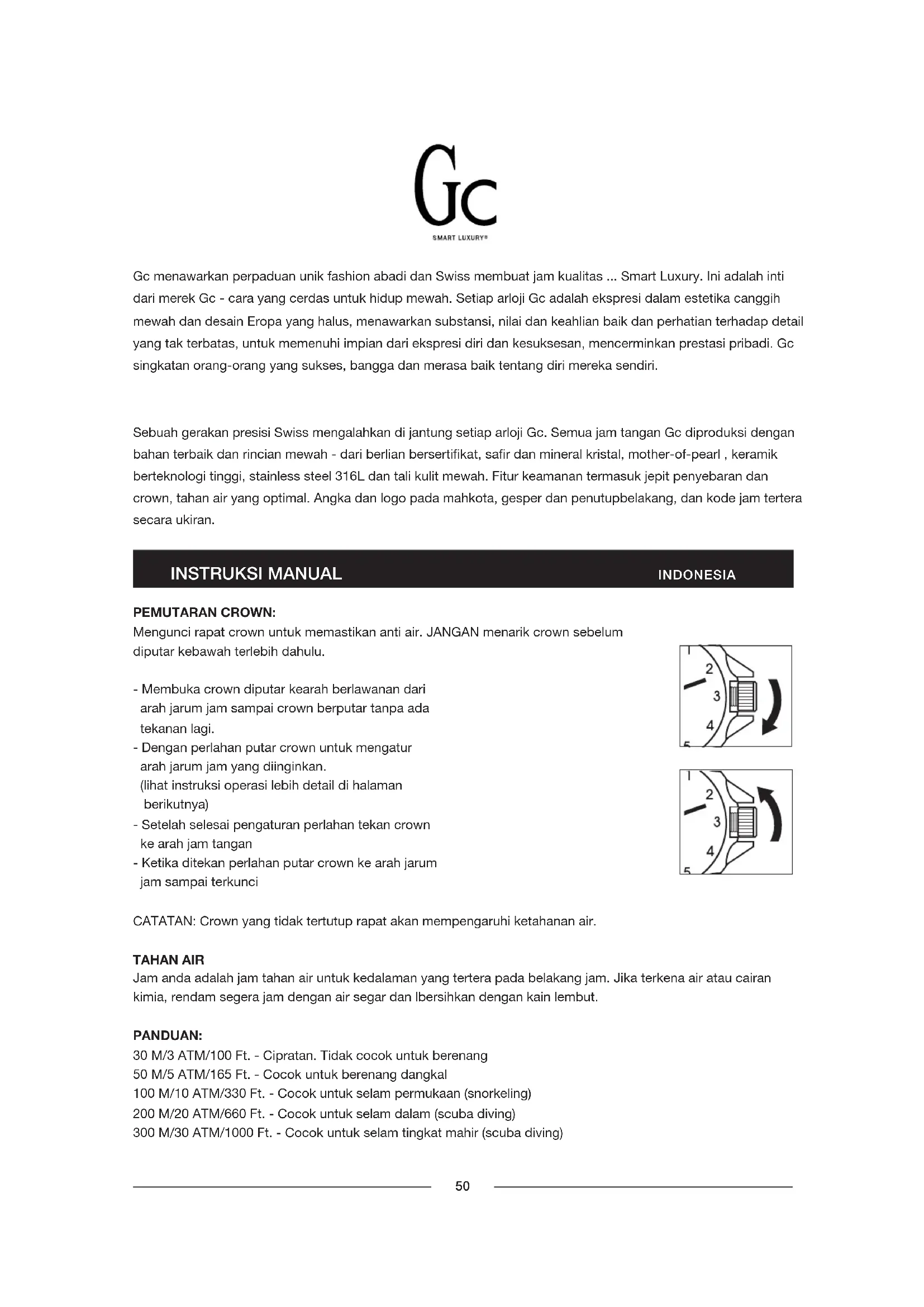 ——金属底部、表面镀膜手表的正常磨损 ——整个手表或零件失窃或遗失 *美国和加拿大保修期为10年 有关本说明书其他语言版本与官方服务中心完整列表,请浏览 Gcwatches.com 或使用本说明书背面的二维码。50 Gc menawarkan perpaduan unik fashion abadi dan Swiss membuat jam kualitas ... Smart Luxury. Ini adalah inti dari merek Gc - cara yang cerdas untuk hidup mewah. Setiap arloji Gc adalah ekspresi dalam estetika canggih mewah dan desain Eropa yang halus, menawarkan substansi, nilai dan keahlian baik dan perhatian terhadap detail yang tak terbatas, untuk memenuhi impian dari ekspresi diri dan kesuksesan, mencerminkan prestasi pribadi. Gc singkatan orang-orang yang sukses, bangga dan merasa baik tentang diri mereka sendiri. Sebuah gerakan presisi Swiss mengalahkan di jantung setiap arloji Gc. Semua jam tangan Gc diproduksi dengan bahan terbaik dan rincian mewah - dari berlian bersertikat, sar dan mineral kristal, mother-of-pearl , keramik berteknologi tinggi, stainless steel 316L dan tali kulit mewah. Fitur keamanan termasuk jepit penyebaran dan crown, tahan air yang optimal. Angka dan logo pada mahkota, gesper dan penutupbelakang, dan kode jam tertera secara ukiran. PEMUTARAN CROWN: Mengunci rapat crown untuk memastikan anti air. JANGAN menarik crown sebelum diputar kebawah terlebih dahulu. - Membuka crown diputar kearah berlawanan dari arah jarum jam sampai crown berputar tanpa ada tekanan lagi. - Dengan perlahan putar crown untuk mengatur arah jarum jam yang diinginkan. (lihat instruksi operasi lebih detail di halaman berikutnya) - Setelah selesai pengaturan perlahan tekan crown ke arah jam tangan - Ketika ditekan perlahan putar crown ke arah jarum jam sampai terkunci CATATAN: Crown yang tidak tertutup rapat akan mempengaruhi ketahanan air. TAHAN AIR Jam anda adalah jam tahan air untuk kedalaman yang tertera pada belakang jam. Jika terkena air atau cairan kimia, rendam segera jam dengan air segar dan lbersihkan dengan kain lembut. PANDUAN: 30 M/3 ATM/100 Ft. - Cipratan. Tidak cocok untuk berenang 50 M/5 ATM/165 Ft. - Cocok untuk berenang dangkal 100 M/10 ATM/330 Ft. - Cocok untuk selam permukaan (snorkeling) 200 M/20 ATM/660 Ft. - Cocok untuk selam dalam (scuba diving) 300 M/30 ATM/1000 Ft. - Cocok untuk selam tingkat mahir (scuba diving)