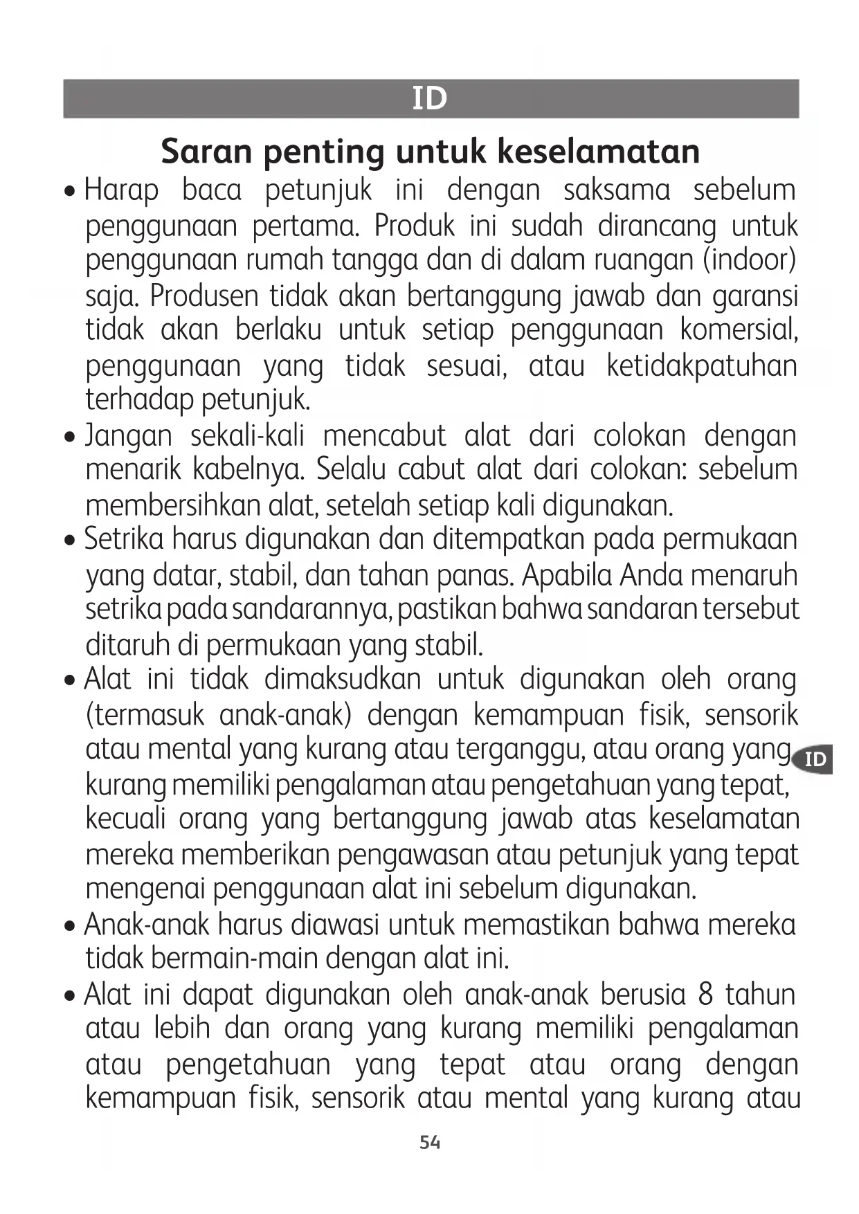 - Alat ini dapat digunakan oleh anak-anak berusia 8 tahun atau lebih dan orang yang kurang memiliki pengalaman atau pengetahuan yang tepat atau orang dengan kemampuan fisik, sensorik atau mental yang kurang atau ID55 terganggu sepanjang mereka telah diberi petunjuk yang menyeluruh mengenai penggunaan alat ini, mereka diawasi, dan memahami risiko yang ada. Anak-anak tidak boleh bermain-main dengan alat ini. Pembersihan dan pemeliharaan setrika tidak boleh dilakukan oleh anak-anak tanpa pengawasan. Jaga agar setrika dan kabelnya berada di luar jangkauan anak-anak yang berusia di bawah 8 tahun ketika setrika dipanaskan atau didinginkan.