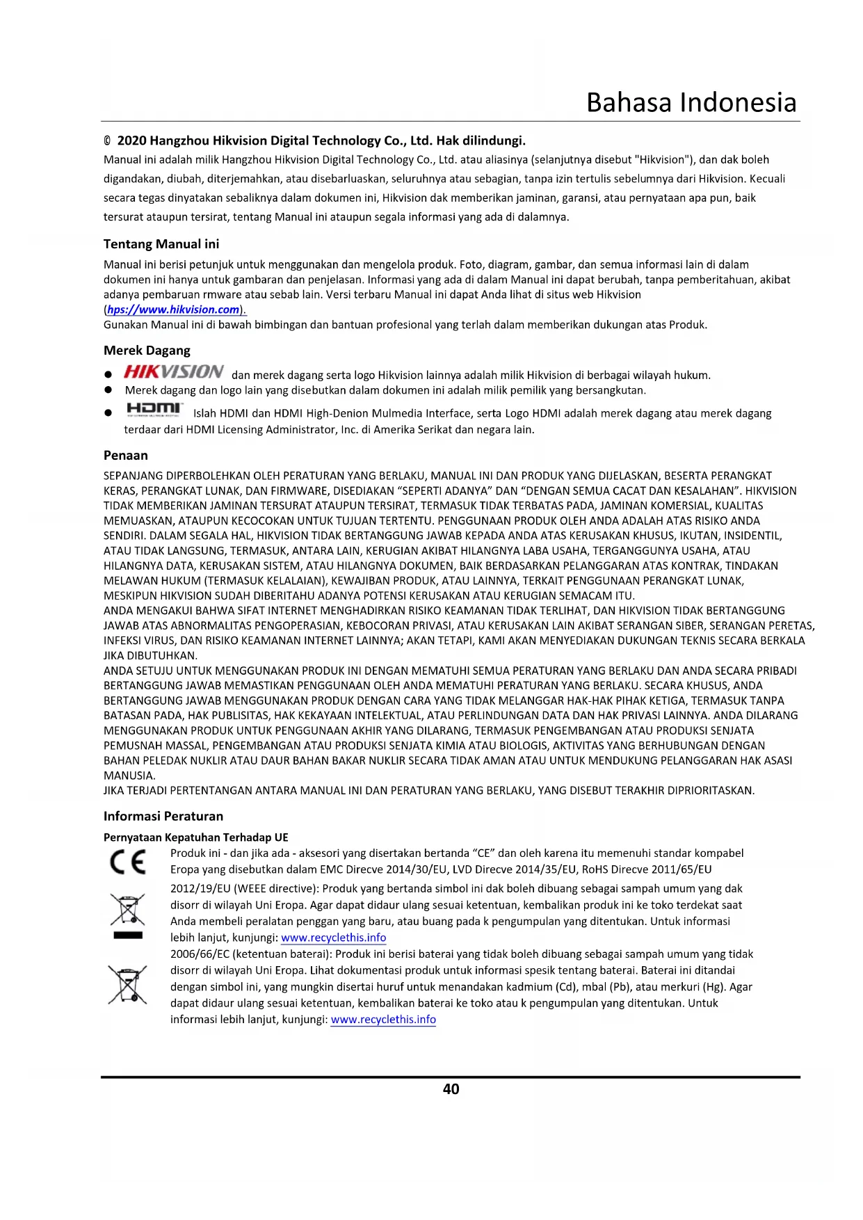 2006/66/EC (ketentuan baterai): Produk ini berisi baterai yang tidak boleh dibuang sebagai sampah umum yang tidak disortir di wilayah Uni Eropa. Lihat dokumentasi produk untuk informasi spesifik tentang baterai. Baterai ini ditandai dengan simbol ini, yang mungkin disertai huruf untuk menandakan kadmium (Cd), timbal (Pb), atau merkuri (Hg). Agar dapat didaur ulang sesuai ketentuan, kembalikan baterai ke toko atau titik pengumpulan yang ditentukan. Untuk informasi lebih lanjut, kunjungi: www.recyclethis.infoBahasa Indonesia