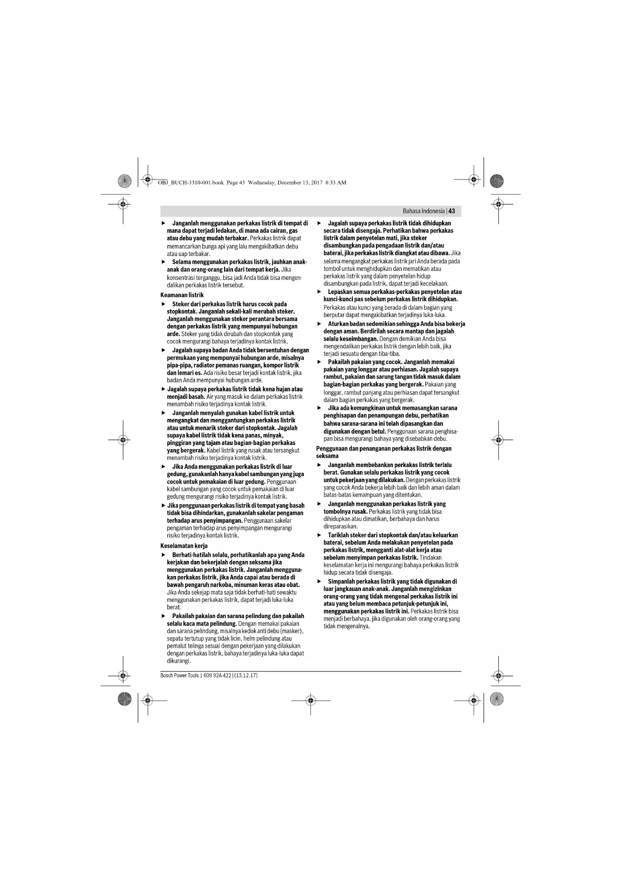 Bahasa Indonesia Petunjuk-Petunjuk untuk Keselamatan Kerja Petunjuk-Petunjuk Umum untuk Perkakas Listrik Bacalah semua petunjuk- petunjuk untuk keselamatan kerja dan petunjuk-petunjuk untuk penggunaan. Kesalahan dalam menjalankan petunjuk-petunjuk untuk keselamatan kerja dan petunjuk-petunjuk untuk penggunaan dapat mengakibatkan kontak listrik, kebakaran dan/atau luka- luka yang berat. Simpanlah semua petunjuk-petunjuk untuk keselamatan kerja dan petunjuk-petunjuk lainnya untuk penggunaan di masa depan. Kata „perkakas listrik“ yang disebutkan di dalam petunjuk- petunjuk untuk keselamatan kerja adalah sebutan untuk perkakas listrik pakai listrik jaringan (dengan kabel) dan untuk perkakas listrik tenaga baterai (tanpa kabel listrik). Keselamatan kerja di tempat kerja Jagalah supaya tempat kerja selalu bersih dan terang. Tempat kerja yang tidak rapi atau tidak terang dapat mengakibatkan terjadinya kecelakaan. PERHATIKANLAH OBJ_BUCH-3310-001.book Page 42 Wednesday, December 13, 2017 8:33 AMBahasa Indonesia | 43 Bosch Power Tools 1 609 92A 422 | (13.12.17) Janganlah menggunakan perkakas listrik di tempat di mana dapat terjadi ledakan, di mana ada cairan, gas atau debu yang mudah terbakar. Perkakas listrik dapat memancarkan bunga api yang lalu mengakibatkan debu atau uap terbakar. Selama menggunakan perkakas listrik, jauhkan anak- anak dan orang-orang lain dari tempat kerja. Jika konsentrasi terganggu, bisa jadi Anda tidak bisa mengen- dalikan perkakas listrik tersebut. Keamanan listrik Steker dari perkakas listrik harus cocok pada stopkontak. Janganlah sekali-kali merubah steker. Janganlah menggunakan steker perantara bersama dengan perkakas listrik yang mempunyai hubungan arde. Steker yang tidak dirubah dan stopkontak yang cocok mengurangi bahaya terjadinya kontak listrik. Jagalah supaya badan Anda tidak bersentuhan dengan permukaan yang mempunyai hubungan arde, misalnya pipa-pipa, radiator pemanas ruangan, kompor listrik dan lemari es. Ada risiko besar terjadi kontak listrik, jika badan Anda mempunyai hubungan arde. Jagalah supaya perkakas listrik tidak kena hujan atau menjadi basah. Air yang masuk ke dalam perkakas listrik menambah risiko terjadinya kontak listrik. Janganlah menyalah gunakan kabel listrik untuk mengangkat dan menggantungkan perkakas listrik atau untuk menarik steker dari stopkontak. Jagalah supaya kabel listrik tidak kena panas, minyak, pinggiran yang tajam atau bagian-bagian perkakas yang bergerak. Kabel listrik yang rusak atau tersangkut menambah risiko terjadinya kontak listrik. Jika Anda menggunakan perkakas listrik di luar gedung, gunakanlah hanya kabel sambungan yang juga cocok untuk pemakaian di luar gedung. Penggunaan kabel sambungan yang cocok untuk pemakaian di luar gedung mengurangi risiko terjadinya kontak listrik. Jika penggunaan perkakas listrik di tempat yang basah tidak bisa dihindarkan, gunakanlah sakelar pengaman terhadap arus penyimpangan. Penggunaan sakelar pengaman terhadap arus penyimpangan mengurangi risiko terjadinya kontak listrik. Keselamatan kerja Berhati-hatilah selalu, perhatikanlah apa yang Anda kerjakan dan bekerjalah dengan seksama jika menggunakan perkakas listrik. Janganlah mengguna- kan perkakas listrik, jika Anda capai atau berada di bawah pengaruh narkoba, minuman keras atau obat. Jika Anda sekejap mata saja tidak berhati-hati sewaktu menggunakan perkakas listrik, dapat terjadi luka-luka berat. Pakailah pakaian dan sarana pelindung dan pakailah selalu kaca mata pelindung. Dengan memakai pakaian dan sarana pelindung, misalnya kedok anti debu (masker), sepatu tertutup yang tidak licin, helm pelindung atau pemalut telinga sesuai dengan pekerjaan yang dilakukan dengan perkakas listrik, bahaya terjadinya luka-luka dapat dikurangi. Jagalah supaya perkakas listrik tidak dihidupkan secara tidak disengaja. Perhatikan bahwa perkakas listrik dalam penyetelan mati, jika steker disambungkan pada pengadaan listrik dan/atau baterai, jika perkakas listrik diangkat atau dibawa. Jika selama mengangkat perkakas listrik jari Anda berada pada tombol untuk menghidupkan dan mematikan atau perkakas listrik yang dalam penyetelan hidup disambungkan pada listrik, dapat terjadi kecelakaan. Lepaskan semua perkakas-perkakas penyetelan atau kunci-kunci pas sebelum perkakas listrik dihidupkan. Perkakas atau kunci yang berada di dalam bagian yang berputar dapat mengakibatkan terjadinya luka-luka. Aturkan badan sedemikian sehingga Anda bisa bekerja dengan aman. Berdirilah secara mantap dan jagalah selalu keseimbangan. Dengan demikian Anda bisa mengendalikan perkakas listrik dengan lebih baik, jika terjadi sesuatu dengan tiba-tiba. Pakailah pakaian yang cocok. Janganlah memakai pakaian yang longgar atau perhiasan. Jagalah supaya rambut, pakaian dan sarung tangan tidak masuk dalam bagian-bagian perkakas yang bergerak. Pakaian yang longgar, rambut panjang atau perhiasan dapat tersangkut dalam bagian perkakas yang bergerak. Jika ada kemungkinan untuk memasangkan sarana penghisapan dan penampungan debu, perhatikan bahwa sarana-sarana ini telah dipasangkan dan digunakan dengan betul. Penggunaan sarana penghisa- pan bisa mengurangi bahaya yang disebabkan debu. Penggunaan dan penanganan perkakas listrik dengan seksama Janganlah membebankan perkakas listrik terlalu berat. Gunakan selalu perkakas listrik yang cocok untuk pekerjaan yang dilakukan. Dengan perkakas listrik yang cocok Anda bekerja lebih baik dan lebih aman dalam batas-batas kemampuan yang ditentukan. Janganlah menggunakan perkakas listrik yang tombolnya rusak. Perkakas listrik yang tidak bisa dihidupkan atau dimatikan, berbahaya dan harus direparasikan. Tariklah steker dari stopkontak dan/atau keluarkan baterai, sebelum Anda melakukan penyetelan pada perkakas listrik, mengganti alat-alat kerja atau sebelum menyimpan perkakas listrik. Tindakan keselamatan kerja ini mengurangi bahaya perkakas listrik hidup secara tidak disengaja. Simpanlah perkakas listrik yang tidak digunakan di luar jangkauan anak-anak. Janganlah