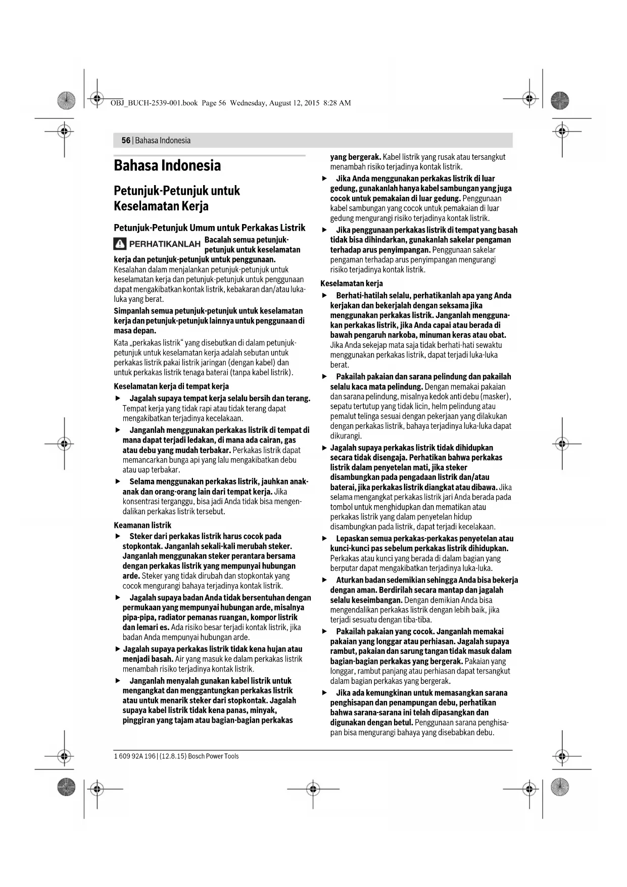 OBJ_BUCH-2539-001.book Page 55 Wednesday, August 12, 2015 8:28 AM56 | Bahasa Indonesia 1 609 92A 196 | (12.8.15) Bosch Power Tools Bahasa Indonesia Petunjuk-Petunjuk untuk Keselamatan Kerja Petunjuk-Petunjuk Umum untuk Perkakas Listrik Bacalah semua petunjuk- petunjuk untuk keselamatan kerja dan petunjuk-petunjuk untuk penggunaan. Kesalahan dalam menjalankan petunjuk-petunjuk untuk keselamatan kerja dan petunjuk-petunjuk untuk penggunaan dapat mengakibatkan kontak listrik, kebakaran dan/atau luka- luka yang berat. Simpanlah semua petunjuk-petunjuk untuk keselamatan kerja dan petunjuk-petunjuk lainnya untuk penggunaan di masa depan. Kata „perkakas listrik“ yang disebutkan di dalam petunjuk- petunjuk untuk keselamatan kerja adalah sebutan untuk perkakas listrik pakai listrik jaringan (dengan kabel) dan untuk perkakas listrik tenaga baterai (tanpa kabel listrik). Keselamatan kerja di tempat kerja Jagalah supaya tempat kerja selalu bersih dan terang. Tempat kerja yang tidak rapi atau tidak terang dapat mengakibatkan terjadinya kecelakaan. Janganlah menggunakan perkakas listrik di tempat di mana dapat terjadi ledakan, di mana ada cairan, gas atau debu yang mudah terbakar. Perkakas listrik dapat memancarkan bunga api yang lalu mengakibatkan debu atau uap terbakar. Selama menggunakan perkakas listrik, jauhkan anak- anak dan orang-orang lain dari tempat kerja. Jika konsentrasi terganggu, bisa jadi Anda tidak bisa mengen- dalikan perkakas listrik tersebut. Keamanan listrik Steker dari perkakas listrik harus cocok pada stopkontak. Janganlah sekali-kali merubah steker. Janganlah menggunakan steker perantara bersama dengan perkakas listrik yang mempunyai hubungan arde. Steker yang tidak dirubah dan stopkontak yang cocok mengurangi bahaya terjadinya kontak listrik. Jagalah supaya badan Anda tidak bersentuhan dengan permukaan yang mempunyai hubungan arde, misalnya pipa-pipa, radiator pemanas ruangan, kompor listrik dan lemari es. Ada risiko besar terjadi kontak listrik, jika badan Anda mempunyai hubungan arde. Jagalah supaya perkakas listrik tidak kena hujan atau menjadi basah. Air yang masuk ke dalam perkakas listrik menambah risiko terjadinya kontak listrik. Janganlah menyalah gunakan kabel listrik untuk mengangkat dan menggantungkan perkakas listrik atau untuk menarik steker dari stopkontak. Jagalah supaya kabel listrik tidak kena panas, minyak, pinggiran yang tajam atau bagian-bagian perkakas yang bergerak. Kabel listrik yang rusak atau tersangkut menambah risiko terjadinya kontak listrik. Jika Anda menggunakan perkakas listrik di luar gedung, gunakanlah hanya kabel sambungan yang juga cocok untuk pemakaian di luar gedung. Penggunaan kabel sambungan yang cocok untuk pemakaian di luar gedung mengurangi risiko terjadinya kontak listrik. Jika penggunaan perkakas listrik di tempat yang basah tidak bisa dihindarkan, gunakanlah sakelar pengaman terhadap arus penyimpangan. Penggunaan sakelar pengaman terhadap arus penyimpangan mengurangi risiko terjadinya kontak listrik. Keselamatan kerja Berhati-hatilah selalu, perhatikanlah apa yang Anda kerjakan dan bekerjalah dengan seksama jika menggunakan perkakas listrik. Janganlah mengguna- kan perkakas listrik, jika Anda capai atau berada di bawah pengaruh narkoba, minuman keras atau obat. Jika Anda sekejap mata saja tidak berhati-hati sewaktu menggunakan perkakas listrik, dapat terjadi luka-luka berat. Pakailah pakaian dan sarana pelindung dan pakailah selalu kaca mata pelindung. Dengan memakai pakaian dan sarana pelindung, misalnya kedok anti debu (masker), sepatu tertutup yang tidak licin, helm pelindung atau pemalut telinga sesuai dengan pekerjaan yang dilakukan dengan perkakas listrik, bahaya terjadinya luka-luka dapat dikurangi.