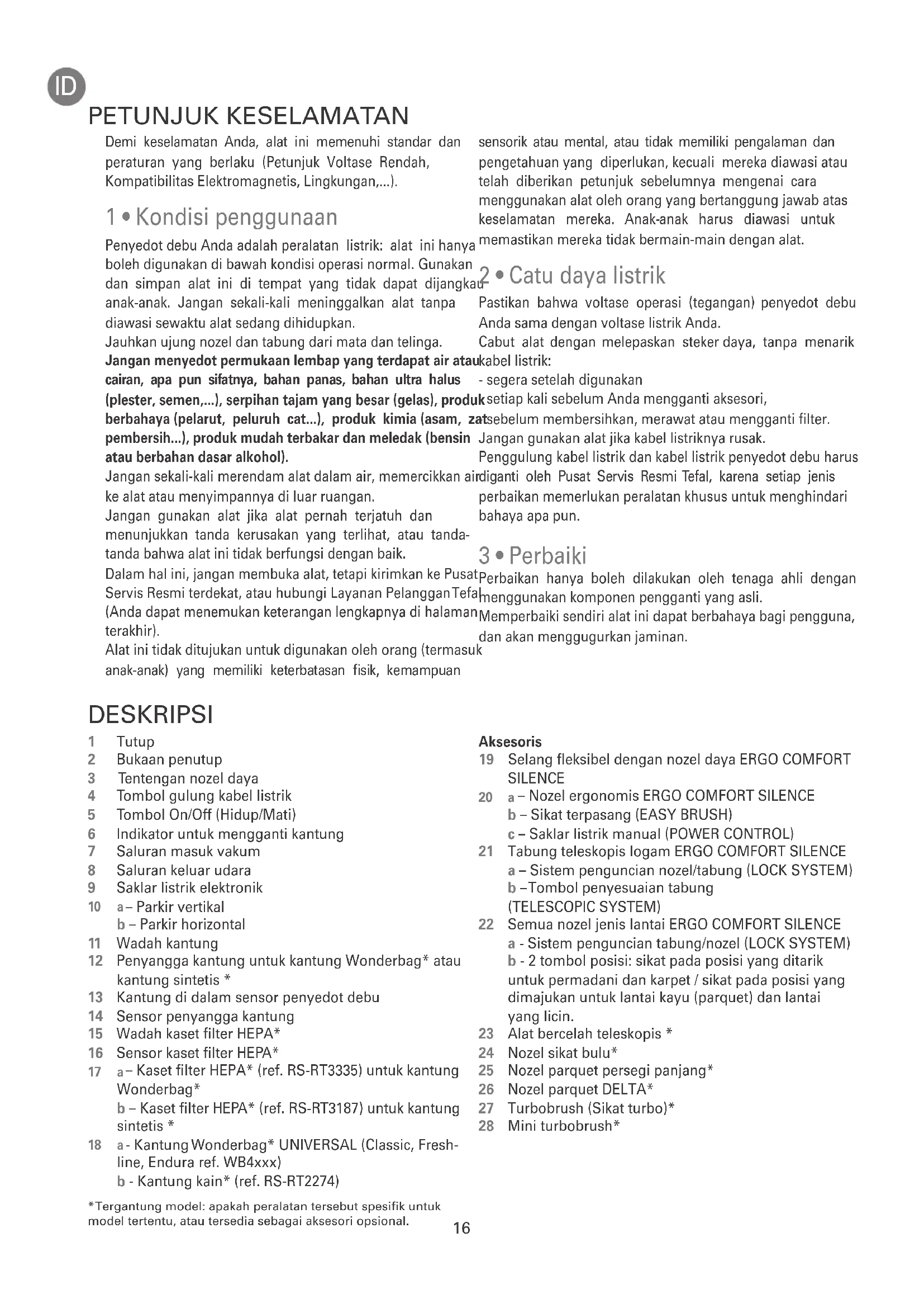1 • Membongkar kemasan Bongkar kemasan alat dan lepaskan stiker apa pun yang tidak diinginkan. Simpan formulir jaminan dan baca petunjuknya secara saksama sebelum menggunakan alat untuk pertama kali. 2 • Saran dan tindakan pencegahan Tiap kali sebelum digunakan, gulungan kabel listrik harus dibuka seluruhnya. Jangan sampai membelit dan jangan bersinggungan dengan bagian tepi yang tajam. Jika menggunakan sambungan listrik, periksa apakah kondisinya sempurna dan sesuai dengan daya alat penyedot debu Anda. Jangan sekali-kali mencabut alat dengan menarik kabel listriknya. Jangan sekali-kali mengoperasikan alat penyedot debu tanpa kantung dan tanpa sistem filtrasi (kaset). Demi ketenangan pikiran Anda, alat penyedot debu dilengkapi dengan dua sistem pengecekan keselamatan: untuk kantung (13 & 14) dan untuk kaset filter HEPA* (16). Jangan menggerakan alat penyedot debu dengan menarik kabel listriknya, alat harus digerakkan dengan menggunakan pegangan jinjingannya. Jangan gunakan kabel listrik untuk mengangkat alat. Matikan dan cabut alat penyedot debu setiap kali Anda selesai menggunakannya. Selalu matikan dan cabut alat penyedot debu sebelum melakukan perawatan atau membersihkannya. Hanya gunakan kantung dan filter Tefal atau Wonderbag yang asli. Hanya gunakan aksesori asli Tefal. Periksa apakah semua filter sudah terpasang dengan benar di tempatnya. Jika mengalami kesulitan untuk mendapatkan aksesori dan filter untuk alat penyedot debu ini, silakan menghubungi layanan pelanggan Tefal (Anda dapat menemukan keterangan mereka selengkapnya pada halaman terakhir).