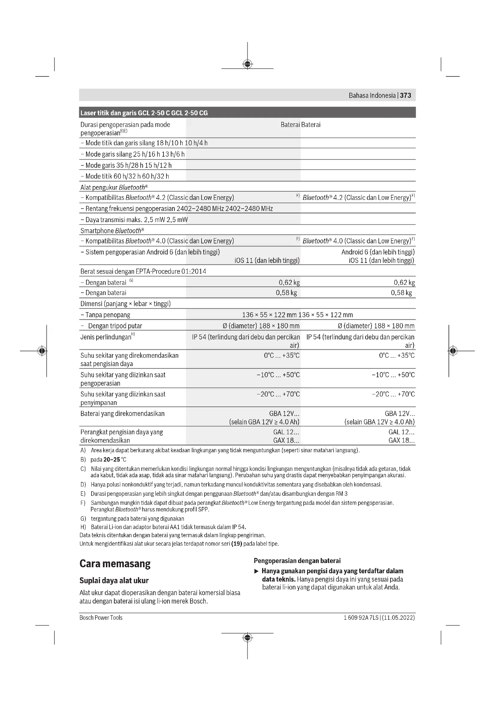 pada 20–25°C C) Nilai yang ditentukan memerlukan kondisi lingkungan normal hingga kondisi lingkungan menguntungkan (misalnya tidak ada getaran, tidak ada kabut, tidak ada asap, tidak ada sinar matahari langsung). Perubahan suhu yang drastis dapat menyebabkan penyimpangan akurasi. D) Hanya polusi nonkonduktif yang terjadi, namun terkadang muncul konduktivitas sementara yang disebabkan oleh kondensasi. E) Durasi pengoperasian yang lebih singkat dengan penggunaan Bluetooth® dan/atau disambungkan dengan RM 3 F) Sambungan mungkin tidak dapat dibuat pada perangkat Bluetooth® Low Energy tergantung pada model dan sistem pengoperasian. Perangkat Bluetooth® harus mendukung profil SPP. G) tergantung pada baterai yang digunakan H) Baterai Li-ion dan adaptor baterai AA1 tidak termasuk dalam IP54. Data teknis ditentukan dengan baterai yang termasuk dalam lingkup pengiriman. Untuk mengidentifikasi alat ukur secara jelas terdapat nomor seri (19) pada label tipe. Cara memasang Suplai daya alat ukur Alat ukur dapat dioperasikan dengan baterai komersial biasa atau dengan baterai isi ulang li‑ion merek Bosch. Pengoperasian dengan baterai u Hanya gunakan pengisi daya yang terdaftar dalam data teknis. Hanya pengisi daya ini yang sesuai pada baterai li‑ion yang dapat digunakan untuk alat Anda. Bosch Power Tools 1 609 92A 7LS | (11.05.2022)374 | Bahasa Indonesia Catatan: Menggunakan baterai yang tidak sesuai untuk alat ukur dapat menyebabkan kegagalan fungsi atau kerusakan pada alat ukur. Catatan: Baterai dikirim dalam keadaan terisi daya sebagian. Untuk menjamin daya penuh baterai, sebelum menggunakan untuk pertama kali, isilah daya baterai hingga penuh pada pengisi daya. Baterai Li-ion dapat diisi setiap saat tanpa mengurangi masa pakainya. Baterai tidak menjadi rusak jika pengisiannya dihentikan untuk sementara waktu. Baterai Li-ion terlindung dari pengosongan daya total dengan "Electronic Cell Protection (ECP)". Jika baterai isi ulang kosong, alat ukur akan dimatikan oleh pengaman. u Jangan menyalakan kembali alat ukur setelah dimatikan oleh sirkuit pelindung. Baterai dapat rusak. Untuk memasang baterai yang telah terisi daya (12) masukkan baterai ke dalam kompartemen (11) hingga terkunci. Untuk melepas baterai (12) tekan tombol pelepas (15) dan keluarkan baterai dari kompartemen baterai (11). Jangan melepas baterai dengan paksa. Pengoperasian dengan baterai Untuk pengoperasian alat ukur disarankan memakai baterai mangan alkali. Baterai dimasukkan ke dalam adaptor baterai. u Adaptor baterai hanya untuk digunakan pada alat ukur Bosch yang disediakan dan tidak boleh digunakan dengan perkakas listrik. Untuk memasang baterai geser rangka (13) adaptor baterai ke dalam kompartemen baterai (11). Masukkan baterai seperti ilustrasi yang terdapat pada tutup (16) ke dalam rangka. Geser tutup di atas rangka hingga tutup terkunci. Untuk melepas baterai (14) tekan tombol pelepas (15) tutup (16) dan lepas tutup. Pada saat melepas, pastikan baterai tidak terjatuh. Untuk itu, pegang alat ukur dengan mengarahkan kompartemen baterai (11) ke atas. Lepaskan baterai. Untuk melepaskan rangka yang terpasang di dalam (13) dari kompartemen baterai, pegang kerangka dan tarik keluar dari alat ukur dengan menekan secara perlahan pada sisi samping. Selalu ganti semua baterai sekaligus. Hanya gunakan baterai dari produsen dan dengan kapasitas yang sama. u Keluarkan baterai dari alat pengukur jika tidak digunakan dalam waktu yang lama. Jika baterai disimpan di dalam alat pengukur untuk waktu yang lama, baterai dapat berkarat dan dayanya akan habis dengan sendirinya. Indikator level baterai Indikator level pengisian daya baterai(4) menunjukkan level pengisian daya baterai: LED Level pengisian daya Lampu permanen hijau 100–75% LED Level pengisian daya Lampu permanen kuning 75–35% Lampu berkedip merah <35% Tidak ada lampu – Baterai rusak – Baterai kosong Jika baterai lemah, kecerahan garis laser akan menurun perlahan. Segera ganti baterai yang rusak atau yang kosong. Bekerja dengan dudukan putarRM2 (lihatgambarA1–A3) Dengan bantuan tripod putar(23), alat pengukur dapat diputar sebesar 360° pada titik pusat yang selalu terlihat. Untuk itu, garis laser dapat diatur tanpa mengubah posisi alat pengukur. Garis laser vertikal dapat disesuaikan dengan akurat pada titik acuan dengan sekrup penyetel(24). Letakkan alat pengukur dengan menggunakan slot pemandu(1) pada rel pemandu(20) tripod putar(23), dan geser alat pengukur pada platform hingga maksimal. Untuk melepas, tarik alat pengukur dari tripod putar ke arah berlawanan. Pilihan posisi tripod putar: – berdiri di atas tempat datar, – dipasang di tempat miring, – dihubungkan dengan penjepit(25) pada lis profil dari logam, – dengan bantuan magnet(21) di permukaan logam. Penggunaan Cara penggunaan u Lindungilah alat ukur dari cairan dan sinar matahari langsung. u Jauhkan alat pengukur dari suhu atau perubahan suhu yang ekstrem. Jangan biarkan alat pengukur berada terlalu lama di dalam kendaraan. Saat perubahan suhu besar, biarkan alat ukur menyesuaikan suhu lingkungan terlebih dulu dan selalu lakukan pemeriksaan akurasi sebelum melanjutkan pekerjaan dengan (lihat „Pemeriksaan keakuratan alat ukur“, Halaman377). Pada suhu atau perubahan suhu ekstrem, ketepatan alat pengukur dapat terganggu. u Hindari guncangan atau benturan yang keras pada alat ukur. Apabila setelah terjadi pengaruh eksternal yang kuat pada alat ukur, disarankan untuk memeriksa akurasi alat ukur sebelum digunakan kembali (lihat „Pemeriksaan keakuratan alat ukur“, Halaman377). u Matikan alat ukur saat memindahkan. Jika alat ukur dimatikan, unit pendulum akan terkunci yang dapat rusak jika terkena guncangan. 1 609 92A 7LS | (11.05.2022) Bosch Power ToolsBahasa Indonesia | 375 Mengaktifkan/menonaktifkan perkakas listrik Untuk menghidupkan alat pengukur, geser tombol on/ off(2) pada posisi On (untuk bekerja dengan penguncian pendulum) atau pada posisi On (untuk bekerja dengan perataan otomatis). Alat p