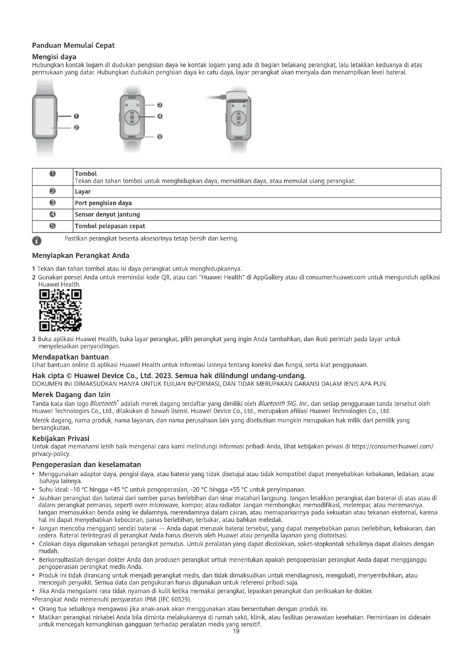 Tombol pelepasan cepat Pastikan perangkat beserta aksesorinya tetap bersih dan kering. Menyiapkan Perangkat Anda 1 Tekan dan tahan tombol atau isi daya perangkat untuk menghidupkannya. 2 Gunakan ponsel Anda untuk memindai kode QR, atau cari "Huawei Health" di AppGallery atau di consumer.huawei.com untuk mengunduh aplikasi Huawei Health. 3 Buka aplikasi Huawei Health, buka layar perangkat, pilih perangkat yang ingin Anda tambahkan, dan ikuti perintah pada layar untuk menyelesaikan penyandingan. Mendapatkan bantuan Lihat bantuan online di aplikasi Huawei Health untuk informasi lainnya tentang koneksi dan fungsi, serta kiat penggunaan. Hak cipta © Huawei Device Co., Ltd. 2023. Semua hak dilindungi undang-undang. DOKUMEN INI DIMAKSUDKAN HANYA UNTUK TUJUAN INFORMASI, DAN TIDAK MERUPAKAN GARANSI DALAM JENIS APA PUN. Merek Dagang dan Izin Tanda kata dan logo Bluetooth