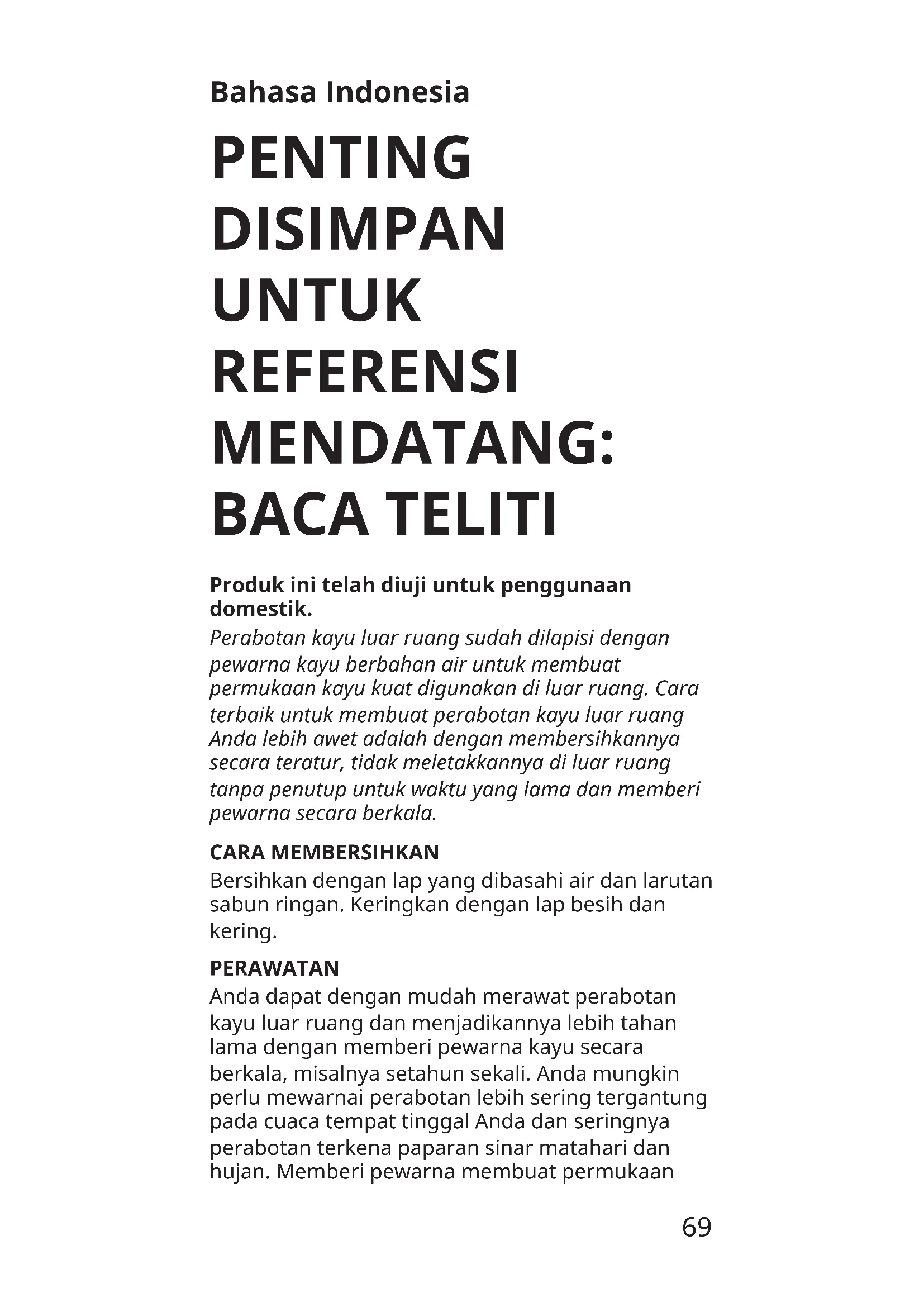家具の安定性を高めるため、季節ごとに少なくとも1 回はネジを締め直してください。69 Bahasa Indonesia PENTING DISIMPAN UNTUK REFERENSI MENDATANG: BACA TELITI Produk ini telah diuji untuk penggunaan domestik. Perabotan kayu luar ruang sudah dilapisi dengan pewarna kayu berbahan air untuk membuat permukaan kayu kuat digunakan di luar ruang. Cara terbaik untuk membuat perabotan kayu luar ruang Anda lebih awet adalah dengan membersihkannya secara teratur, tidak meletakkannya di luar ruang tanpa penutup untuk waktu yang lama dan memberi pewarna secara berkala. CARA MEMBERSIHKAN Bersihkan dengan lap yang dibasahi air dan larutan sabun ringan. Keringkan dengan lap besih dan kering. PERAWATAN Anda dapat dengan mudah merawat perabotan kayu luar ruang dan menjadikannya lebih tahan lama dengan memberi pewarna kayu secara berkala, misalnya setahun sekali. Anda mungkin perlu mewarnai perabotan lebih sering tergantung pada cuaca tempat tinggal Anda dan seringnya perabotan terkena paparan sinar matahari dan hujan. Memberi pewarna membuat permukaan70 tidak kering dan menjaga air masuk ke dalam kayu. Untuk perabotan yang disimpan di luar ruang, saat terbaik untuk mewarnai kembali adalah jika air hujan langsung terserap ke dalam kayu dan air tidak lagi terkumpul di permukaannya. Cara mewarnai ulang: Pilih tempat di tempat teduh untuk membersihkan, mewarnai ulang dan mengeringkan perabotan. Hindari sinar matahari langsung.