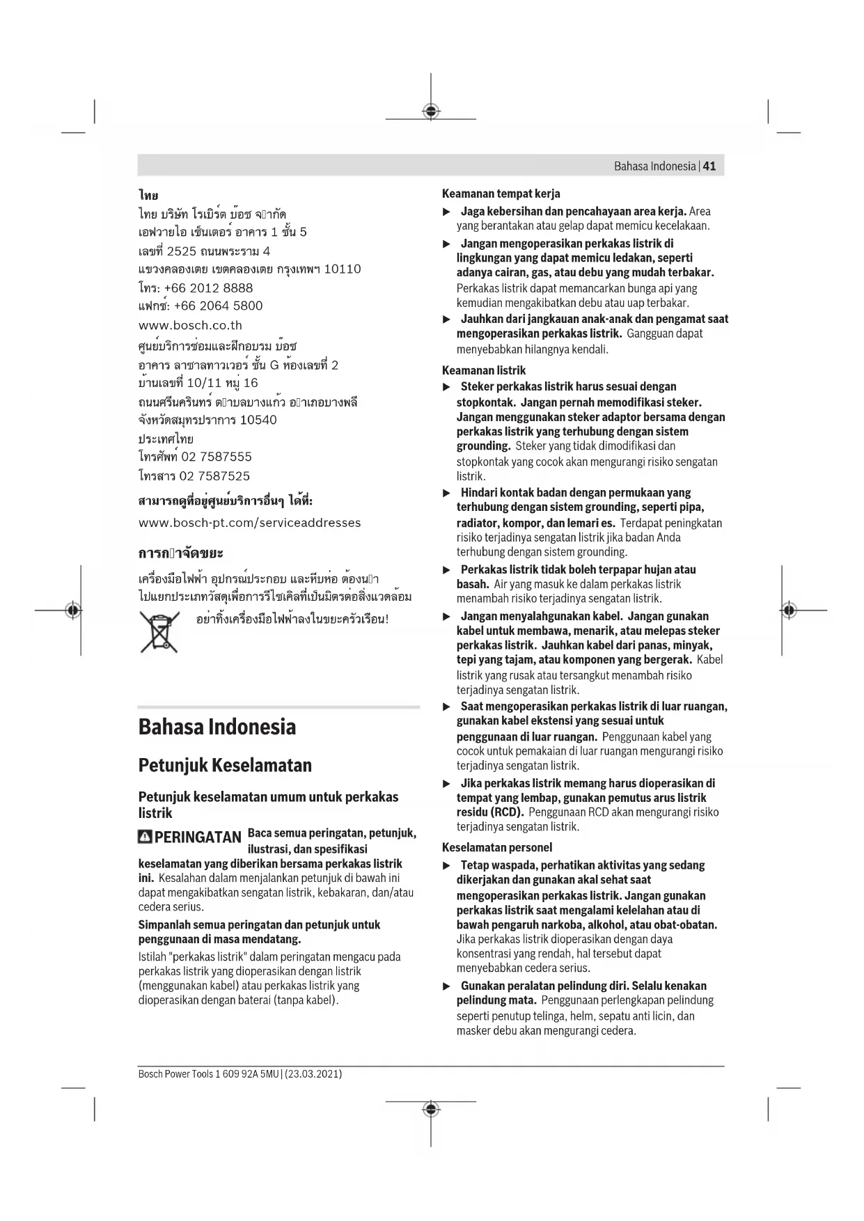 โทรศัพท์ 02 7587555 โทรสาร 02 7587525 สามารถดูที่อยู่ศูนย์บริการอื่นๆ ได้ที่: www.bosch-pt.com/serviceaddresses การกำจัดขยะ เครื่องมือไฟฟ้า อุปกรณ์ประกอบ และหีบห่อ ต้องนำ ไปแยกประเภทวัสดุเพื่อการรีไซเคิลที่เป็นมิตรต่อสิ่งแวดล้อม อย่าทิ้งเครื่องมือไฟฟ้าลงในขยะครัวเรือน! Bahasa Indonesia Petunjuk Keselamatan Petunjuk keselamatan umum untuk perkakas listrik PERINGATAN Baca semua peringatan, petunjuk, ilustrasi, dan spesifikasi keselamatan yang diberikan bersama perkakas listrik ini. Kesalahan dalam menjalankan petunjuk di bawah ini dapat mengakibatkan sengatan listrik, kebakaran, dan/atau cedera serius. Simpanlah semua peringatan dan petunjuk untuk penggunaan di masa mendatang. Istilah "perkakas listrik" dalam peringatan mengacu pada perkakas listrik yang dioperasikan dengan listrik (menggunakan kabel) atau perkakas listrik yang dioperasikan dengan baterai (tanpa kabel). Keamanan tempat kerja u Jaga kebersihan dan pencahayaan area kerja. Area yang berantakan atau gelap dapat memicu kecelakaan. u Jangan mengoperasikan perkakas listrik di lingkungan yang dapat memicu ledakan, seperti adanya cairan, gas, atau debu yang mudah terbakar. Perkakas listrik dapat memancarkan bunga api yang kemudian mengakibatkan debu atau uap terbakar. u Jauhkan dari jangkauan anak-anak dan pengamat saat mengoperasikan perkakas listrik. Gangguan dapat menyebabkan hilangnya kendali. Keamanan listrik u Steker perkakas listrik harus sesuai dengan stopkontak. Jangan pernah memodifikasi steker. Jangan menggunakan steker adaptor bersama dengan perkakas listrik yang terhubung dengan sistem grounding. Steker yang tidak dimodifikasi dan stopkontak yang cocok akan mengurangi risiko sengatan listrik. u Hindari kontak badan dengan permukaan yang terhubung dengan sistem grounding, seperti pipa, radiator, kompor, dan lemari es. Terdapat peningkatan risiko terjadinya sengatan listrik jika badan Anda terhubung dengan sistem grounding. u Perkakas listrik tidak boleh terpapar hujan atau basah. Air yang masuk ke dalam perkakas listrik menambah risiko terjadinya sengatan listrik. u Jangan menyalahgunakan kabel. Jangan gunakan kabel untuk membawa, menarik, atau melepas steker perkakas listrik. Jauhkan kabel dari panas, minyak, tepi yang tajam, atau komponen yang bergerak. Kabel listrik yang rusak atau tersangkut menambah risiko terjadinya sengatan listrik. u Saat mengoperasikan perkakas listrik di luar ruangan, gunakan kabel ekstensi yang sesuai untuk penggunaan di luar ruangan. Penggunaan kabel yang cocok untuk pemakaian di luar ruangan mengurangi risiko terjadinya sengatan listrik. u Jika perkakas listrik memang harus dioperasikan di tempat yang lembap, gunakan pemutus arus listrik residu (RCD). Penggunaan RCD akan mengurangi risiko terjadinya sengatan listrik. Keselamatan personel u Tetap waspada, perhatikan aktivitas yang sedang dikerjakan dan gunakan akal sehat saat mengoperasikan perkakas listrik. Jangan gunakan perkakas listrik saat mengalami kelelahan atau di bawah pengaruh narkoba, alkohol, atau obat-obatan. Jika perkakas listrik dioperasikan dengan daya konsentrasi yang rendah, hal tersebut dapat menyebabkan cedera serius. u Gunakan peralatan pelindung diri. Selalu kenakan pelindung mata. Penggunaan perlengkapan pelindung seperti penutup telinga, helm, sepatu anti licin, dan masker debu akan mengurangi cedera. Bosch Power Tools 1 609 92A 5MU | (23.03.2021)42 | Bahasa Indonesia u Hindari start yang tidak disengaja. Pastikan switch berada di posisi off sebelum perkakas listrik dihubungkan ke sumber daya listrik dan/atau baterai, diangkat, atau dibawa. Membawa perkakas listrik dengan jari menempel pada tombol atau perkakas listrik dalam keadaan hidup dapat memicu kecelakaan. u Singkirkan kunci penyetel atau kunci pas sebelum menghidupkan perkakas listrik. Perkakas atau kunci pas yang masih menempel pada komponen perkakas listrik yang berputar dapat menyebabkan cedera. u Jangan melampaui batas. Berdirilah secara mantap dan selalu jaga keseimbangan. Hal ini akan memberikan kontrol yang lebih baik terhadap perkakas listrik pada situasi yang tak terduga. u Kenakan pakaian dengan wajar. Jangan mengenakan perhiasan atau pakaian yang longgar. Jauhkan rambut dan pakaian dari komponen yang bergerak. Pakaian yang longgar, rambut panjang, atau perhiasan dapat tersangkut dalam komponen yang bergerak. u Jika disediakan perangkat untuk sambungan pengisapan debu dan alat pengumpulan, pastikan perangkat tersebut terhubung dan digunakan dengan benar. Penggunaan alat pengumpulan dapat mengurangi bahaya yang disebabkan oleh debu. u Jangan berpuas diri dan mengabaikan prinsip keselamatan karena terbiasa mengoperasikan perkakas. Tindakan yang kurang hati-hati dapat mengakibatkan cedera serius dalam waktu sepersekian detik. Penggunaan dan pemeliharaan perkakas listrik u Jangan memaksakan perkakas listrik. Gunakan perkakas listrik yang sesuai untuk pekerjaan yang dilakukan. Perkakas listrik yang sesuai akan bekerja dengan lebih baik dan aman sesuai tujuan penggunaan. u Jangan gunakan perkakas listrik dengan switch yang tidak dapat dioperasikan. Perkakas listrik yang switchnya yang tidak berfungsi dapat menimbulkan bahaya dan harus diperbaiki. u Lepaskan steker dari sumber listrik dan/atau lepas baterai, jika dapat dilepaskan dari perkakas listrik sebelum menyetel, mengganti aksesori, atau menyimpan perkakas listrik. Tindakan preventif akan mengurangi risiko menghidupkan perkakas listrik secara tidak disengaja. u Jauhkan dan simpan perkakas listrik dari jangkauan anak-anak dan jangan biarkan orang-orang yang tidak mengetahui cara menggunakan perkakas listrik,