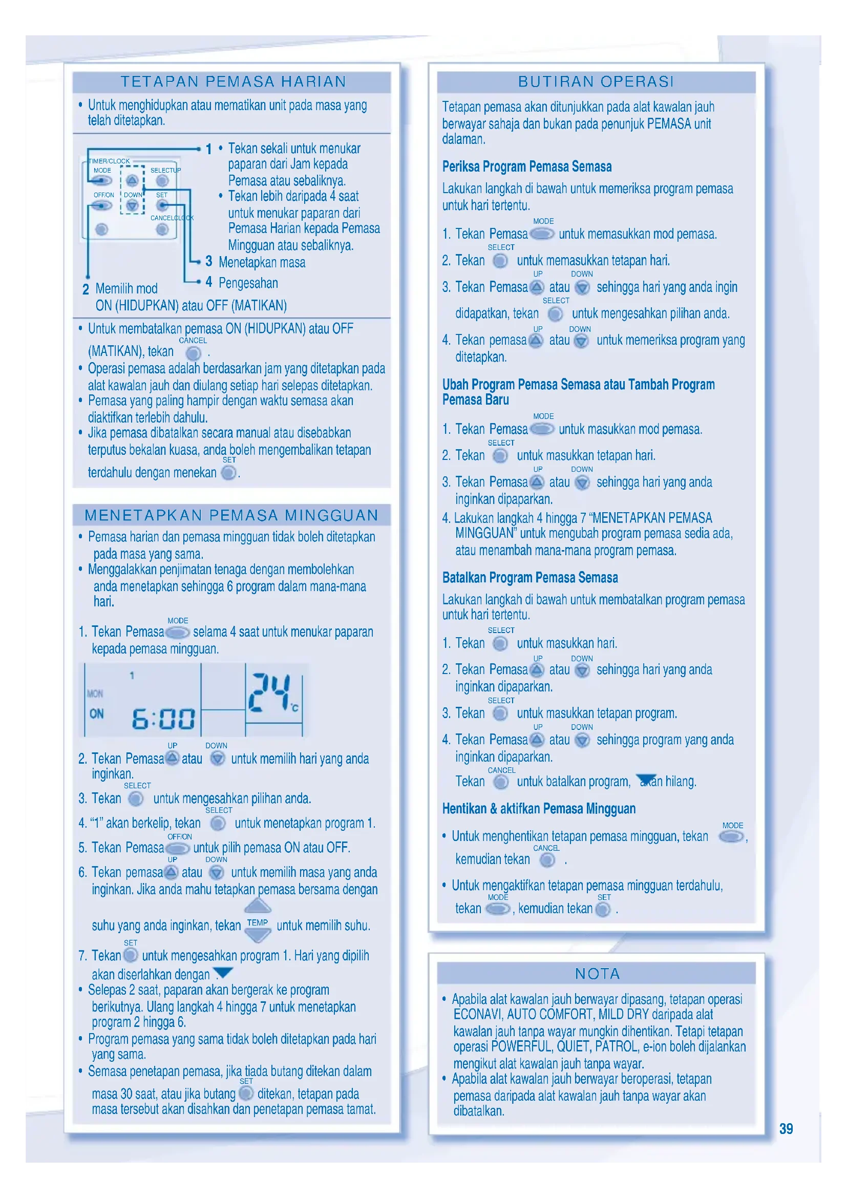 - Operasi pemasa adalah berdasarkan jam yang ditetapkan pada alat kawalan jauh dan diulang setiap hari selepas ditetapkan.