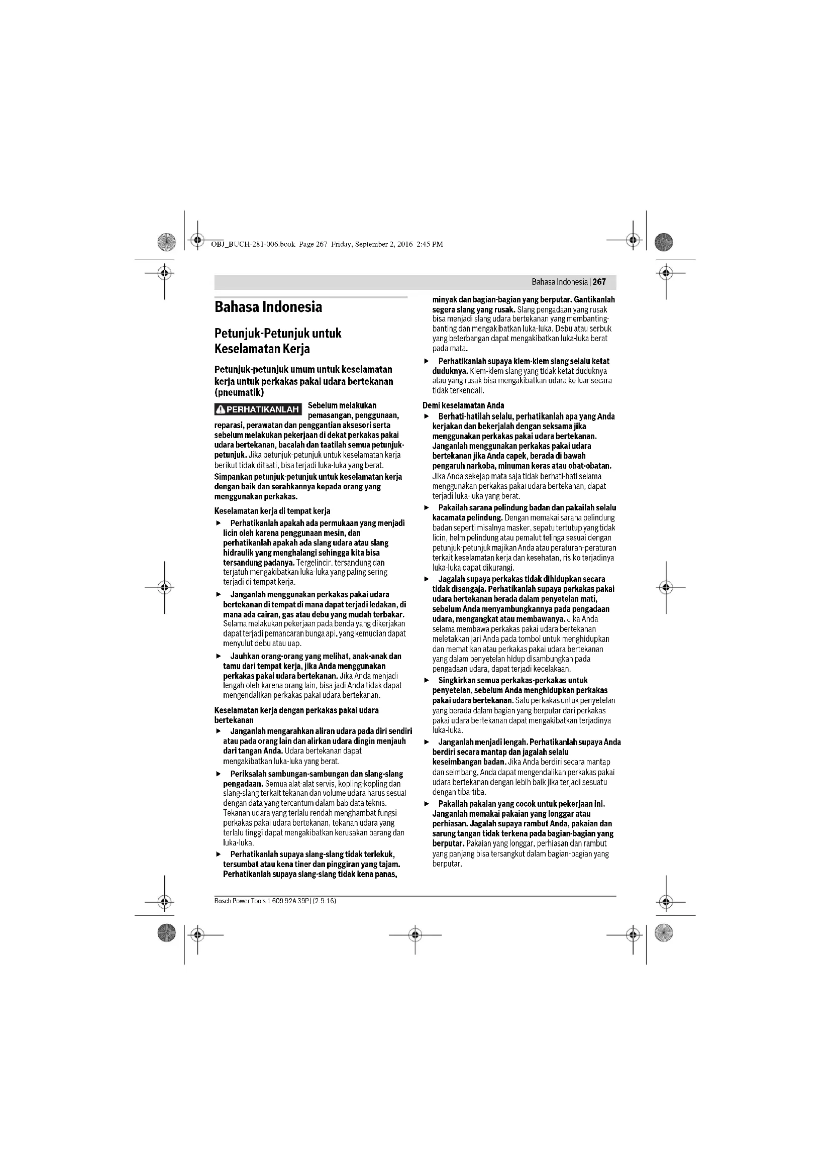 OBJ_BUCH-281-006.book Page 266 Friday, September 2, 2016 2:45 PMBahasa Indonesia | 267 Bosch Power Tools 1 609 92A 39P | (2.9.16) Bahasa Indonesia Petunjuk-Petunjuk untuk Keselamatan Kerja Petunjuk-petunjuk umum untuk keselamatan kerja untuk perkakas pakai udara bertekanan (pneumatik) Sebelum melakukan pemasangan, penggunaan, reparasi, perawatan dan penggantian aksesori serta sebelum melakukan pekerjaan di dekat perkakas pakai udara bertekanan, bacalah dan taatilah semua petunjuk- petunjuk. Jika petunjuk-petunjuk untuk keselamatan kerja berikut tidak ditaati, bisa terjadi luka-luka yang berat. Simpankan petunjuk-petunjuk untuk keselamatan kerja dengan baik dan serahkannya kepada orang yang menggunakan perkakas. Keselamatan kerja di tempat kerja Perhatikanlah apakah ada permukaan yang menjadi licin oleh karena penggunaan mesin, dan perhatikanlah apakah ada slang udara atau slang hidraulik yang menghalangi sehingga kita bisa tersandung padanya. Tergelincir, tersandung dan terjatuh mengakibatkan luka-luka yang paling sering terjadi di tempat kerja. Janganlah menggunakan perkakas pakai udara bertekanan di tempat di mana dapat terjadi ledakan, di mana ada cairan, gas atau debu yang mudah terbakar. Selama melakukan pekerjaan pada benda yang dikerjakan dapat terjadi pemancaran bunga api, yang kemudian dapat menyulut debu atau uap. Jauhkan orang-orang yang melihat, anak-anak dan tamu dari tempat kerja, jika Anda menggunakan perkakas pakai udara bertekanan. Jika Anda menjadi lengah oleh karena orang lain, bisa jadi Anda tidak dapat mengendalikan perkakas pakai udara bertekanan. Keselamatan kerja dengan perkakas pakai udara bertekanan Janganlah mengarahkan aliran udara pada diri sendiri atau pada orang lain dan alirkan udara dingin menjauh dari tangan Anda. Udara bertekanan dapat mengakibatkan luka-luka yang berat. Periksalah sambungan-sambungan dan slang-slang pengadaan. Semua alat-alat servis, kopling-kopling dan slang-slang terkait tekanan dan volume udara harus sesuai dengan data yang tercantum dalam bab data teknis. Tekanan udara yang terlalu rendah menghambat fungsi perkakas pakai udara bertekanan, tekanan udara yang terlalu tinggi dapat mengakibatkan kerusakan barang dan luka-luka. Perhatikanlah supaya slang-slang tidak terlekuk, tersumbat atau kena tiner dan pinggiran yang tajam. Perhatikanlah supaya slang-slang tidak kena panas, minyak dan bagian-bagian yang berputar. Gantikanlah segera slang yang rusak. Slang pengadaan yang rusak bisa menjadi slang udara bertekanan yang membanting- banting dan mengakibatkan luka-luka. Debu atau serbuk yang beterbangan dapat mengakibatkan luka-luka berat pada mata. Perhatikanlah supaya klem-klem slang selalu ketat duduknya. Klem-klem slang yang tidak ketat duduknya atau yang rusak bisa mengakibatkan udara ke luar secara tidak terkendali. Demi keselamatan Anda Berhati-hatilah selalu, perhatikanlah apa yang Anda kerjakan dan bekerjalah dengan seksama jika menggunakan perkakas pakai udara bertekanan. Janganlah menggunakan perkakas pakai udara bertekanan jika Anda capek, berada di bawah pengaruh narkoba, minuman keras atau obat-obatan. Jika Anda sekejap mata saja tidak berhati-hati selama menggunakan perkakas pakai udara bertekanan, dapat terjadi luka-luka yang berat. Pakailah sarana pelindung badan dan pakailah selalu kacamata pelindung. Dengan memakai sarana pelindung badan seperti misalnya masker, sepatu tertutup yang tidak licin, helm pelindung atau pemalut telinga sesuai dengan petunjuk-petunjuk majikan Anda atau peraturan-peraturan terkait keselamatan kerja dan kesehatan, risiko terjadinya luka-luka dapat dikurangi. Jagalah supaya perkakas tidak dihidupkan secara tidak disengaja. Perhatikanlah supaya perkakas pakai udara bertekanan berada dalam penyetelan mati, sebelum Anda menyambungkannya pada pengadaan udara, mengangkat atau membawanya. Jika Anda selama membawa perkakas pakai udara bertekanan meletakkan jari Anda pada tombol untuk menghidupkan dan mematikan atau perkakas pakai udara bertekanan yang dalam penyetelan hidup disambungkan pada pengadaan udara, dapat terjadi kecelakaan. Singkirkan semua perkakas-perkakas untuk penyetelan, sebelum Anda menghidupkan perkakas pakai udara bertekanan. Satu perkakas untuk penyetelan yang berada dalam bagian yang berputar dari perkakas pakai udara bertekanan dapat mengakibatkan terjadinya luka-luka. Janganlah menjadi lengah. Perhatikanlah supaya Anda berdiri secara mantap dan jagalah selalu keseimbangan badan. Jika Anda berdiri secara mantap dan seimbang, Anda dapat mengendalikan perkakas pakai udara bertekanan dengan lebih baik jika terjadi sesuatu dengan tiba-tiba. Pakailah pakaian yang cocok untuk pekerjaan ini. Janganlah memakai pakaian yang longgar atau perhiasan. Jagalah supaya rambut Anda, pakaian dan sarung tangan tidak terkena pada bagian-bagian yang berputar. Pakaian yang longgar, perhiasan dan rambut yang panjang bisa tersangkut dalam bagian-bagian yang berputar. PERHATIKANLAH OBJ_BUCH-281-006.book Page 267 Friday, September 2, 2016 2:45 PM268 | Bahasa Indonesia 1 609 92A 39P | (2.9.16) Bosch Power Tools Janganlah menghirup udara eksaust secara langsung. Jagalah supaya udara eksaust tidak terkena pada mata. Udara eksaust dari perkakas pakai udara bertekanan bisa jadi mengandung air, minyak, partikel logam atau pencemaran yang berasal dari kompresor. Bahan-bahan ini dapat berbahaya bagi kesehatan. Penanganan dan penggunaan perkakas pakai udara bertekanan dengan seksama Gunakanlah alat pemegang atau bais untuk memegang atau menopang benda yang dikerjakan. Jika Anda memegang benda yang dikerjakan dengan tangan atau menekannya pada badan Anda, Anda tidak dapat menjalankan perkakas pakai udara bertekanan dengan betul. Janganlah membebankan perkakas pakai udara bertekanan terlalu berat. Gunakanlah perkakas pakai udara bertekanan yang cocok dengan pekerjaan yang dilakukan. Dengan perkakas pakai udara bertekanan yang cocok Anda bekerja dengan lebih baik dan lebih aman dalam batas-batas kemampuan yang ditentuka