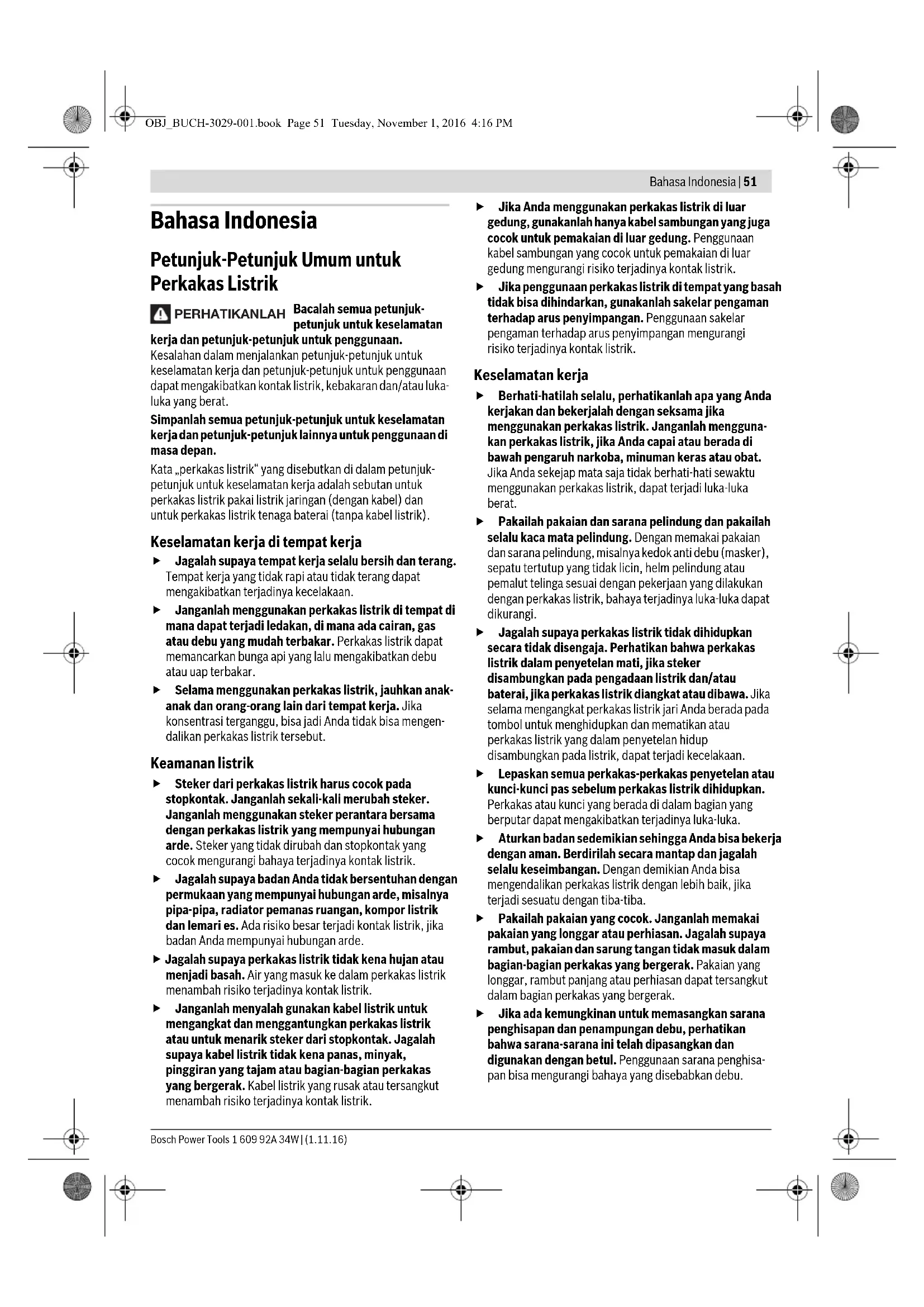 OBJ_BUCH-3029-001.book Page 50 Tuesday, November 1, 2016 4:16 PMBahasa Indonesia | 51 Bosch Power Tools 1 609 92A 34W | (1.11.16) Bahasa Indonesia Petunjuk-Petunjuk Umum untuk Perkakas Listrik Bacalah semua petunjuk- petunjuk untuk keselamatan kerja dan petunjuk-petunjuk untuk penggunaan. Kesalahan dalam menjalankan petunjuk-petunjuk untuk keselamatan kerja dan petunjuk-petunjuk untuk penggunaan dapat mengakibatkan kontak listrik, kebakaran dan/atau luka- luka yang berat. Simpanlah semua petunjuk-petunjuk untuk keselamatan kerja dan petunjuk-petunjuk lainnya untuk penggunaan di masa depan. Kata „perkakas listrik“ yang disebutkan di dalam petunjuk- petunjuk untuk keselamatan kerja adalah sebutan untuk perkakas listrik pakai listrik jaringan (dengan kabel) dan untuk perkakas listrik tenaga baterai (tanpa kabel listrik). Keselamatan kerja di tempat kerja Jagalah supaya tempat kerja selalu bersih dan terang. Tempat kerja yang tidak rapi atau tidak terang dapat mengakibatkan terjadinya kecelakaan. Janganlah menggunakan perkakas listrik di tempat di mana dapat terjadi ledakan, di mana ada cairan, gas atau debu yang mudah terbakar. Perkakas listrik dapat memancarkan bunga api yang lalu mengakibatkan debu atau uap terbakar. Selama menggunakan perkakas listrik, jauhkan anak- anak dan orang-orang lain dari tempat kerja. Jika konsentrasi terganggu, bisa jadi Anda tidak bisa mengen- dalikan perkakas listrik tersebut. Keamanan listrik Steker dari perkakas listrik harus cocok pada stopkontak. Janganlah sekali-kali merubah steker. Janganlah menggunakan steker perantara bersama dengan perkakas listrik yang mempunyai hubungan arde. Steker yang tidak dirubah dan stopkontak yang cocok mengurangi bahaya terjadinya kontak listrik. Jagalah supaya badan Anda tidak bersentuhan dengan permukaan yang mempunyai hubungan arde, misalnya pipa-pipa, radiator pemanas ruangan, kompor listrik dan lemari es. Ada risiko besar terjadi kontak listrik, jika badan Anda mempunyai hubungan arde. Jagalah supaya perkakas listrik tidak kena hujan atau menjadi basah. Air yang masuk ke dalam perkakas listrik menambah risiko terjadinya kontak listrik. Janganlah menyalah gunakan kabel listrik untuk mengangkat dan menggantungkan perkakas listrik atau untuk menarik steker dari stopkontak. Jagalah supaya kabel listrik tidak kena panas, minyak, pinggiran yang tajam atau bagian-bagian perkakas yang bergerak. Kabel listrik yang rusak atau tersangkut menambah risiko terjadinya kontak listrik. Jika Anda menggunakan perkakas listrik di luar gedung, gunakanlah hanya kabel sambungan yang juga cocok untuk pemakaian di luar gedung. Penggunaan kabel sambungan yang cocok untuk pemakaian di luar gedung mengurangi risiko terjadinya kontak listrik. Jika penggunaan perkakas listrik di tempat yang basah tidak bisa dihindarkan, gunakanlah sakelar pengaman terhadap arus penyimpangan. Penggunaan sakelar pengaman terhadap arus penyimpangan mengurangi risiko terjadinya kontak listrik. Keselamatan kerja Berhati-hatilah selalu, perhatikanlah apa yang Anda kerjakan dan bekerjalah dengan seksama jika menggunakan perkakas listrik. Janganlah mengguna- kan perkakas listrik, jika Anda capai atau berada di bawah pengaruh narkoba, minuman keras atau obat. Jika Anda sekejap mata saja tidak berhati-hati sewaktu menggunakan perkakas listrik, dapat terjadi luka-luka berat. Pakailah pakaian dan sarana pelindung dan pakailah selalu kaca mata pelindung. Dengan memakai pakaian dan sarana pelindung, misalnya kedok anti debu (masker), sepatu tertutup yang tidak licin, helm pelindung atau pemalut telinga sesuai dengan pekerjaan yang dilakukan dengan perkakas listrik, bahaya terjadinya luka-luka dapat dikurangi. Jagalah supaya perkakas listrik tidak dihidupkan secara tidak disengaja. Perhatikan bahwa perkakas listrik dalam penyetelan mati, jika steker disambungkan pada pengadaan listrik dan/atau baterai, jika perkakas listrik diangkat atau dibawa. Jika selama mengangkat perkakas listrik jari Anda berada pada tombol untuk menghidupkan dan mematikan atau perkakas listrik yang dalam penyetelan hidup disambungkan pada listrik, dapat terjadi kecelakaan. Lepaskan semua perkakas-perkakas penyetelan atau kunci-kunci pas sebelum perkakas listrik dihidupkan. Perkakas atau kunci yang berada di dalam bagian yang berputar dapat mengakibatkan terjadinya luka-luka. Aturkan badan sedemikian sehingga Anda bisa bekerja dengan aman. Berdirilah secara mantap dan jagalah selalu keseimbangan. Dengan demikian Anda bisa mengendalikan perkakas listrik dengan lebih baik, jika terjadi sesuatu dengan tiba-tiba. Pakailah pakaian yang cocok. Janganlah memakai pakaian yang longgar atau perhiasan. Jagalah supaya rambut, pakaian dan sarung tangan tidak masuk dalam bagian-bagian perkakas yang bergerak. Pakaian yang longgar, rambut panjang atau perhiasan dapat tersangkut dalam bagian perkakas yang bergerak. Jika ada kemungkinan untuk memasangkan sarana penghisapan dan penampungan debu, perhatikan bahwa sarana-sarana ini telah dipasangkan dan digunakan dengan betul. Penggunaan sarana penghisa- pan bisa mengurangi bahaya yang disebabkan debu. PERHATIKANLAH OBJ_BUCH-3029-001.book Page 51 Tuesday, November 1, 2016 4:16 PM52 | Bahasa Indonesia 1 609 92A 34W | (1.11.16) Bosch Power Tools Penggunaan dan penanganan perkakas listrik de- ngan seksama Janganlah membebankan perkakas listrik terlalu berat. Gunakan selalu perkakas listrik yang cocok untuk pekerjaan yang dilakukan. Dengan perkakas listrik yang cocok Anda bekerja lebih baik dan lebih aman dalam batas-batas kemampuan yang ditentukan. Janganlah menggunakan perkakas listrik yang tombolnya rusak. Perkakas listrik yang tidak bisa dihidupkan atau dimatikan, berbahaya dan harus direparasikan. Tariklah steker dari stopkontak dan/atau keluarkan baterai, sebelum Anda melakukan penyetelan pada perkakas listrik, mengganti alat-alat kerja atau sebelum menyimpan perkakas listrik. Tindakan keselamatan kerja ini mengurangi bahaya perkakas listrik hidup secara tidak disengaja. 