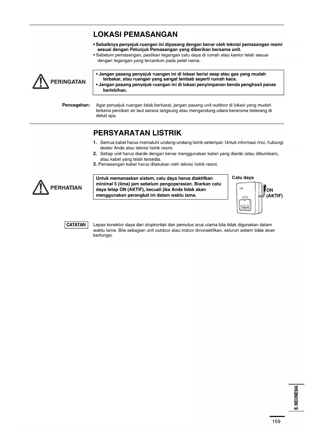 - Jangan pasang penyejuk ruangan ini di lokasi penyimpanan benda penghasil panas berlebihan. Pencegahan: Agar penyejuk ruangan tidak berkarat, jangan pasang unit outdoor di lokasi yang mudah terkena percikan air laut secara langsung atau mengandung udara beraroma belerang di dekat spa. Untuk memanaskan sistem, catu daya harus diaktifkan minimal 5 (lima) jam sebelum pengoperasian. Biarkan catu daya tetap ON (AKTIF), kecuali jika Anda tidak akan menggunakan perangkat ini dalam waktu lama. Lepas konektor daya dari stopkontak dan pemutus arus utama bila tidak digunakan dalam waktu lama. Bila sebagian unit outdoor atau indoor dinonaktifkan, seluruh sistem tidak akan berfungsi.