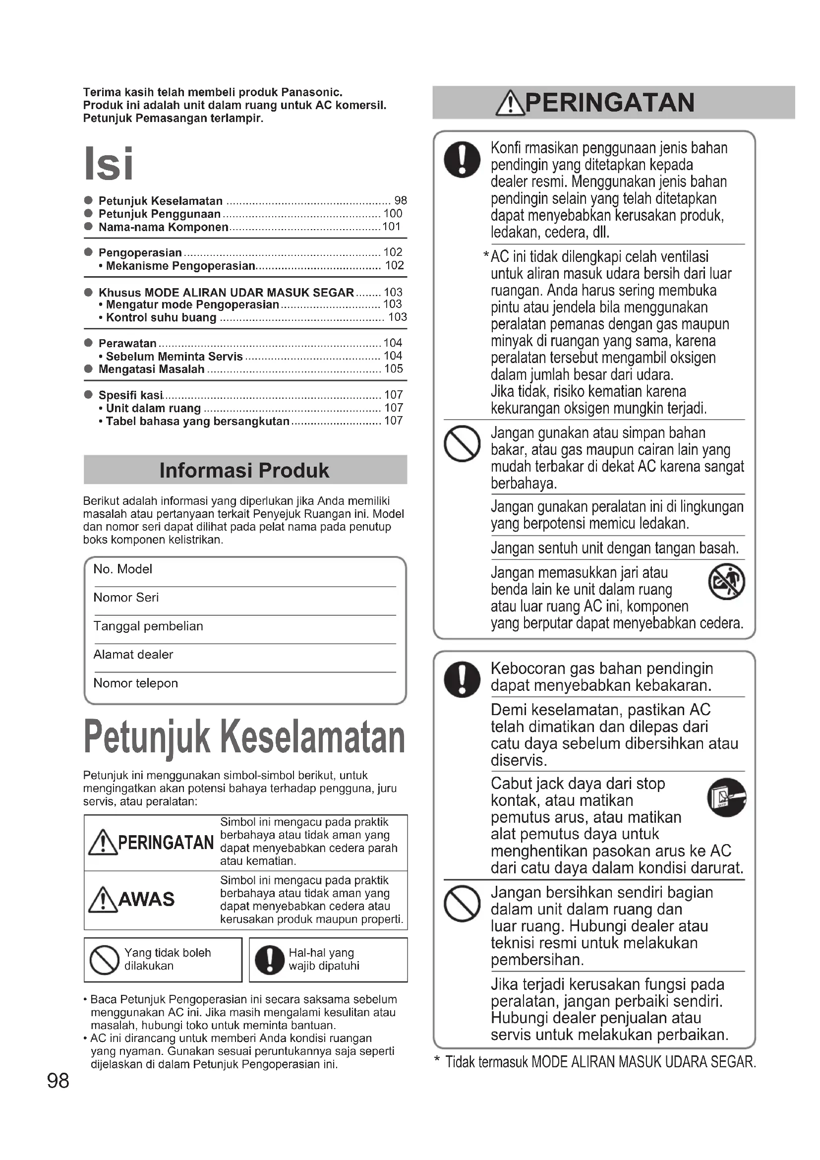 - • Tabel bahasa yang bersangkutan Isi Petunjuk Keselamatan Informasi Produk Berikut adalah informasi yang diperlukan jika Anda memiliki masalah atau pertanyaan terkait Penyejuk Ruangan ini. Model dan nomor seri dapat dilihat pada pelat nama pada penutup boks komponen kelistrikan.No. ModelNomor SeriTanggal pembelianAlamat dealerNomor telepon Konfi rmasikan penggunaan jenis bahan pendingin yang ditetapkan kepada dealer resmi. Menggunakan jenis bahan pendingin selain yang telah ditetapkan dapat menyebabkan kerusakan produk, ledakan, cedera, dll. AC ini tidak dilengkapi celah ventilasi untuk aliran masuk udara bersih dari luar ruangan. Anda harus sering membuka pintu atau jendela bila menggunakan peralatan pemanas dengan gas maupun minyak di ruangan yang sama, karena peralatan tersebut mengambil oksigen dalam jumlah besar dari udara. Jika tidak, risiko kematian karena kekurangan oksigen mungkin terjadi. Jangan gunakan atau simpan bahan bakar, atau gas maupun cairan lain yang mudah terbakar di dekat AC karena sangat berbahaya. Jangan gunakan peralatan ini di lingkungan yang berpotensi memicu ledakan. Jangan sentuh unit dengan tangan basah. Jangan memasukkan jari atau benda lain ke unit dalam ruang atau luar ruang AC ini, komponen yang berputar dapat menyebabkan cedera. Kebocoran gas bahan pendingin dapat menyebabkan kebakaran. Demi keselamatan, pastikan AC telah dimatikan dan dilepas dari catu daya sebelum dibersihkan atau diservis. Cabut jack daya dari stop kontak, atau matikan pemutus arus, atau matikan alat pemutus daya untuk menghentikan pasokan arus ke AC dari catu daya dalam kondisi darurat. Jangan bersihkan sendiri bagian dalam unit dalam ruang dan luar ruang. Hubungi dealer atau teknisi resmi untuk melakukan pembersihan. Jika terjadi kerusakan fungsi pada peralatan, jangan perbaiki sendiri. Hubungi dealer penjualan atau servis untuk melakukan perbaikan. Petunjuk ini menggunakan simbol-simbol berikut, untuk mengingatkan akan potensi bahaya terhadap pengguna, juru servis, atau peralatan: PERINGATAN Simbol ini mengacu pada praktik berbahaya atau tidak aman yang dapat menyebabkan cedera parah atau kematian. AWAS Simbol ini mengacu pada praktik berbahaya atau tidak aman yang dapat menyebabkan cedera atau kerusakan produk maupun properti.Yang tidak boleh dilakukanHal-hal yang wajib dipatuhiTerima kasih telah membeli produk Panasonic.Produk ini adalah unit dalam ruang untuk AC komersil.Petunjuk Pemasangan terlampir.• Baca Petunjuk Pengoperasian ini secara saksama sebelum menggunakan AC ini. Jika masih mengalami kesulitan atau masalah, hubungi toko untuk meminta bantuan.• AC ini dirancang untuk memberi Anda kondisi ruangan yang nyaman. Gunakan sesuai peruntukannya saja seperti dijelaskan di dalam Petunjuk Pengoperasian ini. PERINGATAN p. 107