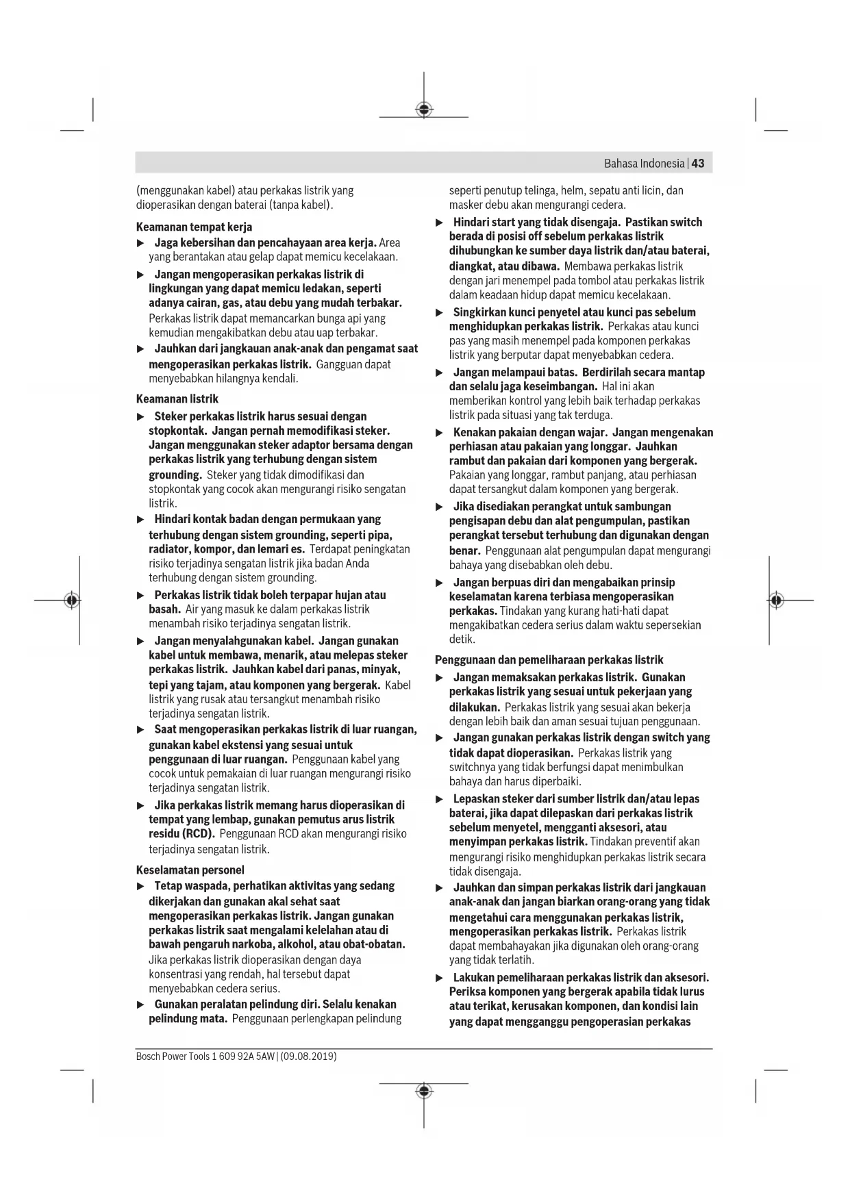 แบตเตอรี่แพ็ค/แบตเตอรี่: ลิเธียม ไอออน: กรุณาปฏิบัติตามคำแนะนำในบทการขนส่ง (ดู "การขนส่ง", หน้า42) Bahasa Indonesia Petunjuk Keselamatan Petunjuk keselamatan umum untuk perkakas listrik PERINGATAN Baca semua peringatan, petunjuk, ilustrasi, dan spesifikasi keselamatan yang diberikan bersama perkakas listrik ini. Kesalahan dalam menjalankan petunjuk di bawah ini dapat mengakibatkan sengatan listrik, kebakaran, dan/atau cedera serius. Simpanlah semua peringatan dan petunjuk untuk penggunaan di masa mendatang. Istilah "perkakas listrik" dalam peringatan mengacu pada perkakas listrik yang dioperasikan dengan listrik 1 609 92A 5AW | (09.08.2019) Bosch Power ToolsBahasa Indonesia | 43 (menggunakan kabel) atau perkakas listrik yang dioperasikan dengan baterai (tanpa kabel). Keamanan tempat kerja u Jaga kebersihan dan pencahayaan area kerja. Area yang berantakan atau gelap dapat memicu kecelakaan. u Jangan mengoperasikan perkakas listrik di lingkungan yang dapat memicu ledakan, seperti adanya cairan, gas, atau debu yang mudah terbakar. Perkakas listrik dapat memancarkan bunga api yang kemudian mengakibatkan debu atau uap terbakar. u Jauhkan dari jangkauan anak-anak dan pengamat saat mengoperasikan perkakas listrik. Gangguan dapat menyebabkan hilangnya kendali. Keamanan listrik u Steker perkakas listrik harus sesuai dengan stopkontak. Jangan pernah memodifikasi steker. Jangan menggunakan steker adaptor bersama dengan perkakas listrik yang terhubung dengan sistem grounding. Steker yang tidak dimodifikasi dan stopkontak yang cocok akan mengurangi risiko sengatan listrik. u Hindari kontak badan dengan permukaan yang terhubung dengan sistem grounding, seperti pipa, radiator, kompor, dan lemari es. Terdapat peningkatan risiko terjadinya sengatan listrik jika badan Anda terhubung dengan sistem grounding. u Perkakas listrik tidak boleh terpapar hujan atau basah. Air yang masuk ke dalam perkakas listrik menambah risiko terjadinya sengatan listrik. u Jangan menyalahgunakan kabel. Jangan gunakan kabel untuk membawa, menarik, atau melepas steker perkakas listrik. Jauhkan kabel dari panas, minyak, tepi yang tajam, atau komponen yang bergerak. Kabel listrik yang rusak atau tersangkut menambah risiko terjadinya sengatan listrik. u Saat mengoperasikan perkakas listrik di luar ruangan, gunakan kabel ekstensi yang sesuai untuk penggunaan di luar ruangan. Penggunaan kabel yang cocok untuk pemakaian di luar ruangan mengurangi risiko terjadinya sengatan listrik. u Jika perkakas listrik memang harus dioperasikan di tempat yang lembap, gunakan pemutus arus listrik residu (RCD). Penggunaan RCD akan mengurangi risiko terjadinya sengatan listrik. Keselamatan personel u Tetap waspada, perhatikan aktivitas yang sedang dikerjakan dan gunakan akal sehat saat mengoperasikan perkakas listrik. Jangan gunakan perkakas listrik saat mengalami kelelahan atau di bawah pengaruh narkoba, alkohol, atau obat-obatan. Jika perkakas listrik dioperasikan dengan daya konsentrasi yang rendah, hal tersebut dapat menyebabkan cedera serius. u Gunakan peralatan pelindung diri. Selalu kenakan pelindung mata. Penggunaan perlengkapan pelindung seperti penutup telinga, helm, sepatu anti licin, dan masker debu akan mengurangi cedera. u Hindari start yang tidak disengaja. Pastikan switch berada di posisi off sebelum perkakas listrik dihubungkan ke sumber daya listrik dan/atau baterai, diangkat, atau dibawa. Membawa perkakas listrik dengan jari menempel pada tombol atau perkakas listrik dalam keadaan hidup dapat memicu kecelakaan. u Singkirkan kunci penyetel atau kunci pas sebelum menghidupkan perkakas listrik. Perkakas atau kunci pas yang masih menempel pada komponen perkakas listrik yang berputar dapat menyebabkan cedera. u Jangan melampaui batas. Berdirilah secara mantap dan selalu jaga keseimbangan. Hal ini akan memberikan kontrol yang lebih baik terhadap perkakas listrik pada situasi yang tak terduga. u Kenakan pakaian dengan wajar. Jangan mengenakan perhiasan atau pakaian yang longgar. Jauhkan rambut dan pakaian dari komponen yang bergerak. Pakaian yang longgar, rambut panjang, atau perhiasan dapat tersangkut dalam komponen yang bergerak. u Jika disediakan perangkat untuk sambungan pengisapan debu dan alat pengumpulan, pastikan perangkat tersebut terhubung dan digunakan dengan benar. Penggunaan alat pengumpulan dapat mengurangi bahaya yang disebabkan oleh debu. u Jangan berpuas diri dan mengabaikan prinsip keselamatan karena terbiasa mengoperasikan perkakas. Tindakan yang kurang hati-hati dapat mengakibatkan cedera serius dalam waktu sepersekian detik. Penggunaan dan pemeliharaan perkakas listrik u Jangan memaksakan perkakas listrik. Gunakan perkakas listrik yang sesuai untuk pekerjaan yang dilakukan. Perkakas listrik yang sesuai akan bekerja dengan lebih baik dan aman sesuai tujuan penggunaan. u Jangan gunakan perkakas listrik dengan switch yang tidak dapat dioperasikan. Perkakas listrik yang switchnya yang tidak berfungsi dapat menimbulkan bahaya dan harus diperbaiki. u Lepaskan steker dari sumber listrik dan/atau lepas baterai, jika dapat dilepaskan dari perkakas listrik sebelum menyetel, mengganti aksesori, atau menyimpan perkakas listrik. Tindakan preventif akan mengurangi risiko menghidupkan perkakas listrik secara tidak disengaja. u Jauhkan dan simpan perkakas listrik dari jangkauan anak-anak dan jangan biarkan orang-orang yang tidak mengetahui cara menggunakan perkakas listrik, mengoperasikan perkakas listrik. Perkakas listrik dapat membahayakan jika digunakan oleh orang-orang yang tidak terlatih. u Lakukan pemeliharaan perkakas listrik dan aksesori. Periksa komponen yang bergerak apabila tidak lurus atau terikat, kerusakan komponen, dan kondisi lain yang dapat mengganggu pengoperasian perkakas Bosch Power Tools 1 609 92A 5AW | (09.08.2019)44 | Bahasa Indonesia listrik. Apabila 