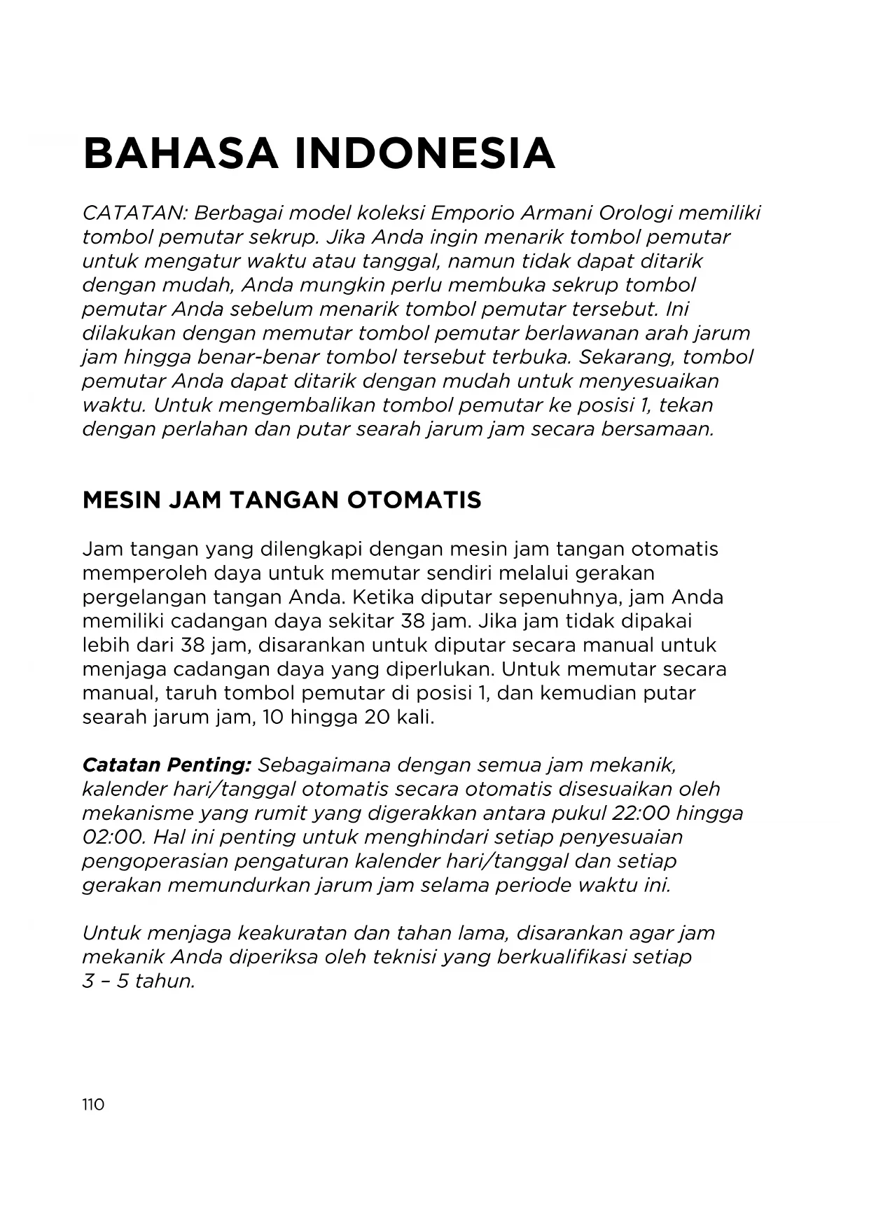- 長期間良好な状態でご使用いただくために、一年または二年に一度、腕時計を 点検に出すことをお勧めします。110 BAHASA INDONESIA CATATAN: Berbagai model koleksi Emporio Armani Orologi memiliki tombol pemutar sekrup. Jika Anda ingin menarik tombol pemutar untuk mengatur waktu atau tanggal, namun tidak dapat ditarik dengan mudah, Anda mungkin perlu membuka sekrup tombol pemutar Anda sebelum menarik tombol pemutar tersebut. Ini dilakukan dengan memutar tombol pemutar berlawanan arah jarum jam hingga benar-benar tombol tersebut terbuka. Sekarang, tombol pemutar Anda dapat ditarik dengan mudah untuk menyesuaikan waktu. Untuk mengembalikan tombol pemutar ke posisi 1, tekan dengan perlahan dan putar searah jarum jam secara bersamaan.